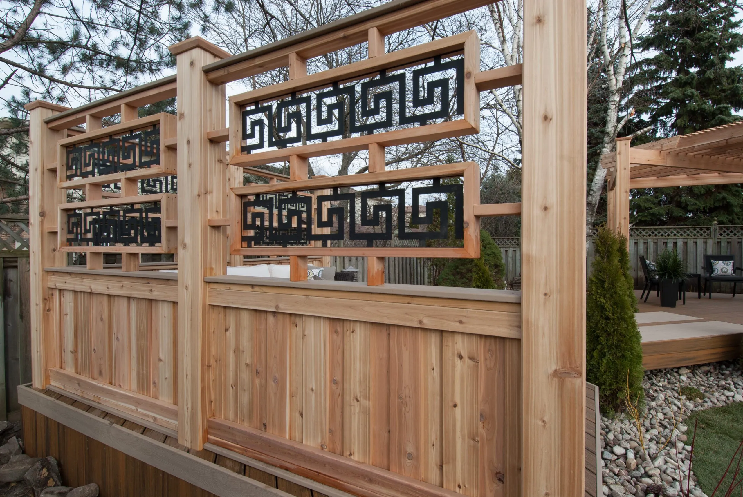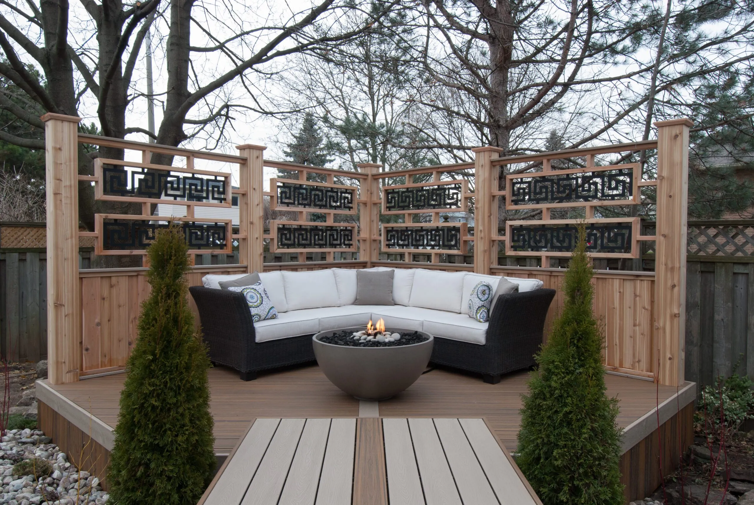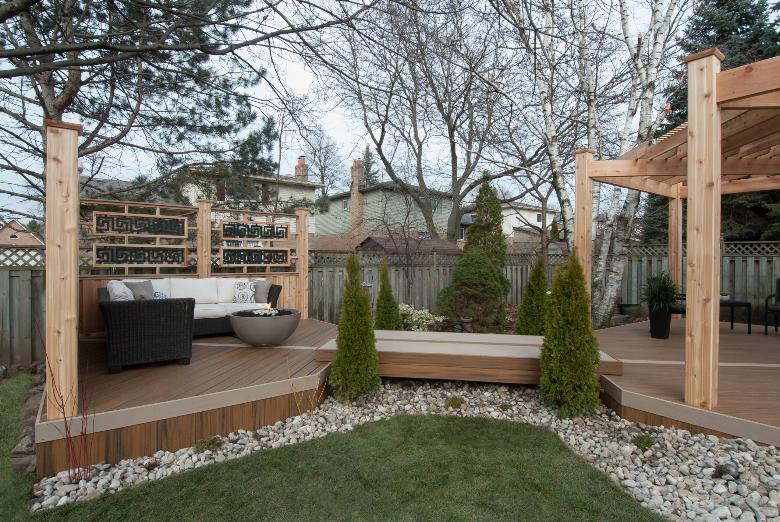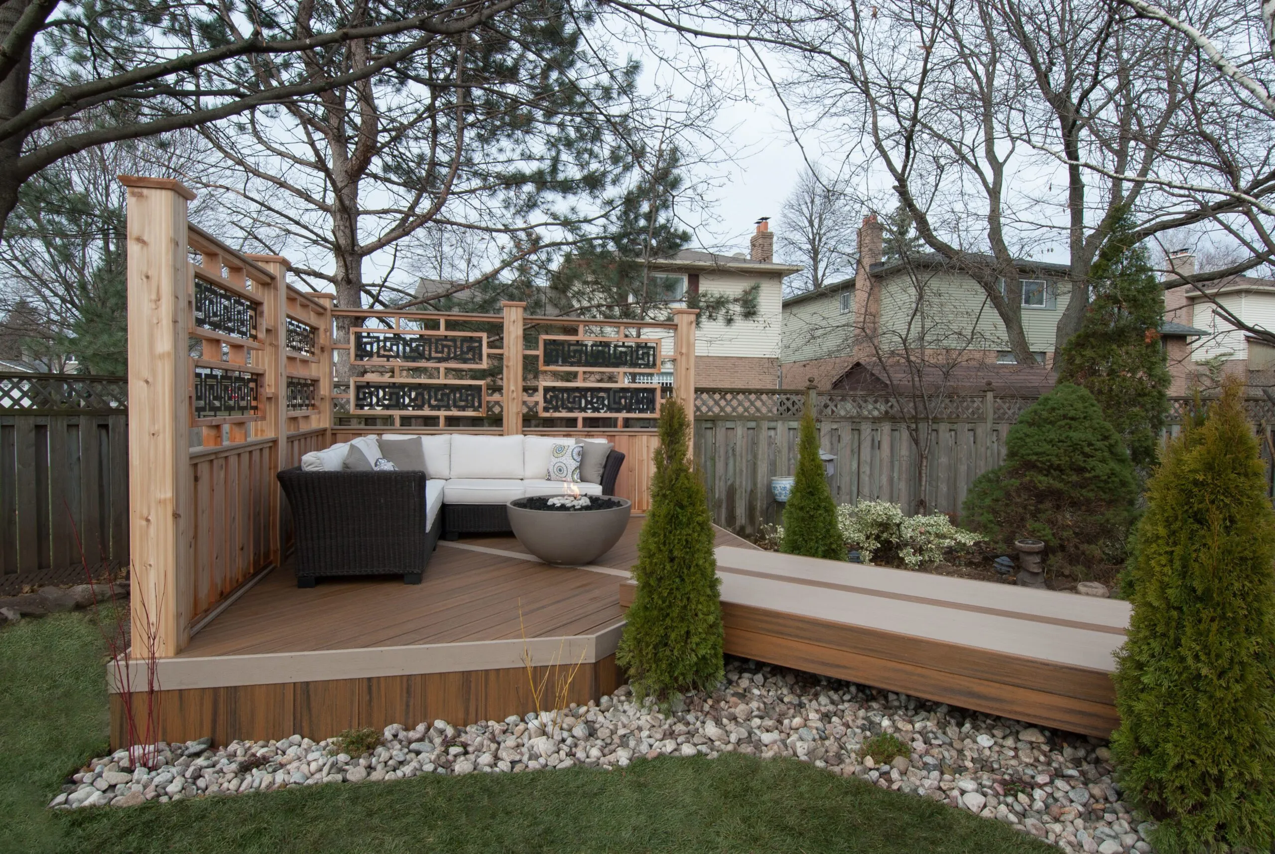 For this project, we set out to design a deck that felt less like a backyard addition and more like an experience. The curved boardwalk-style entry gives the whole space a sense of flow and arrival—like you're stepping into a retreat. We incorporated a custom pergola with intricate metal privacy screens, which filter light beautifully and offer just the right amount of enclosure. A central fire bowl, flanked by cozy built-in seating and accent planters, turns the space into a perfect gathering spot at dusk. This deck is about more than function—it's about emotional connection. From the gentle curvature of the walkways to the quiet nooks for conversation, every detail was chosen to invite pause, presence, and peace. It’s one of our favourite examples of how outdoor living can be both grounded and transformative.