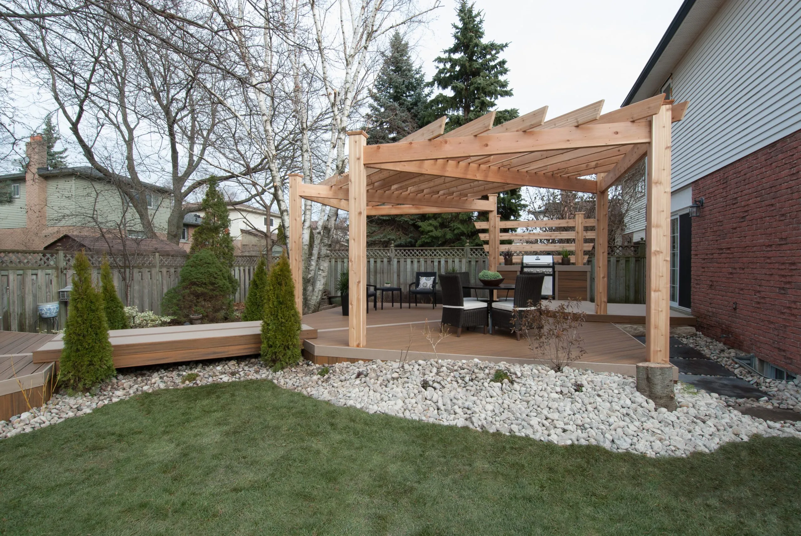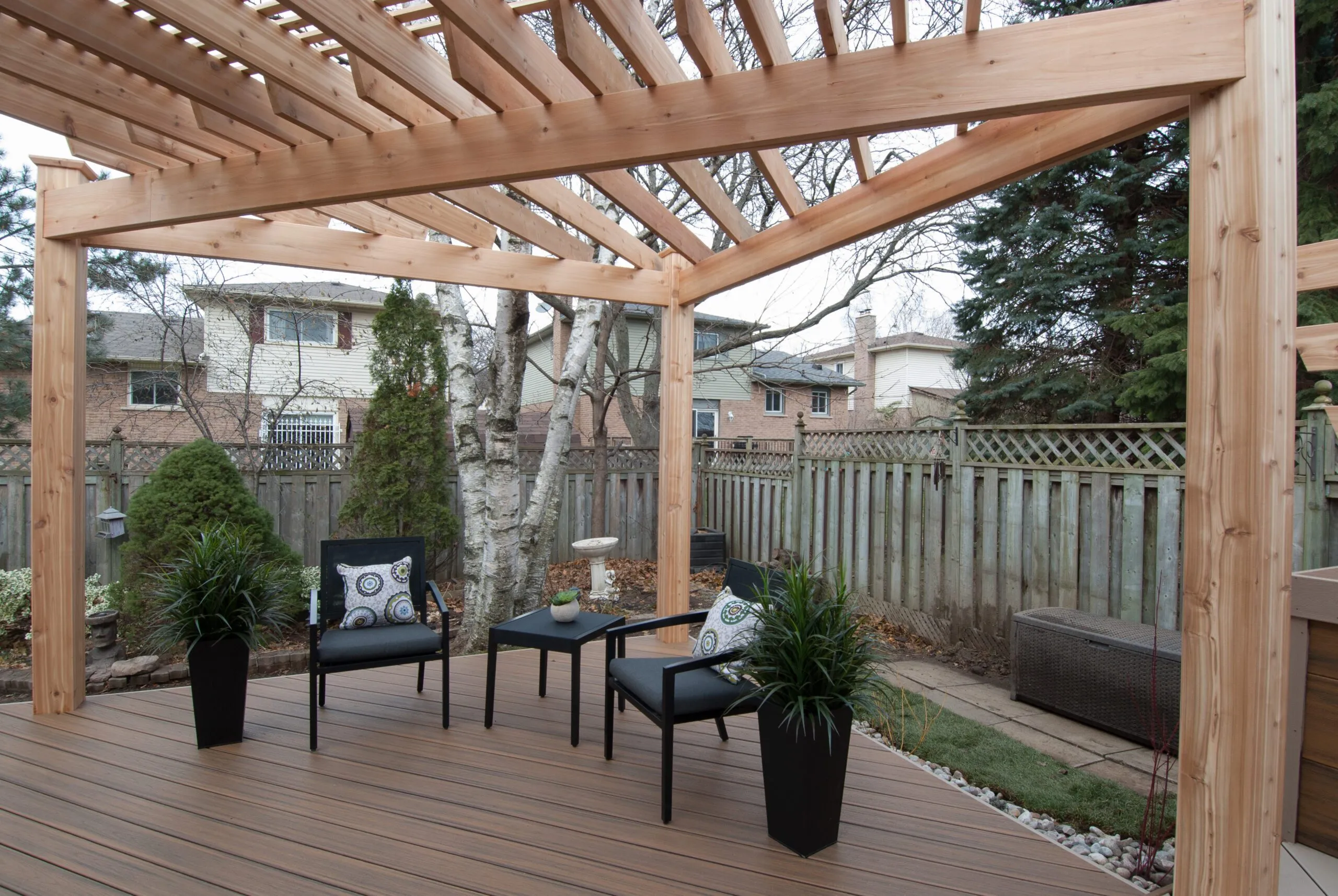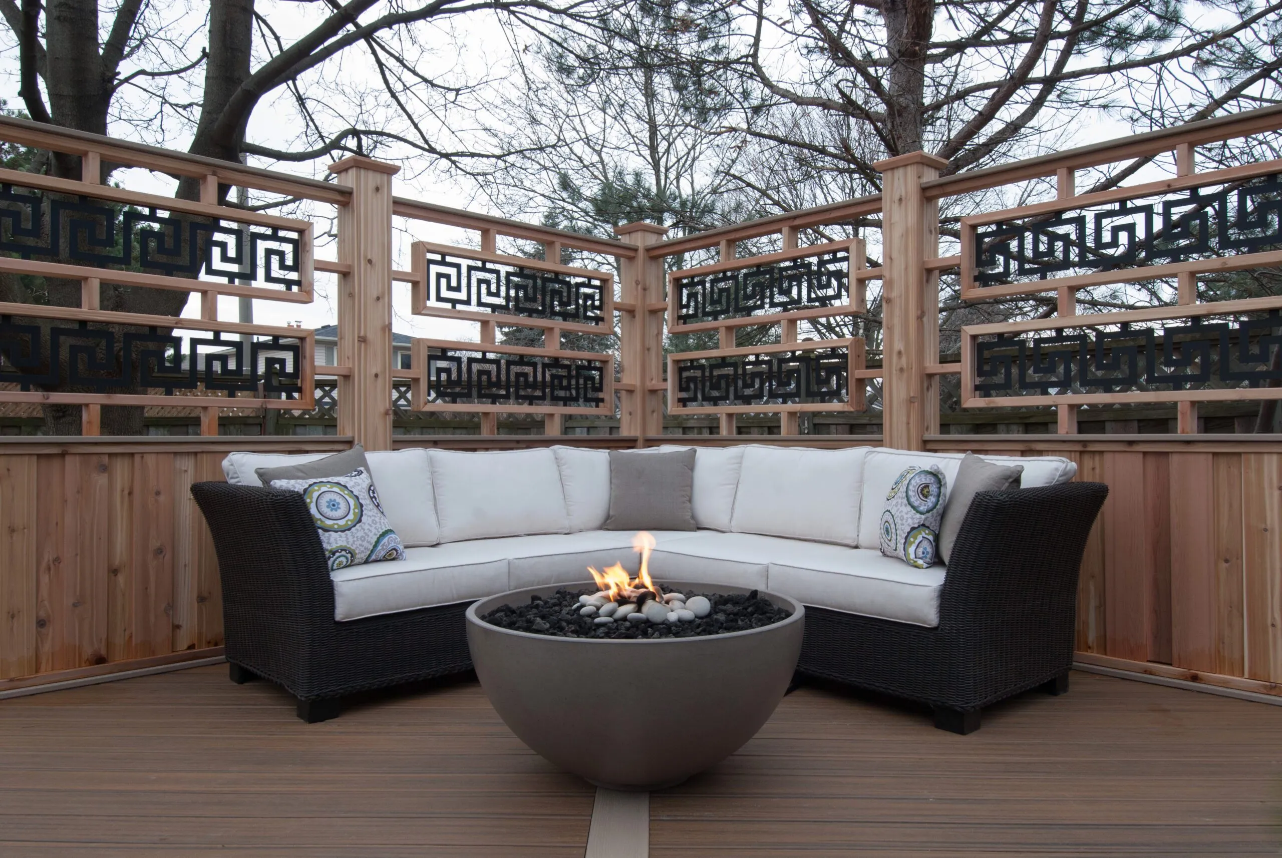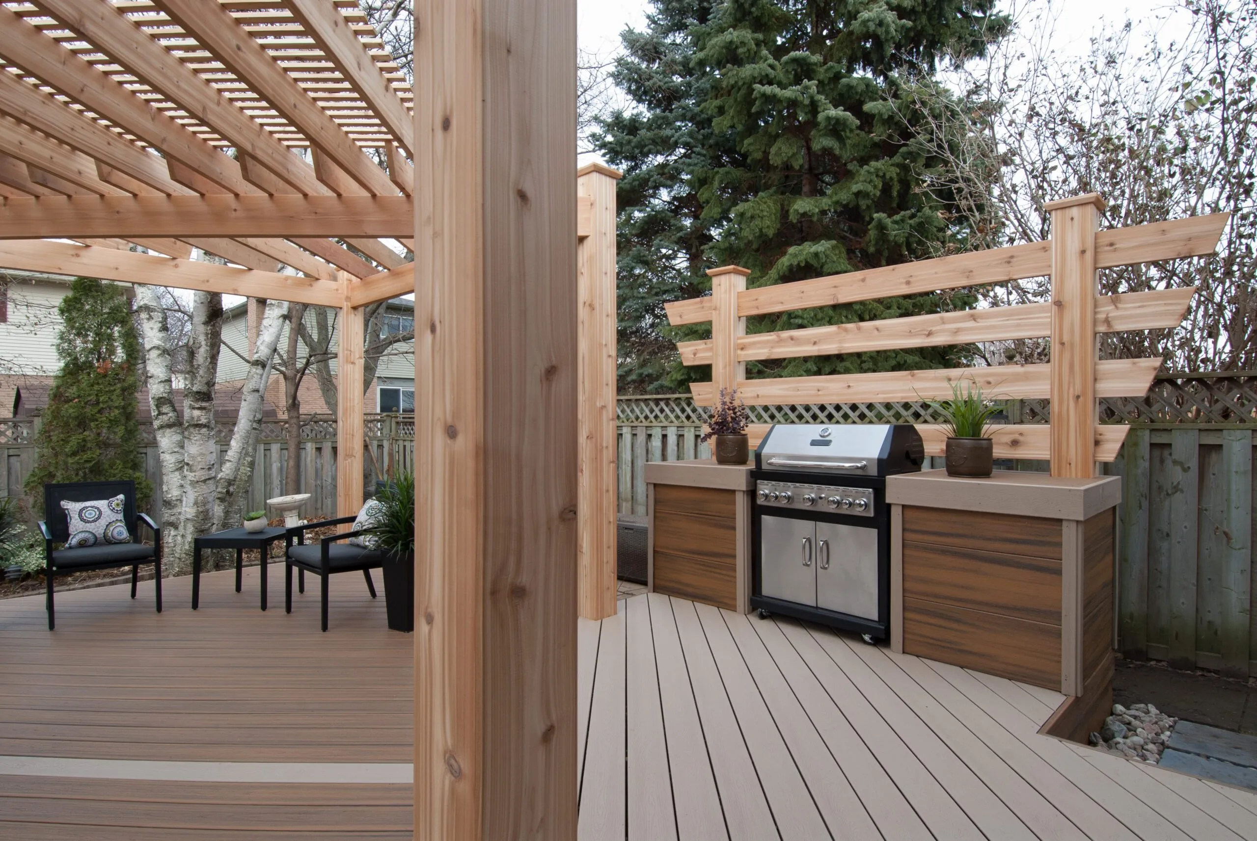 For this project, we set out to design a deck that felt less like a backyard addition and more like an experience. The curved boardwalk-style entry gives the whole space a sense of flow and arrival—like you're stepping into a retreat. We incorporated a custom pergola with intricate metal privacy screens, which filter light beautifully and offer just the right amount of enclosure. A central fire bowl, flanked by cozy built-in seating and accent planters, turns the space into a perfect gathering spot at dusk. This deck is about more than function—it's about emotional connection. From the gentle curvature of the walkways to the quiet nooks for conversation, every detail was chosen to invite pause, presence, and peace. It’s one of our favourite examples of how outdoor living can be both grounded and transformative.