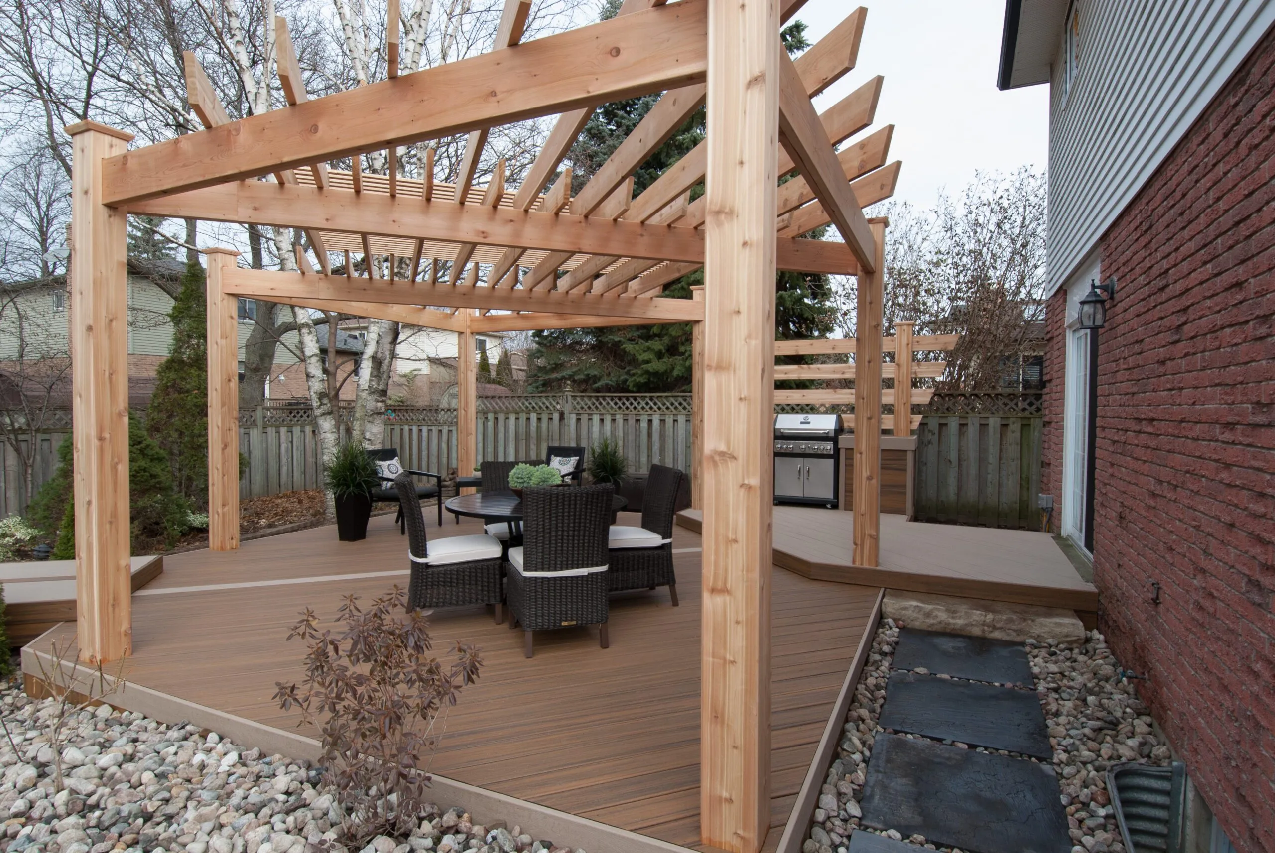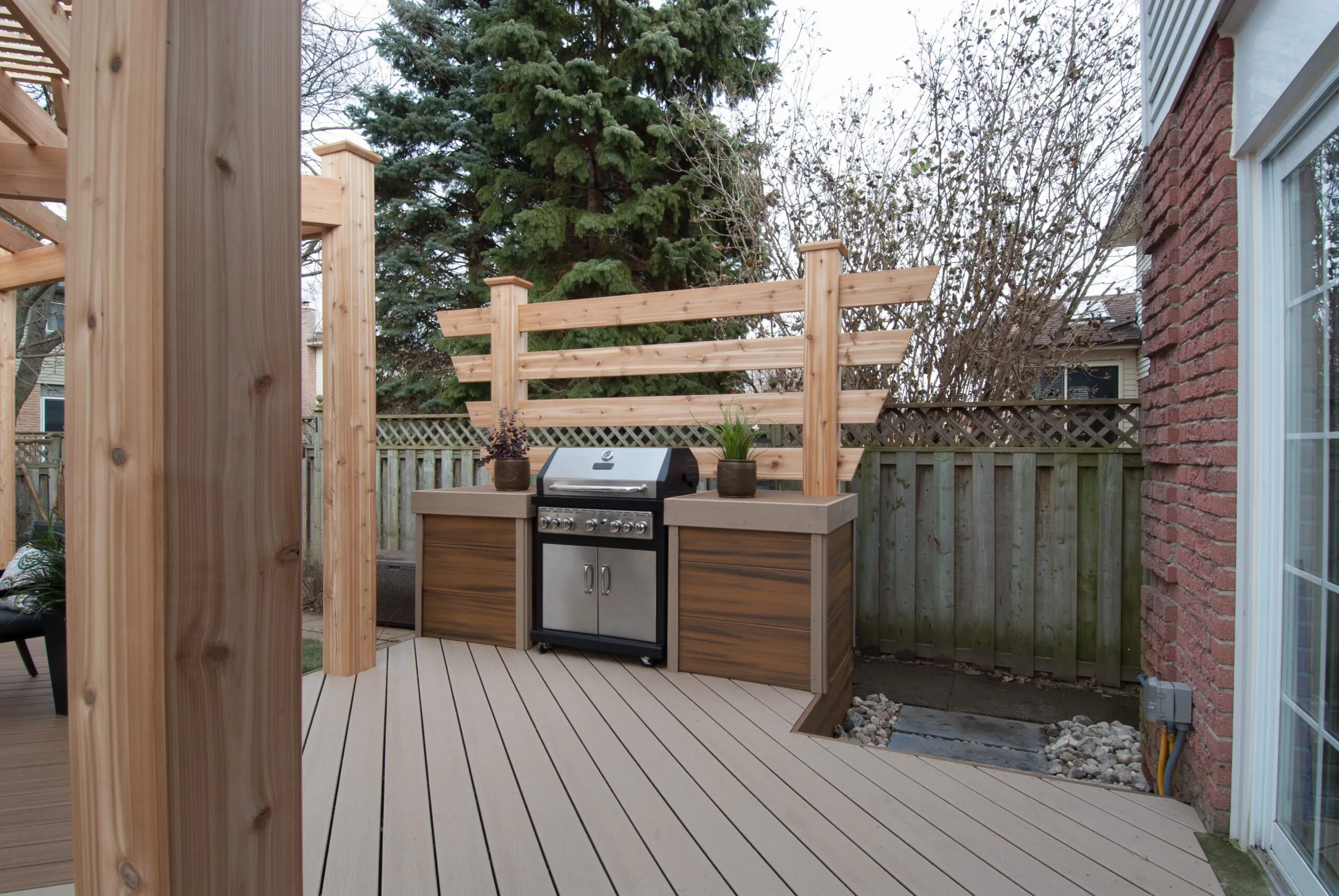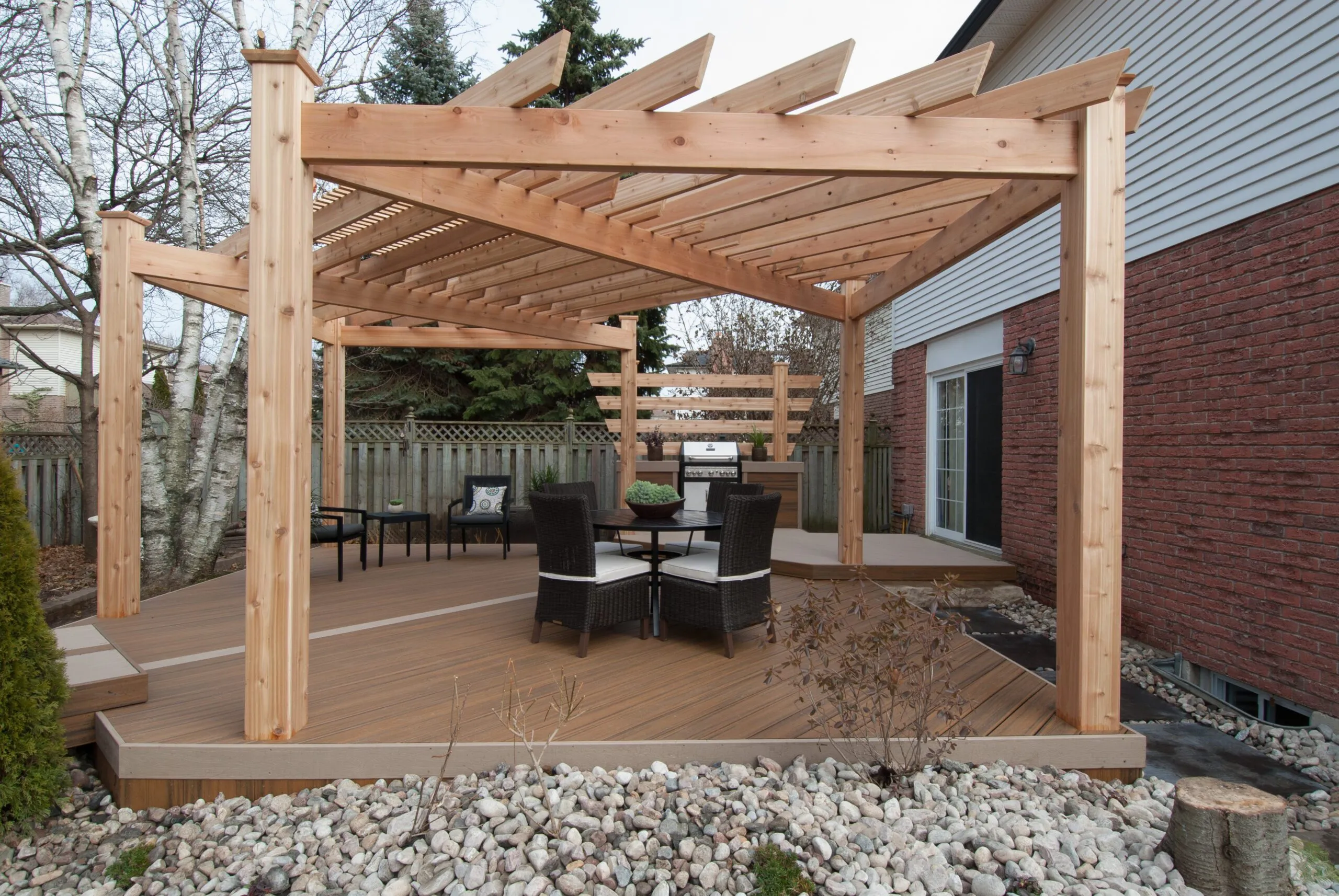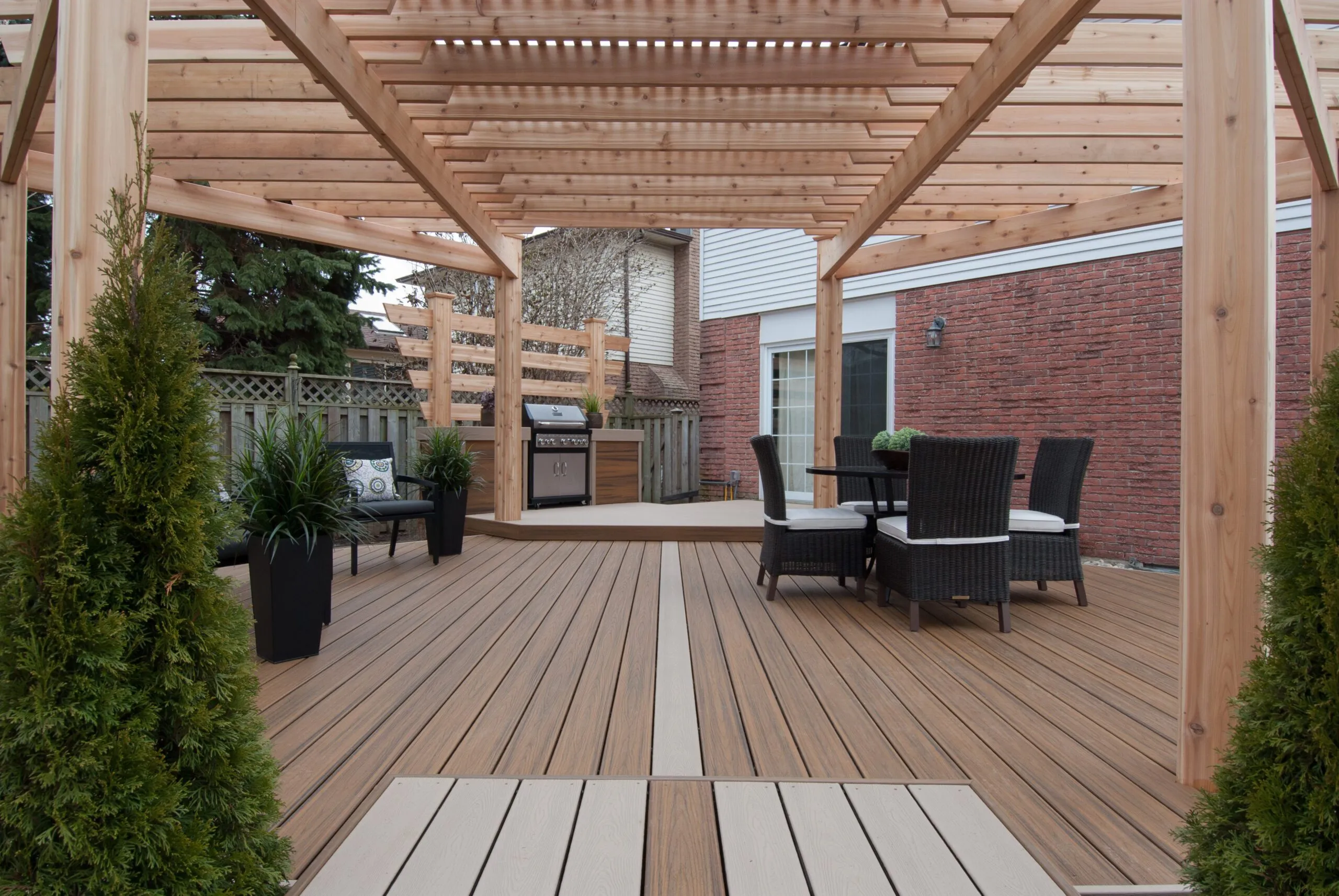 For this project, we set out to design a deck that felt less like a backyard addition and more like an experience. The curved boardwalk-style entry gives the whole space a sense of flow and arrival—like you're stepping into a retreat. We incorporated a custom pergola with intricate metal privacy screens, which filter light beautifully and offer just the right amount of enclosure. A central fire bowl, flanked by cozy built-in seating and accent planters, turns the space into a perfect gathering spot at dusk. This deck is about more than function—it's about emotional connection. From the gentle curvature of the walkways to the quiet nooks for conversation, every detail was chosen to invite pause, presence, and peace. It’s one of our favourite examples of how outdoor living can be both grounded and transformative.