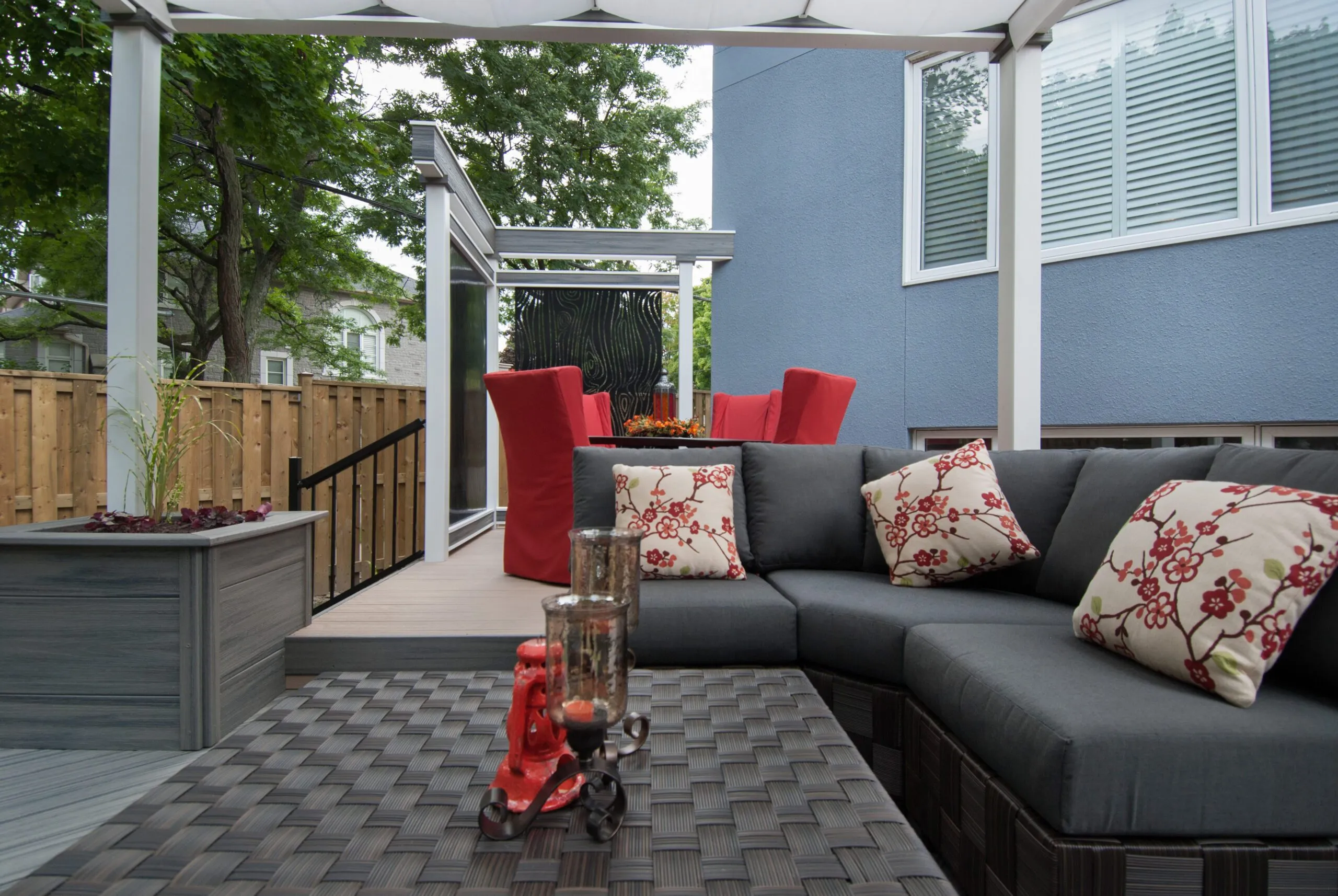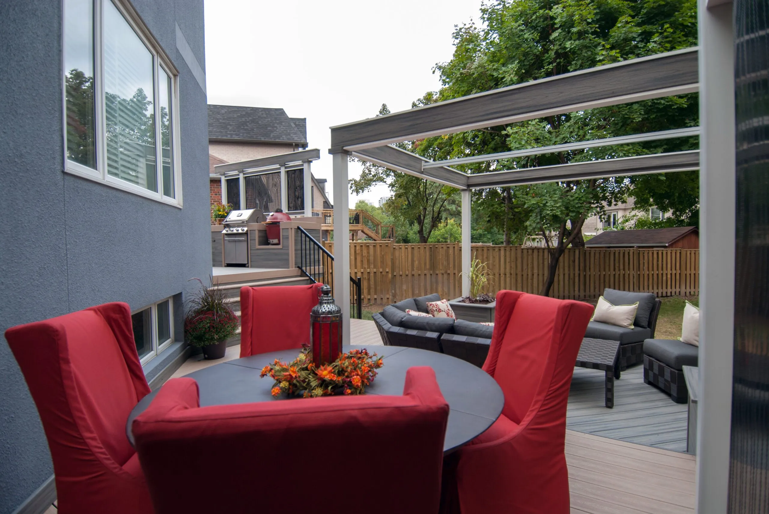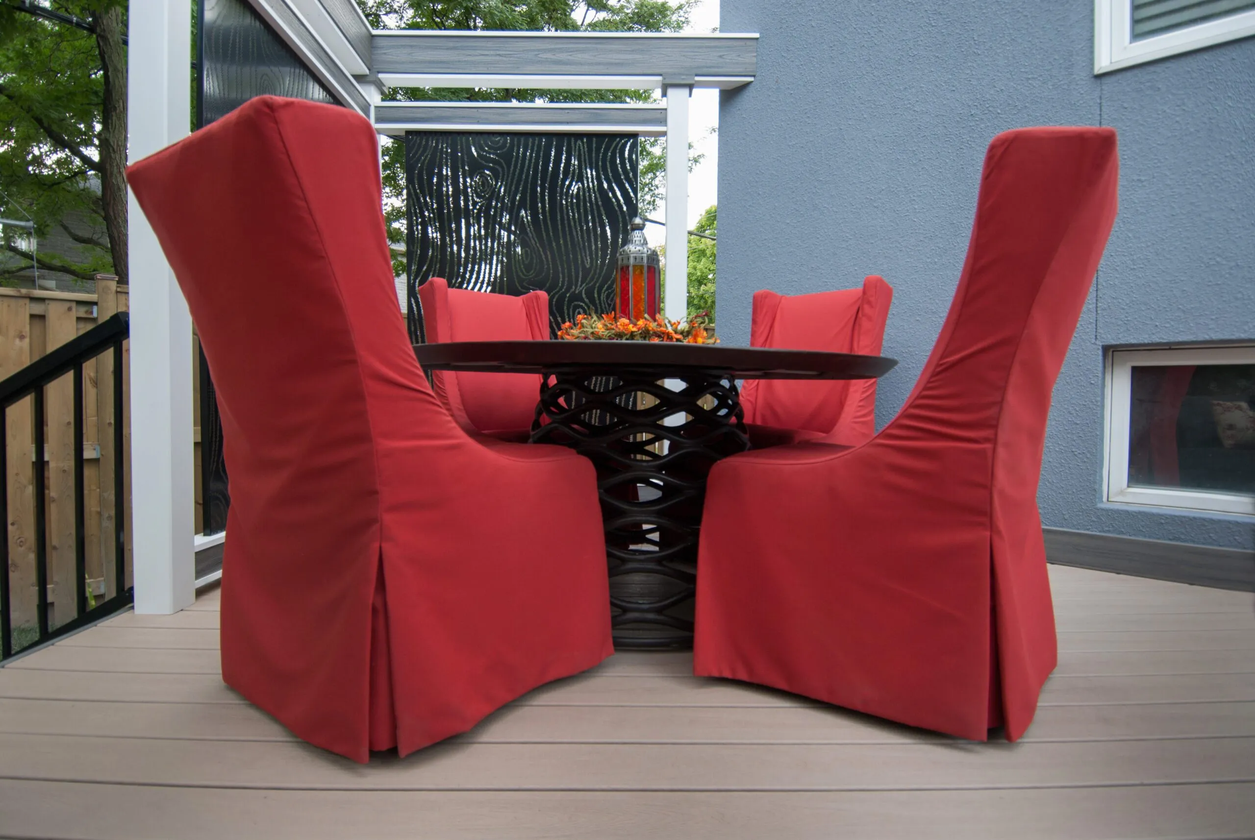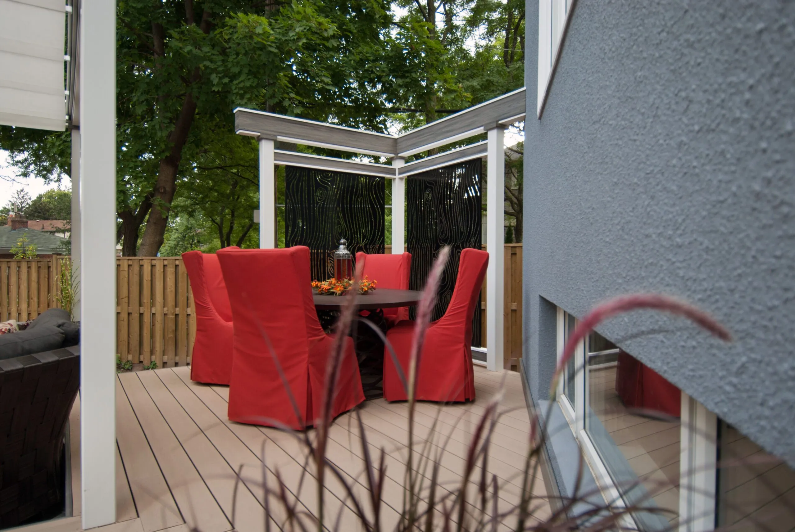 For this project, we were tasked with creating a fully functional outdoor kitchen and dining area—without eating up the entire yard. Our solution: a cantilevered deck that floats off the home’s side, extending usable space without requiring a larger footprint. The central feature is a sleek, built-in kitchen setup, complete with a stainless steel grill, prep surfaces, storage, and space for bar seating. We kept the cabinetry low-profile and modern to let the materials and layout do the talking. The deck’s elevation also makes for a smoother transition from the interior kitchen to the outdoor one. To bring life and personality into the space, we went bold with red accent seating and contrasting tones in the decking and trim. Whether it’s a quiet breakfast or a summer dinner party, this deck is designed to host with ease.