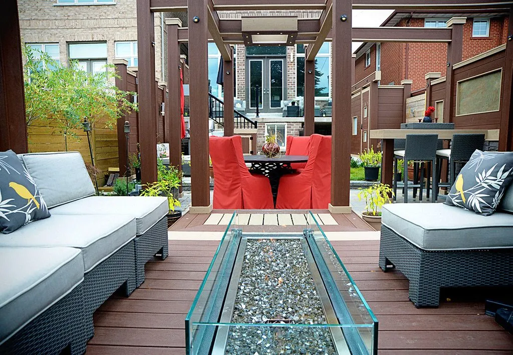 The City Haven Deck redefines what’s possible in a compact urban yard. Designed for homeowners looking to maximize every square foot, this project brings together privacy, comfort, and contemporary style. A standout feature is the bold use of red accent chairs and accessories, adding vibrancy and personality to the minimalist deck layout. Built-in seating, raised planter beds, and custom privacy screens help define different zones—whether you’re lounging, dining, or soaking up some sun. The integrated lighting and water features bring a calming ambiance, making this space as functional at night as it is during the day. It’s a smart, stylish solution for city dwellers seeking a private outdoor sanctuary that doesn’t compromise on beauty or function.