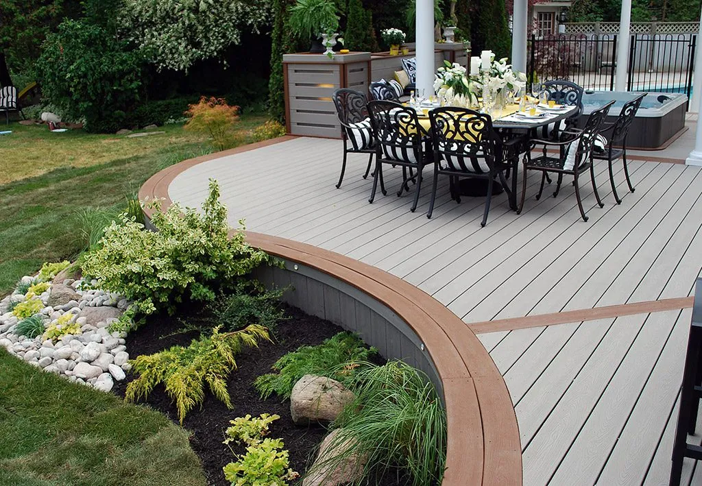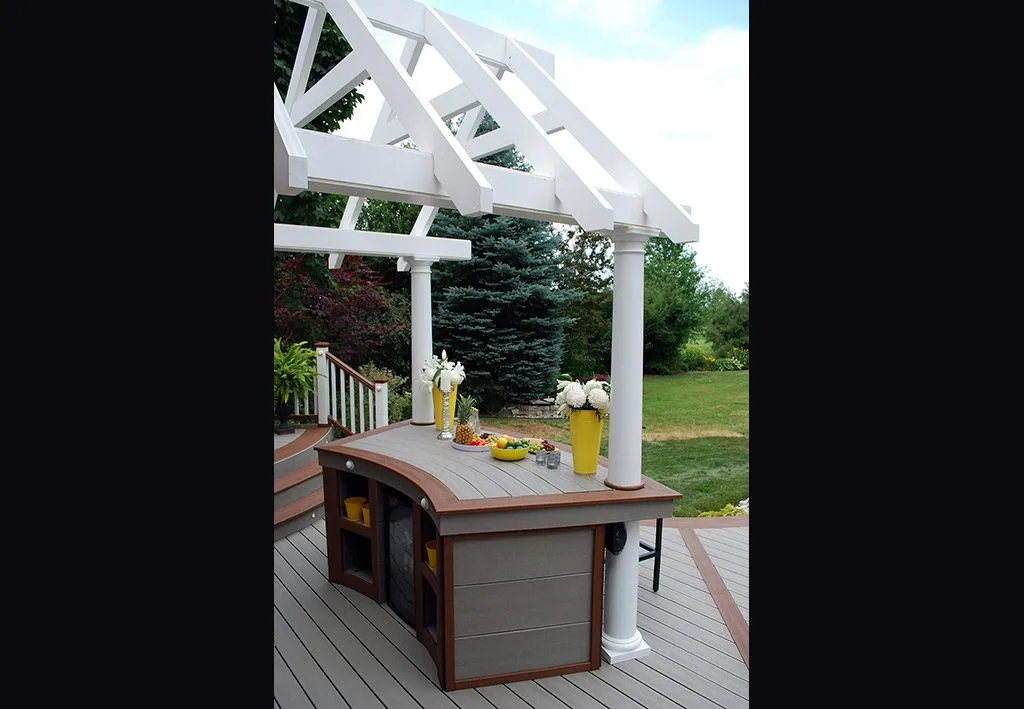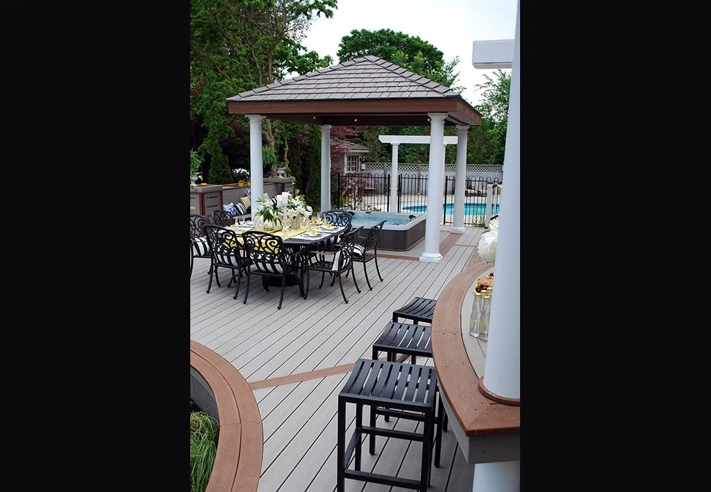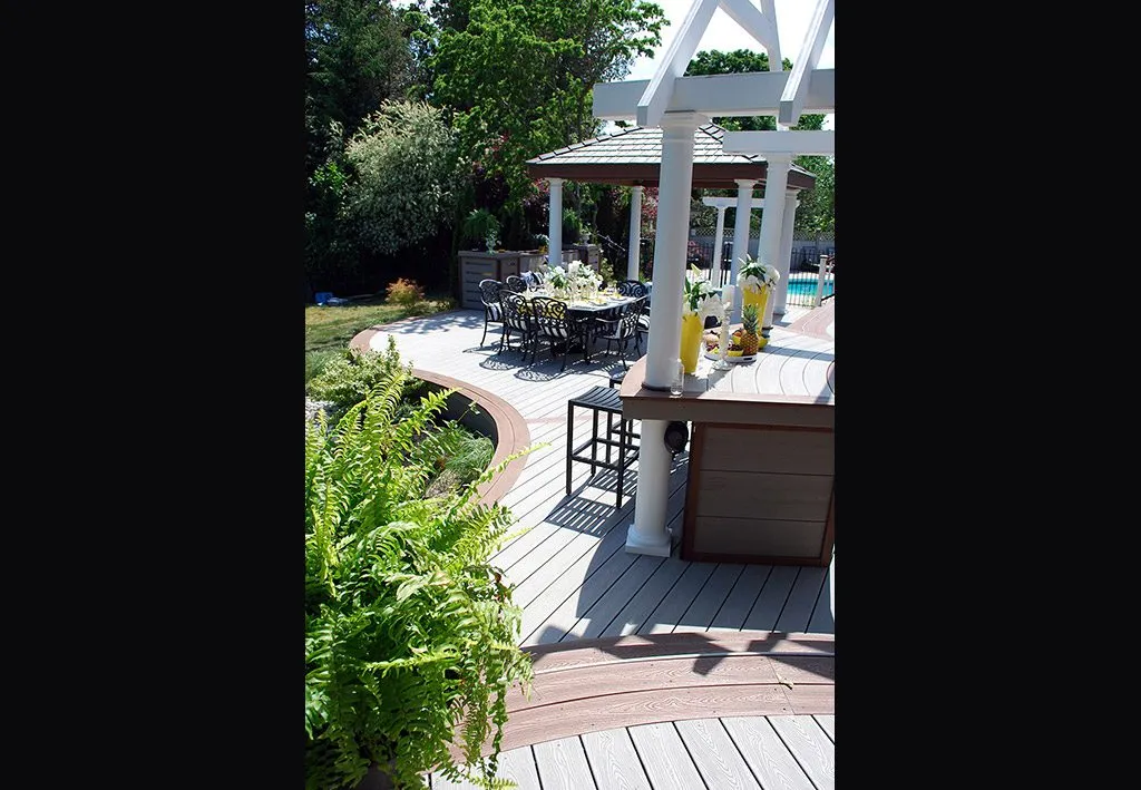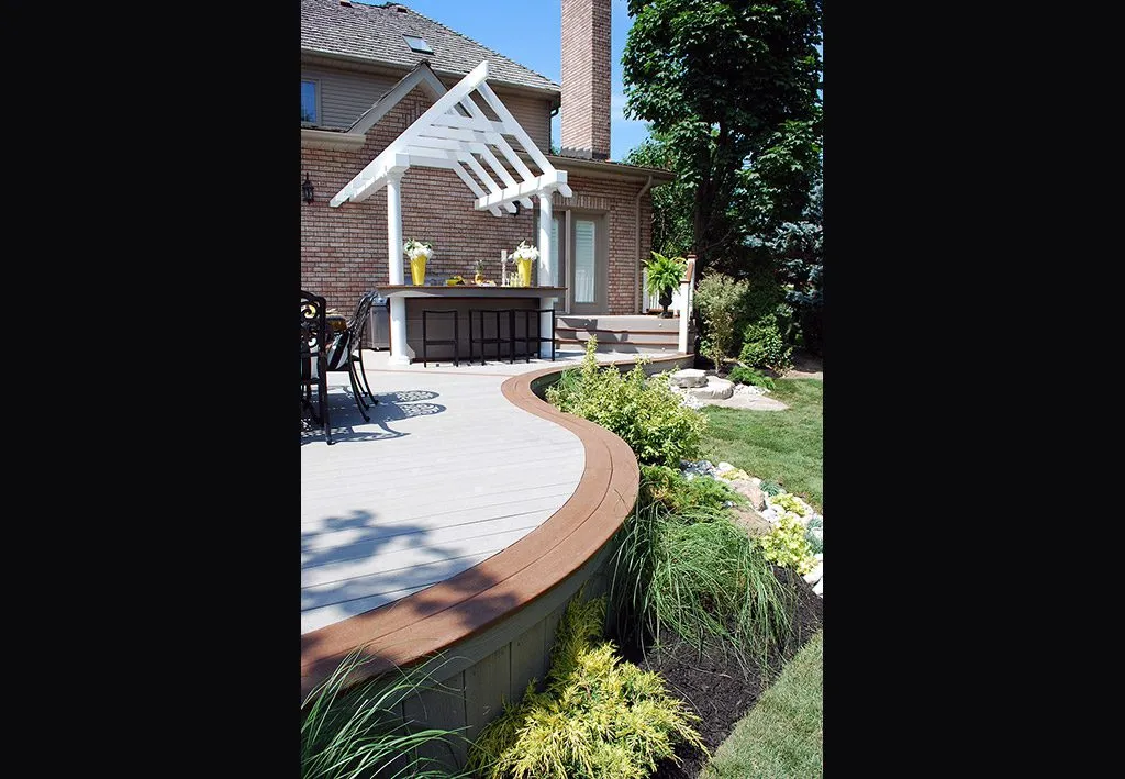 The Dream Deck was designed to feel like a private resort tucked into a suburban backyard. From the moment you step out onto the deck, every feature is positioned to create ease and enjoyment—from the curved benching that guides you through the space to the central hot tub that invites you to unwind in any season. The structure includes a pergola-covered lounge area, an open-air dining space, and a built-in outdoor kitchen complete with bar seating. Thoughtful elevation changes subtly define each area without breaking the visual flow, while the gentle curves soften the footprint and enhance the connection to the surrounding garden. This custom deck is the perfect example of outdoor living design that balances functionality, comfort, and aesthetic charm—ideal for homeowners dreaming of a backyard oasis.
