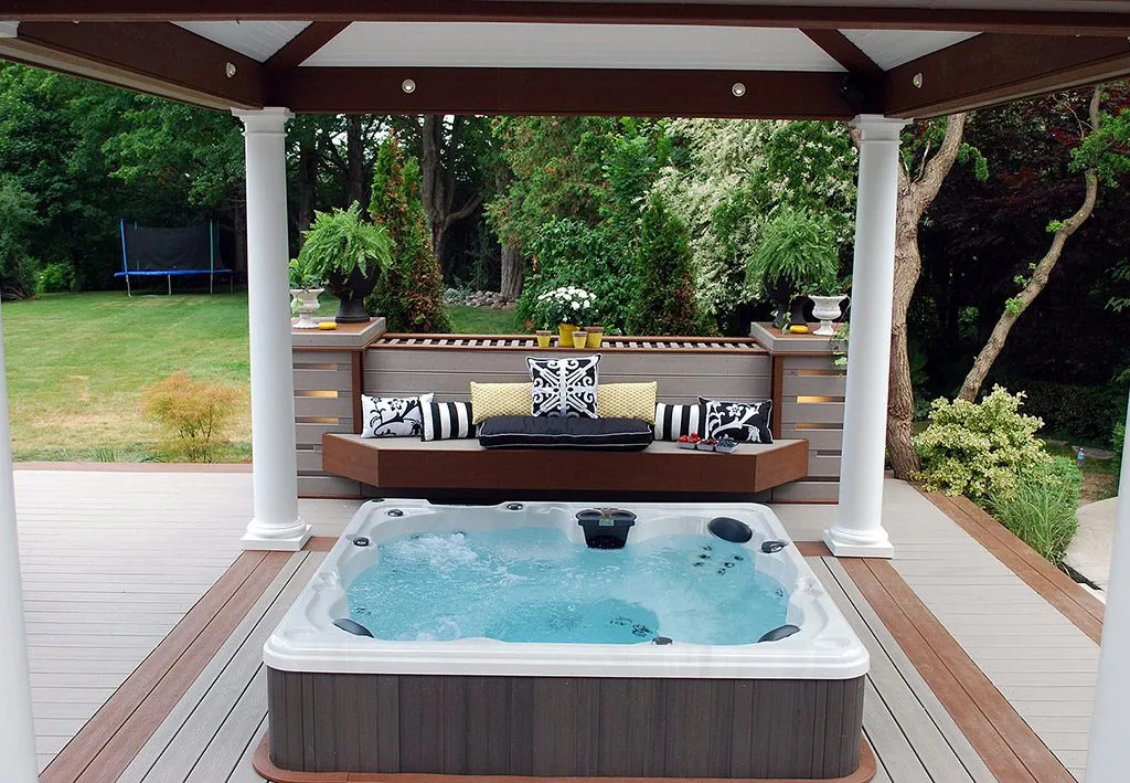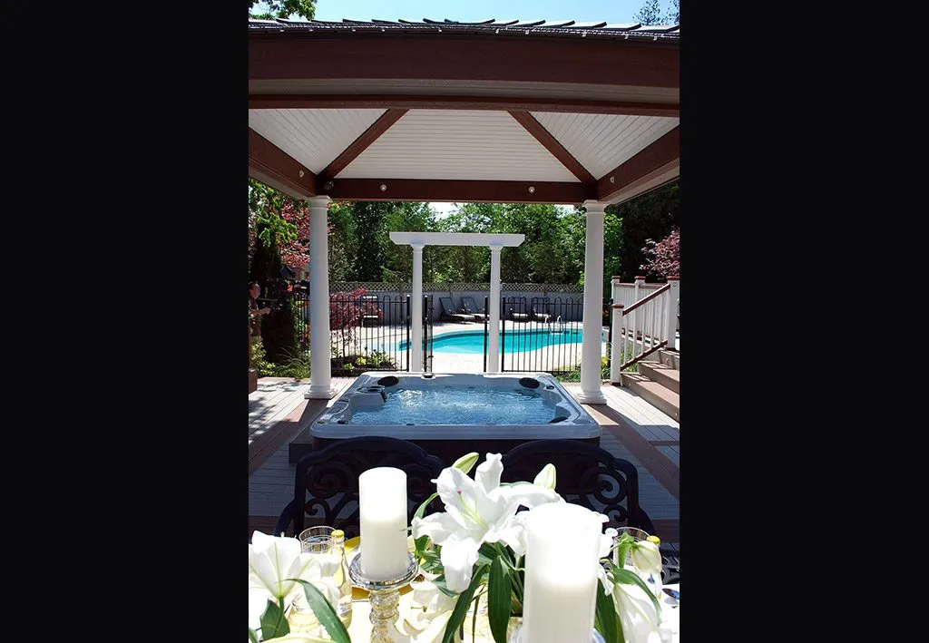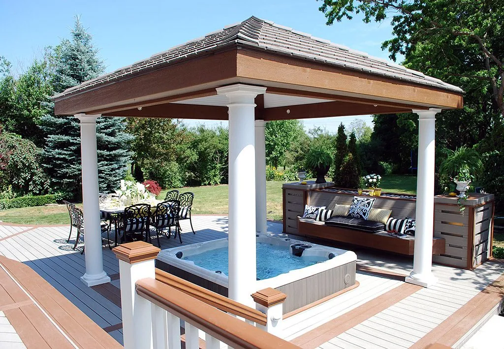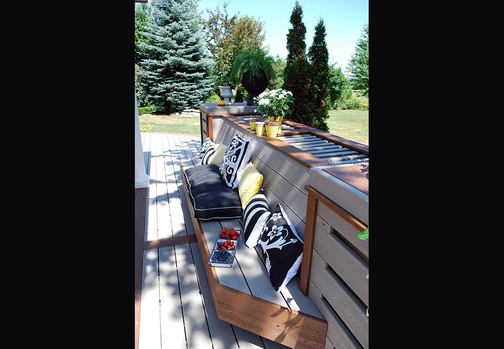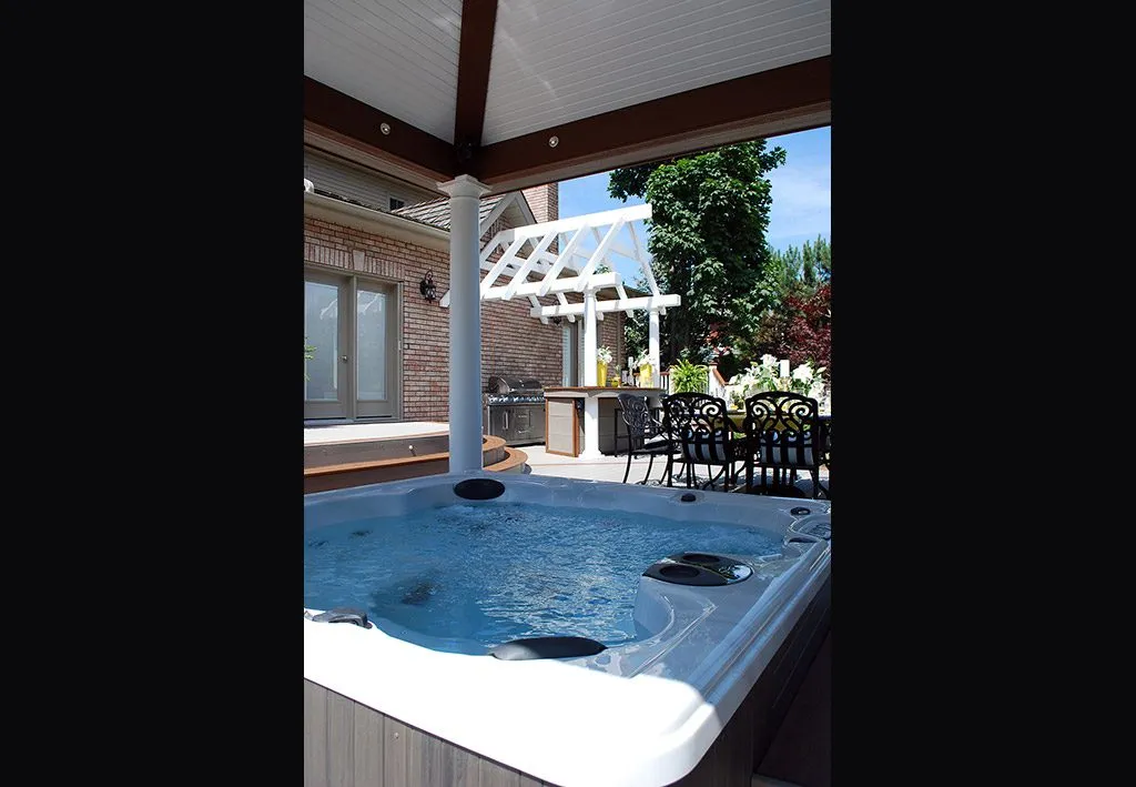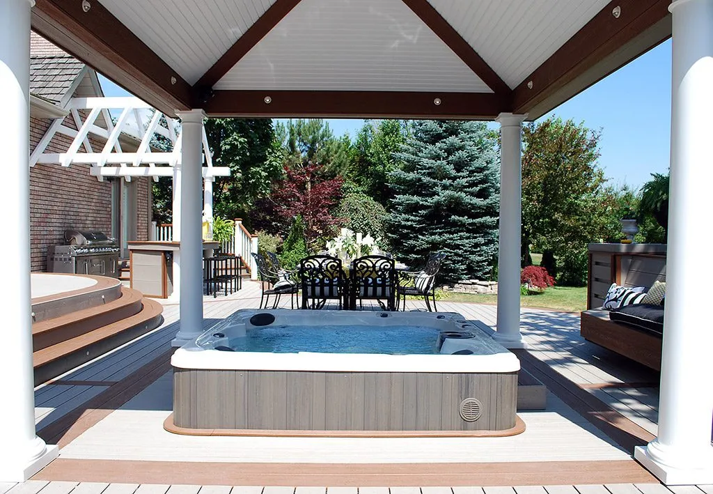 The Dream Deck was designed to feel like a private resort tucked into a suburban backyard. From the moment you step out onto the deck, every feature is positioned to create ease and enjoyment—from the curved benching that guides you through the space to the central hot tub that invites you to unwind in any season. The structure includes a pergola-covered lounge area, an open-air dining space, and a built-in outdoor kitchen complete with bar seating. Thoughtful elevation changes subtly define each area without breaking the visual flow, while the gentle curves soften the footprint and enhance the connection to the surrounding garden. This custom deck is the perfect example of outdoor living design that balances functionality, comfort, and aesthetic charm—ideal for homeowners dreaming of a backyard oasis.