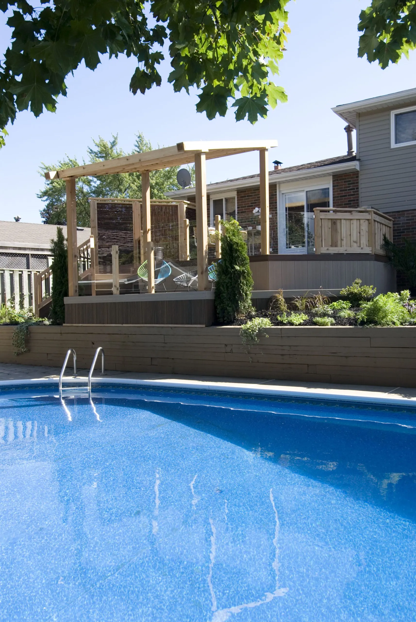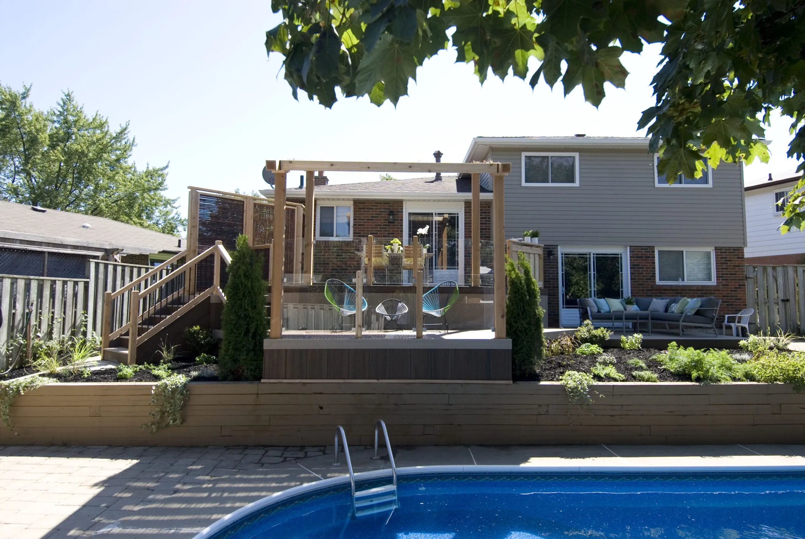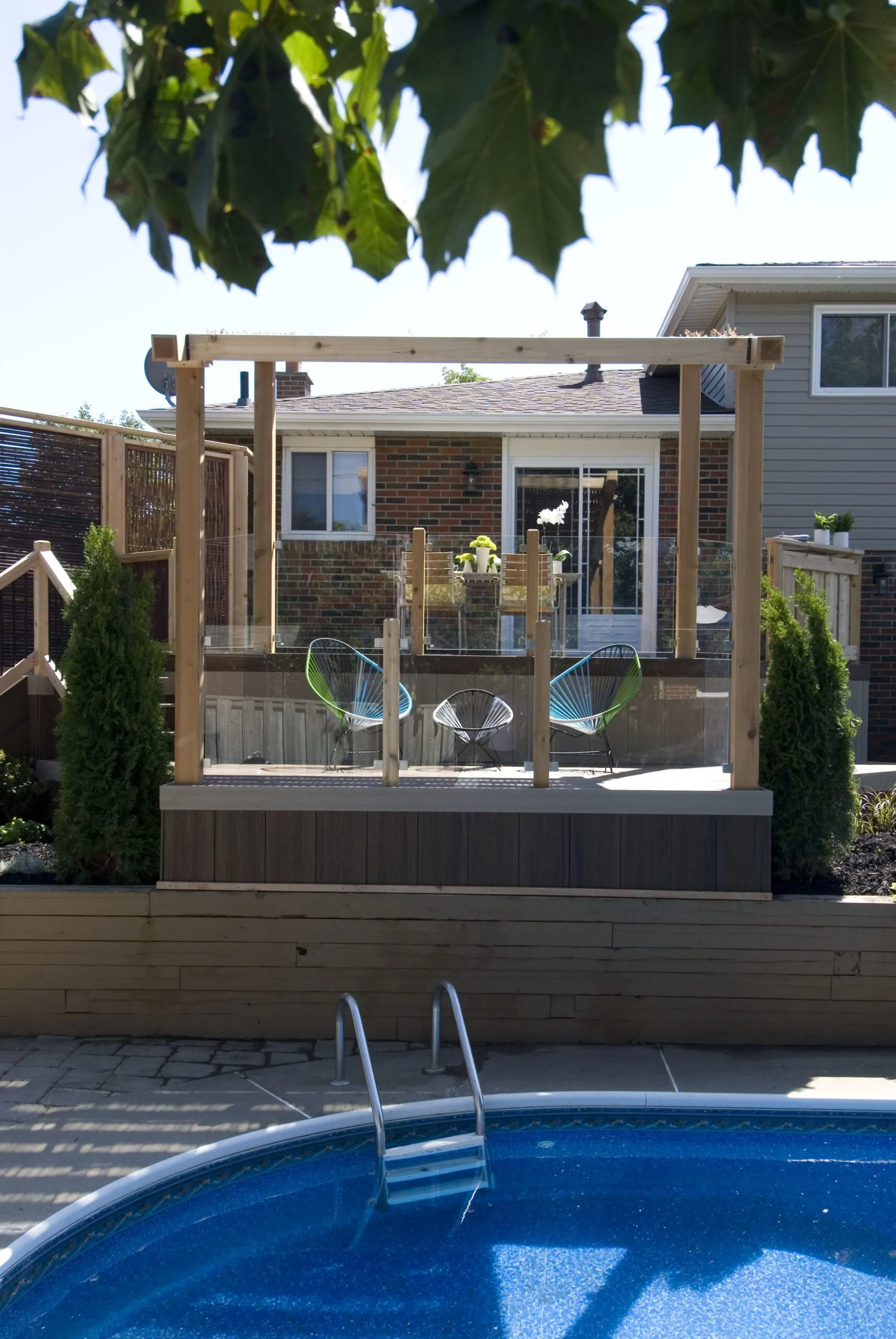 For this project, we set out to create a backyard deck that could keep up with a fearless homeowner who wanted it all—style, comfort, and serious function. With the pool as the centrepiece, we layered the space vertically using a series of steps and platforms to naturally separate lounging, cooking, and spa zones without losing that open-concept feeling. We incorporated a sleek pergola with angled beams to create shade over the main seating area, then added built-in privacy panels and landscaping for added seclusion without sacrificing airiness. The integrated hot tub deck and sun loungers make this space equally perfect for energetic gatherings or slow mornings by the water. This deck became more than just a place to hang out—it’s now the go-to zone for family life, summer parties, and peaceful escapes alike. We’re proud of how it balances bold design with everyday livability.
