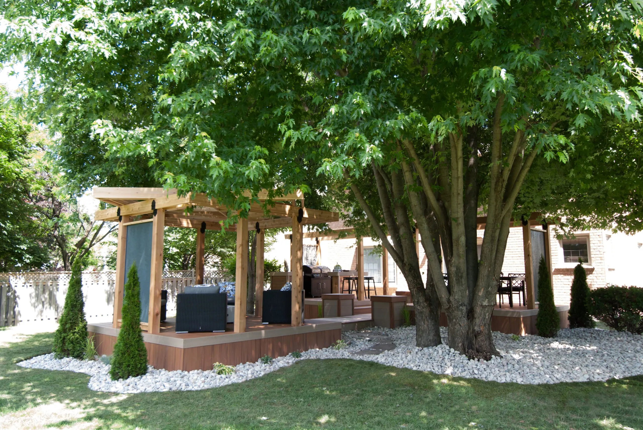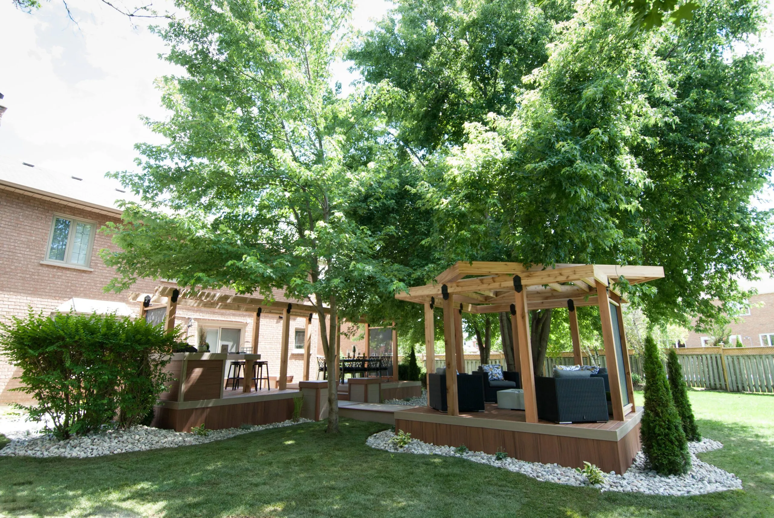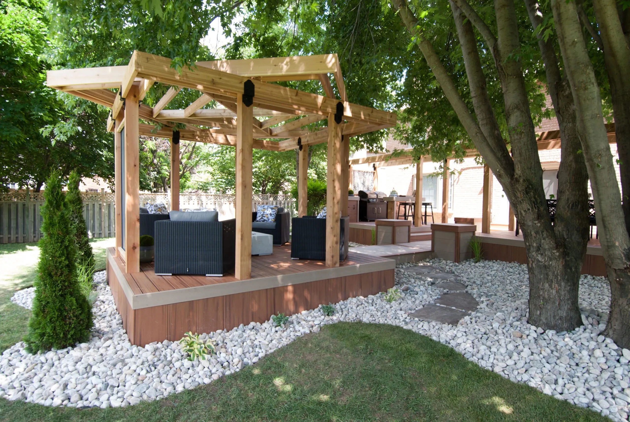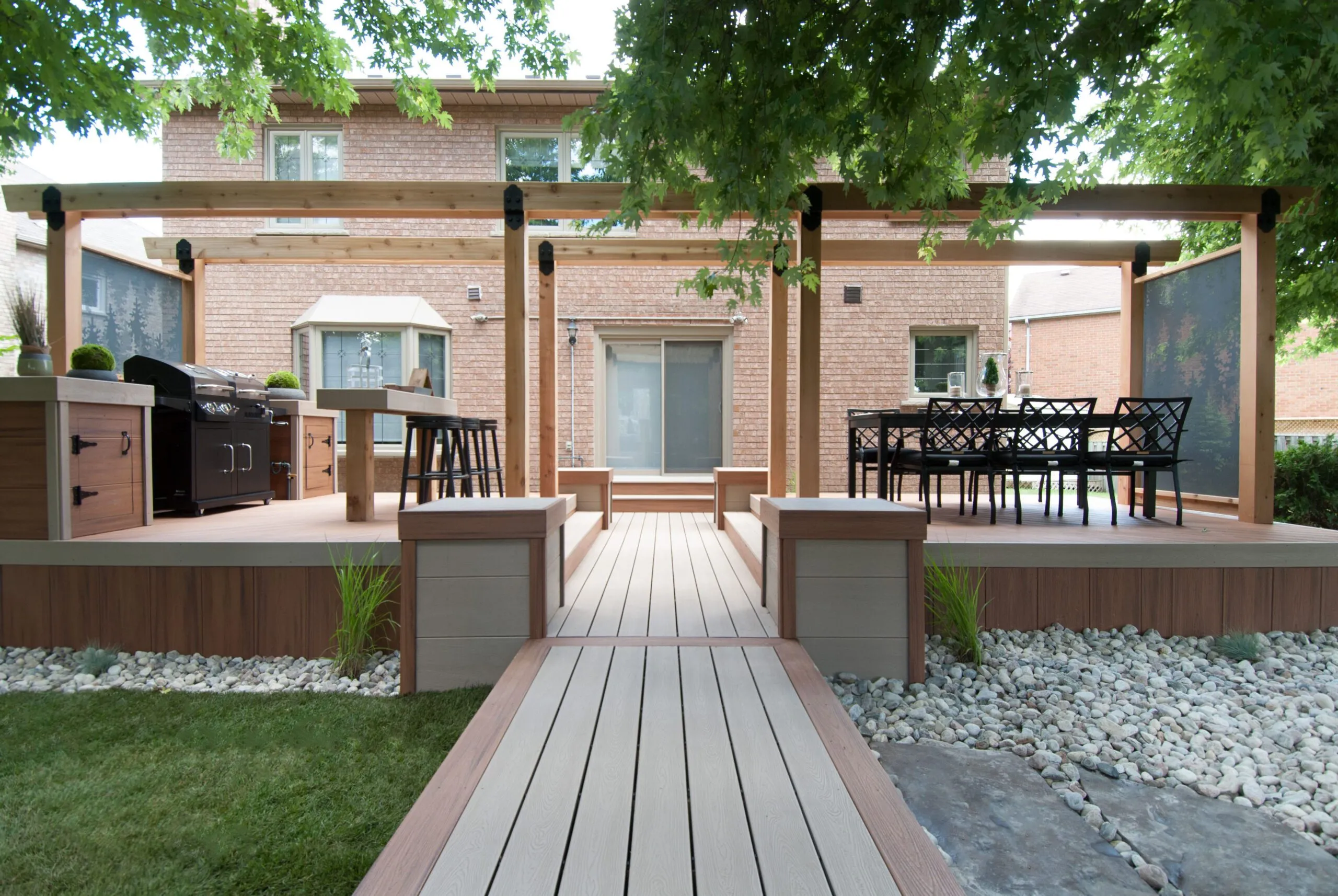 The Hallway to Heaven Deck lives up to its name with a beautifully linear design that draws you into nature. This elevated pathway-style deck connects zones of outdoor comfort, guiding guests from one experience to the next—be it lounging, dining, or relaxing under the canopy of trees. The custom woodwork, integrated lighting, and curated landscaping create a calming journey-like atmosphere. Every angle of this design is intentional, maximizing both flow and functionality. It’s a serene outdoor retreat that doubles as an architectural statement. Ideal for homeowners who want both structure and soul in their backyard sanctuary.