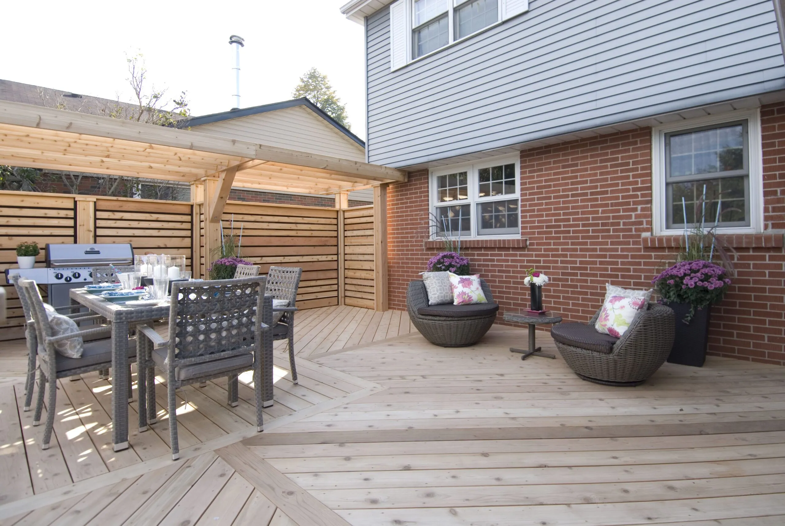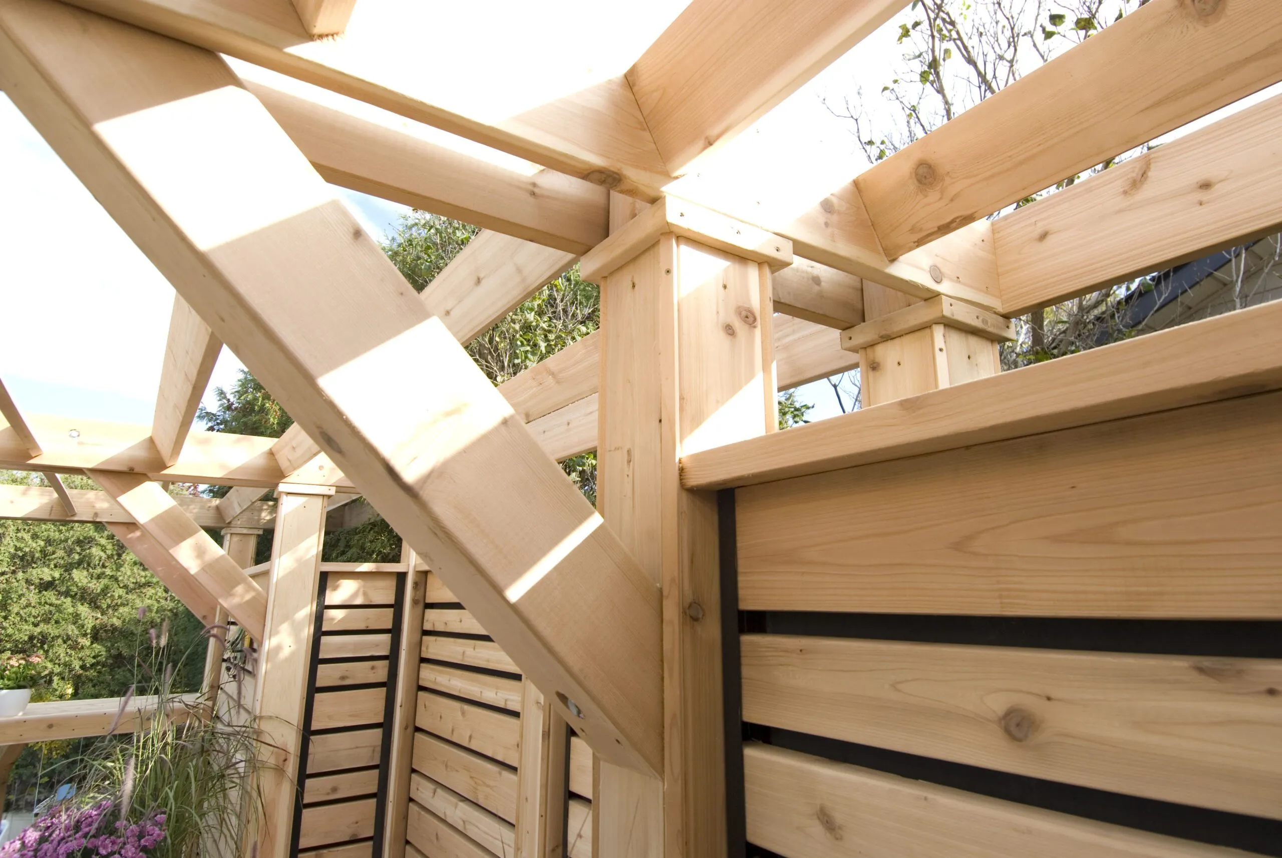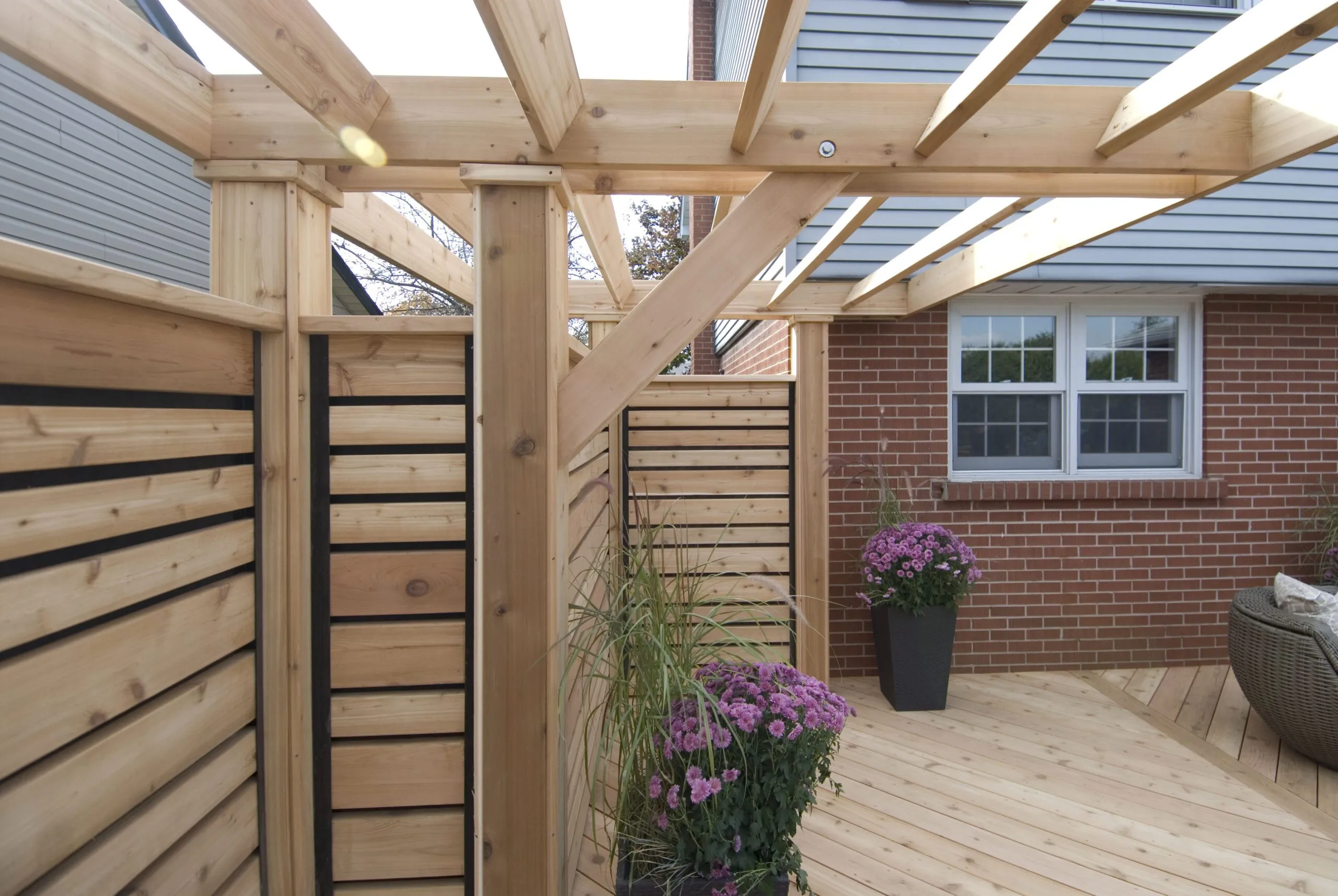 A clean-lined cedar deck built for privacy and contemporary outdoor living. Features custom horizontal slat screens and partial pergola framing.
