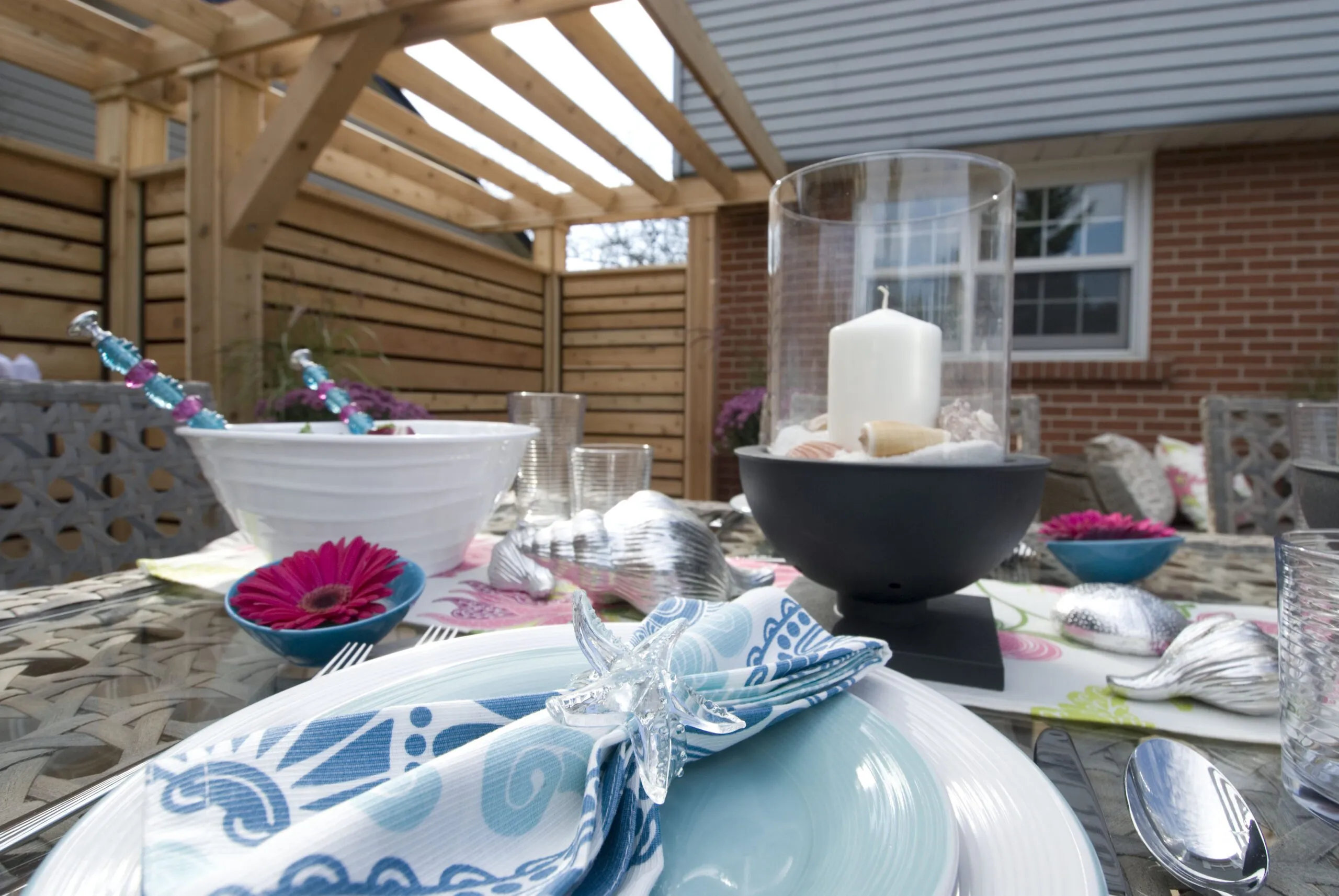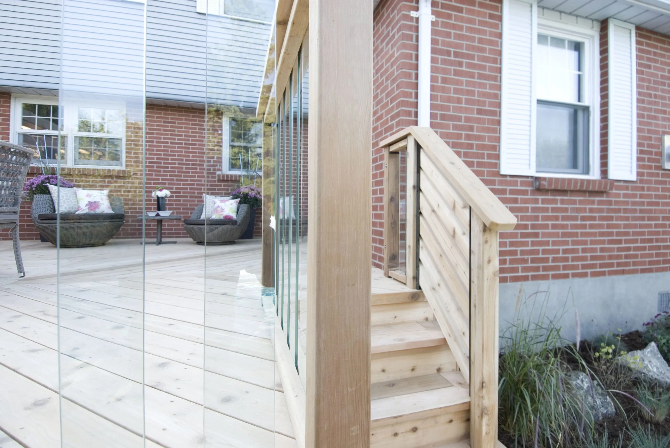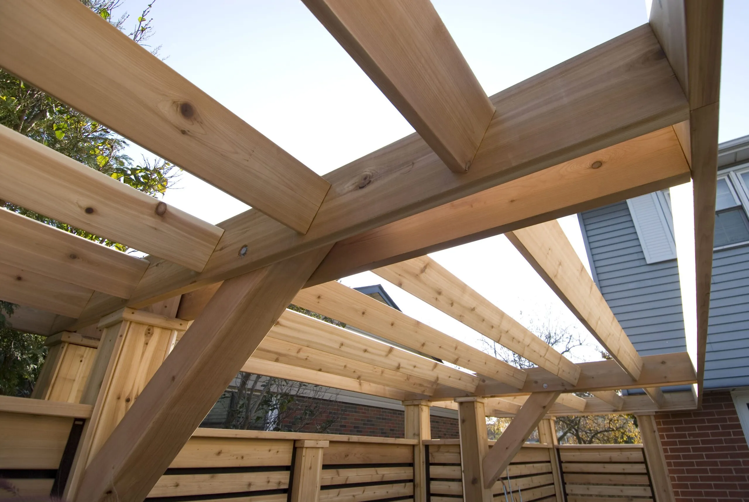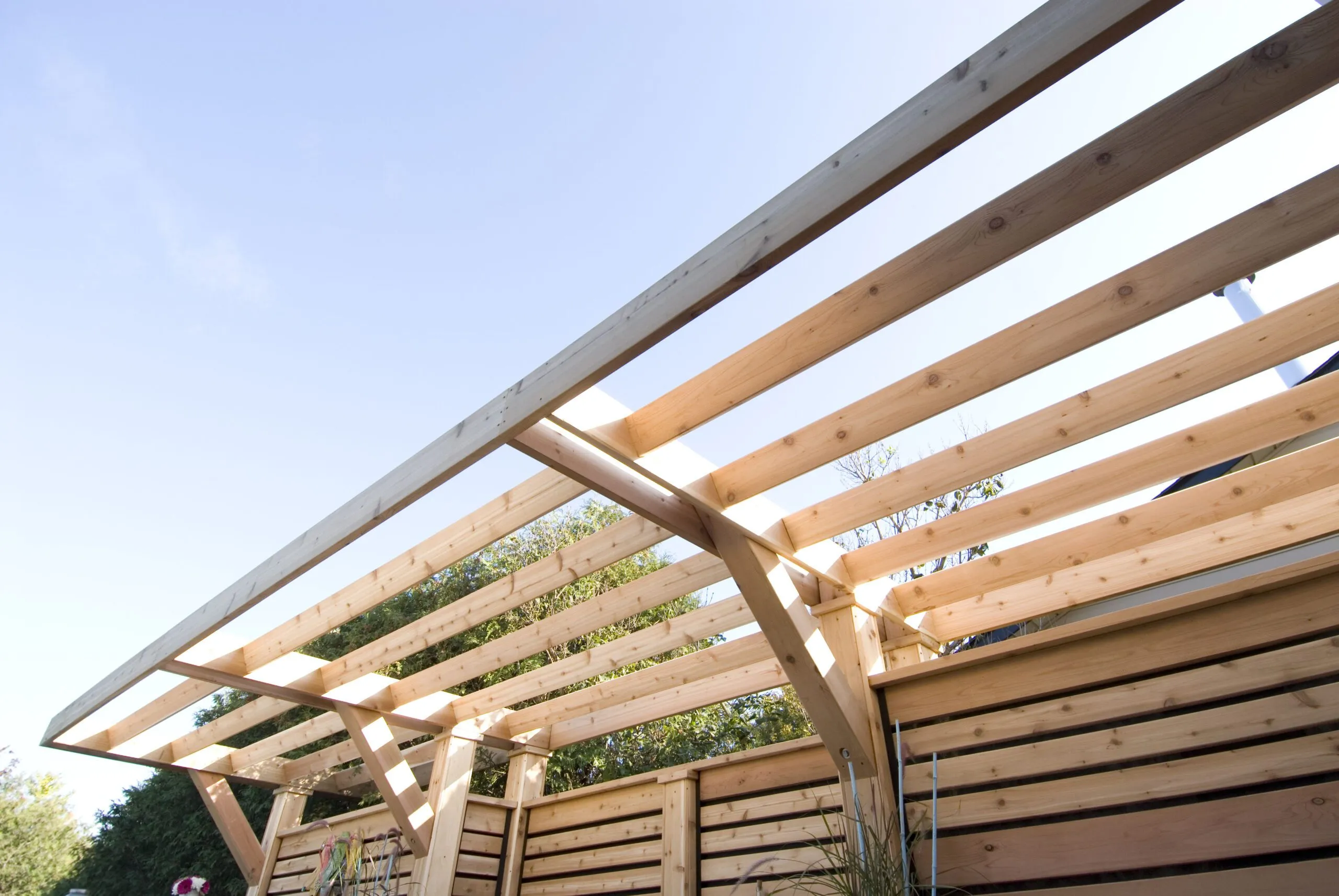 A clean-lined cedar deck built for privacy and contemporary outdoor living. Features custom horizontal slat screens and partial pergola framing.