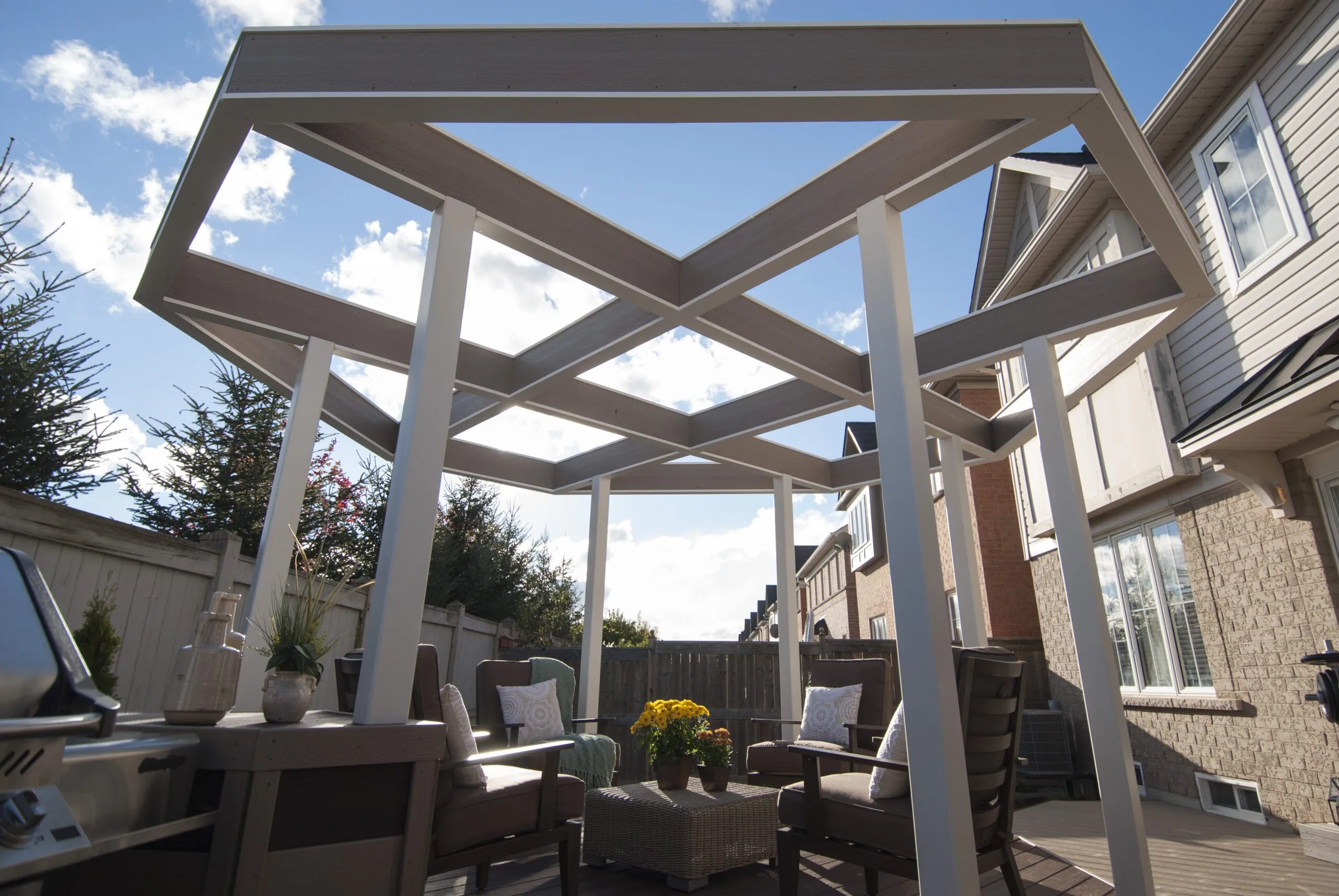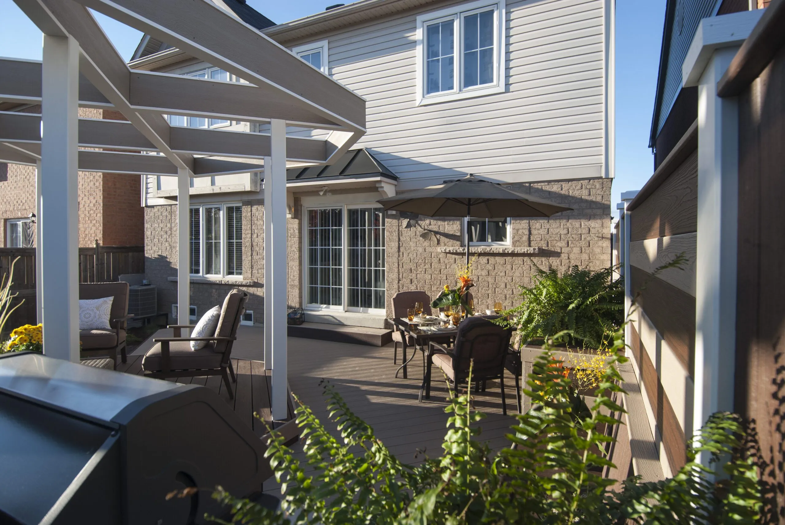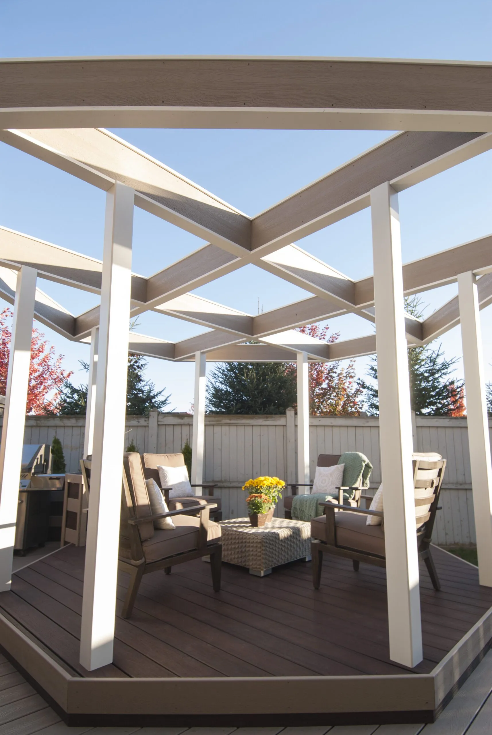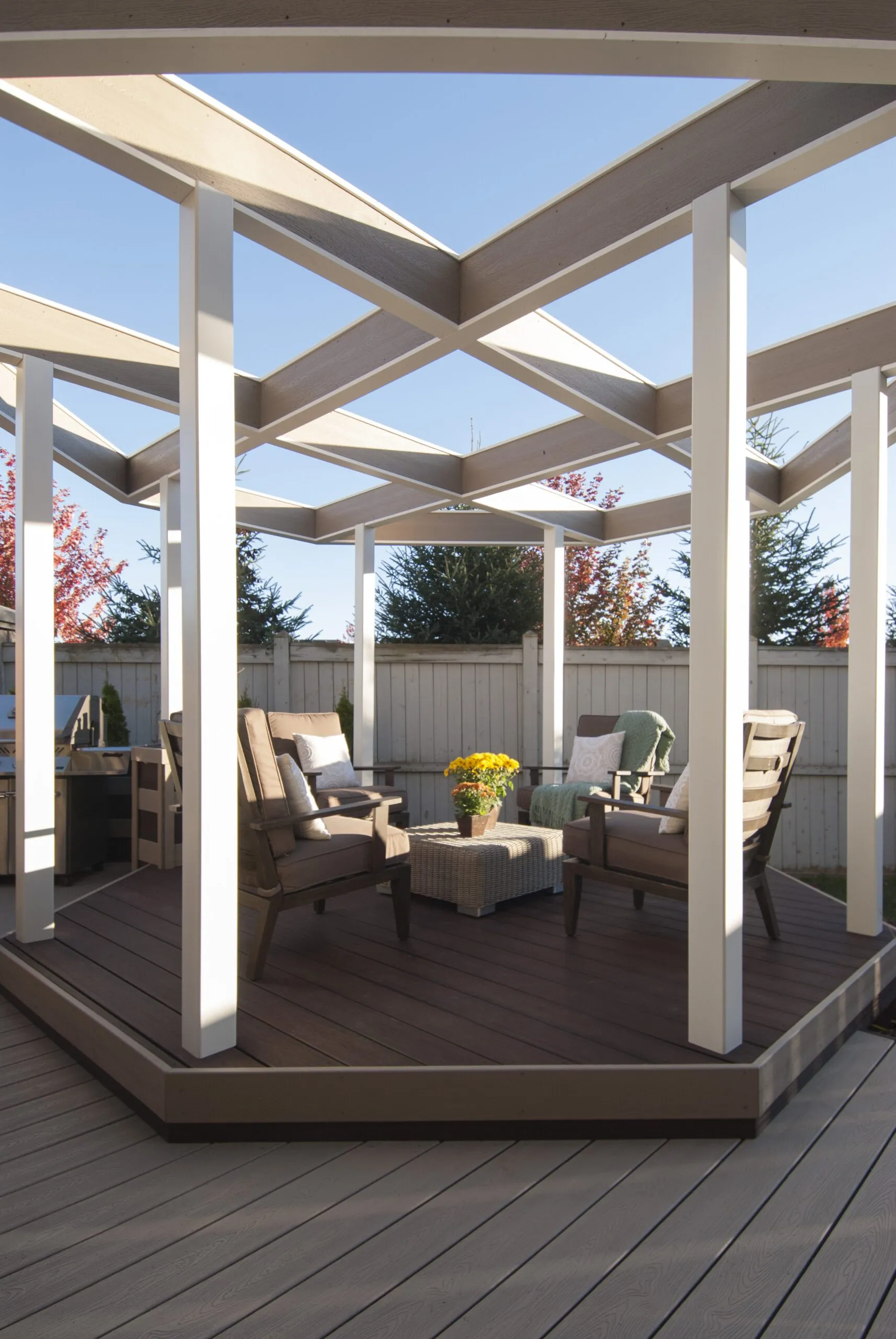 An elegant backyard deck centered around a large architectural pergola structure. Multiple seating zones and soft transitions create a space made for connection and reflection.