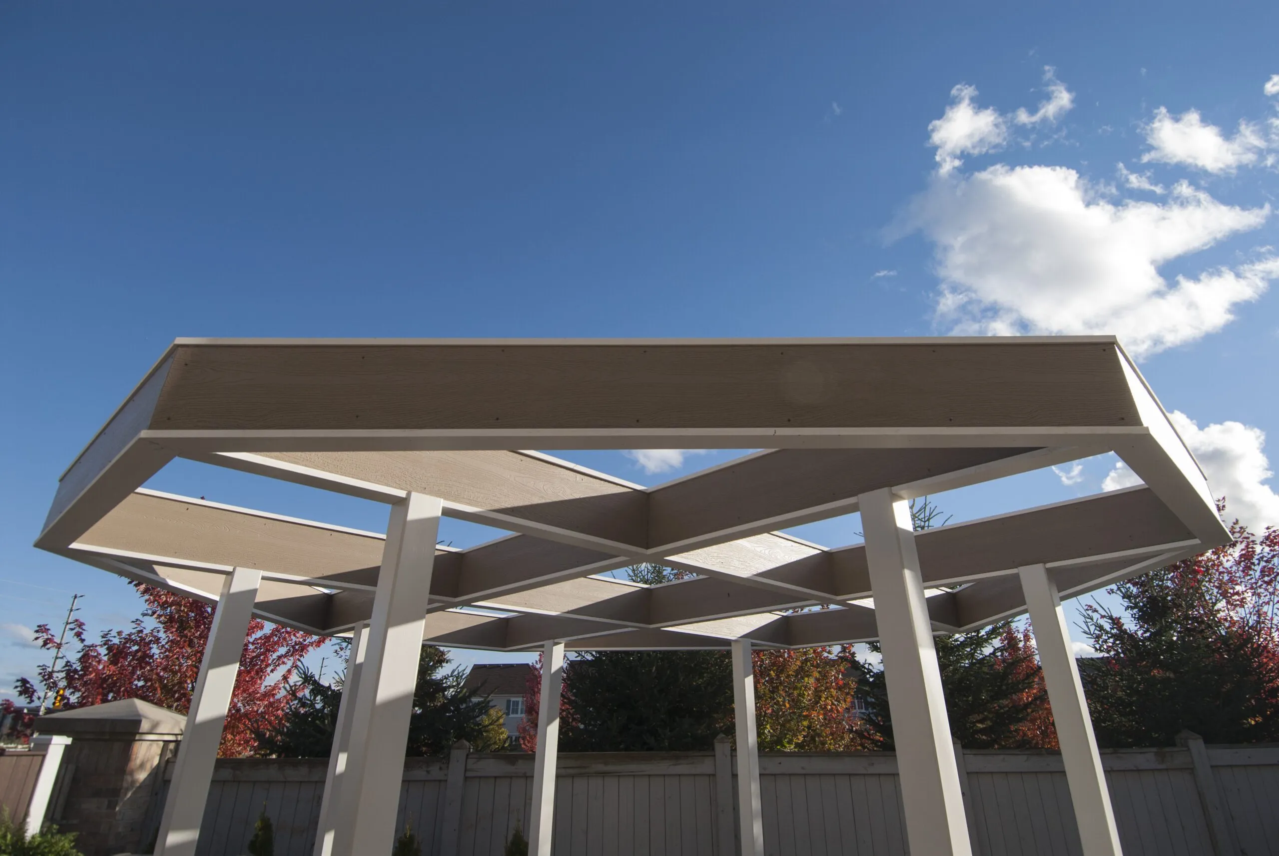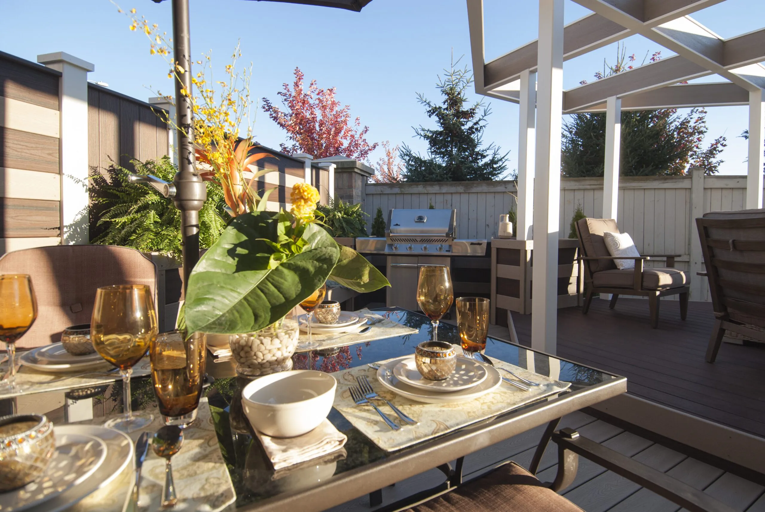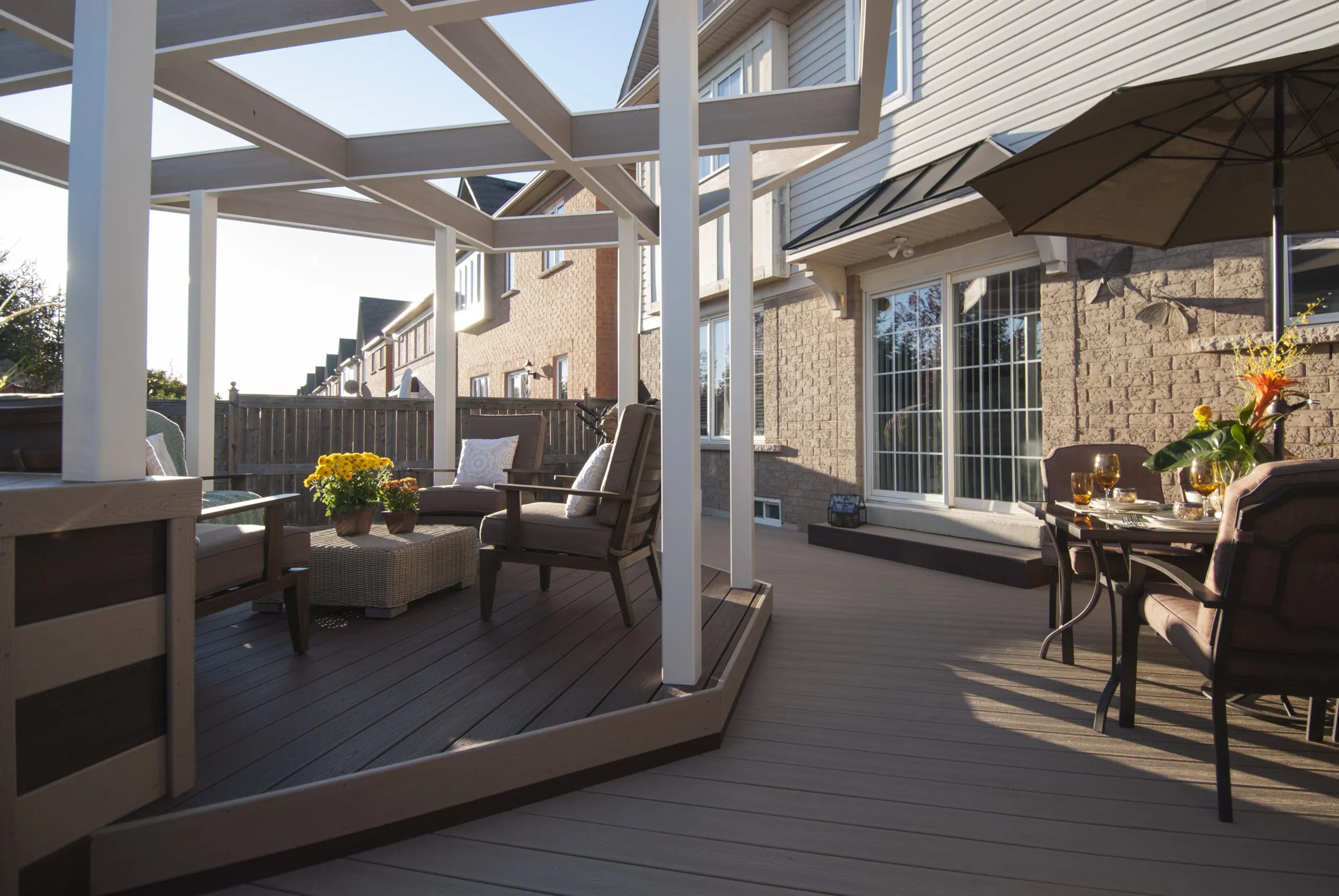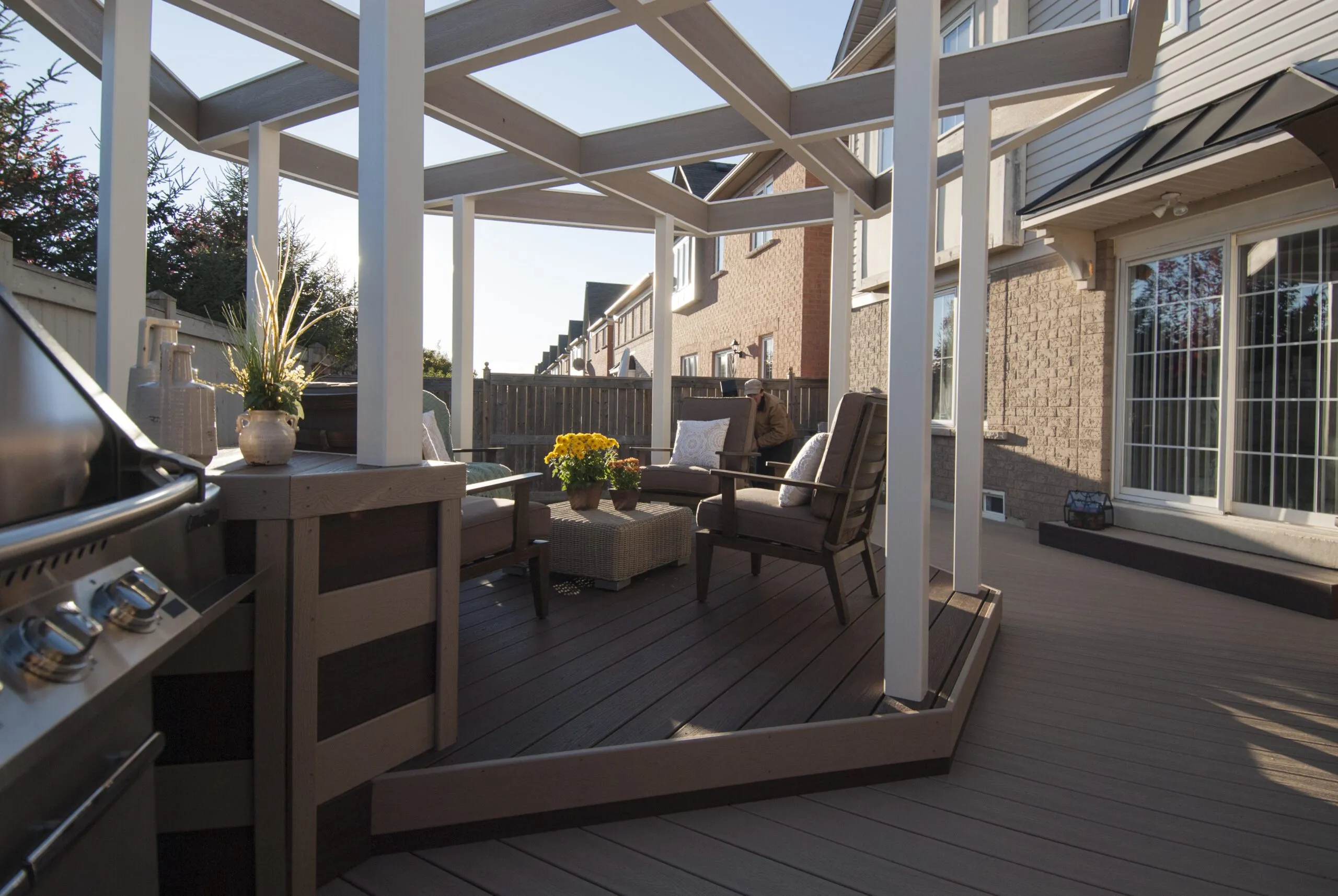 An elegant backyard deck centered around a large architectural pergola structure. Multiple seating zones and soft transitions create a space made for connection and reflection.