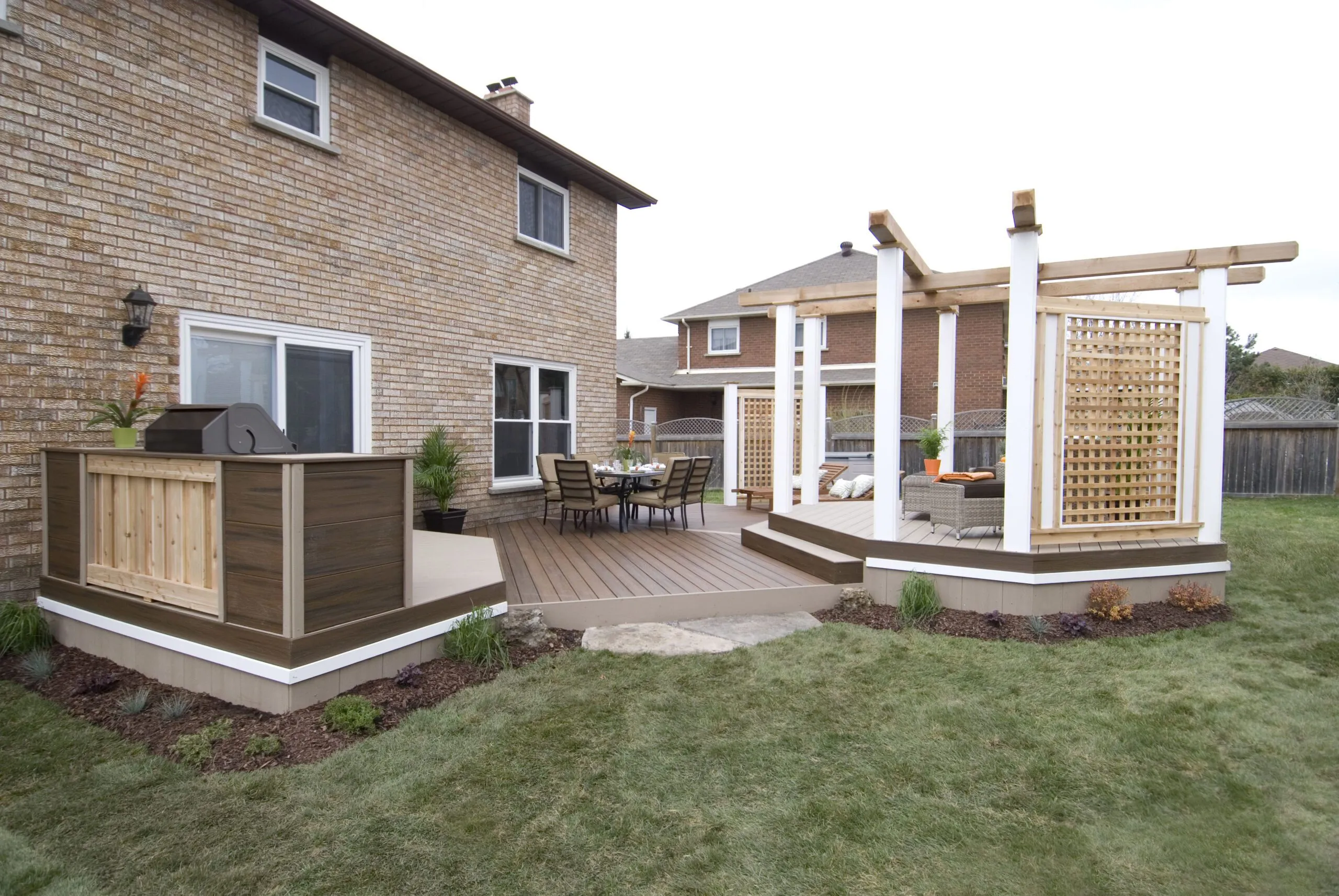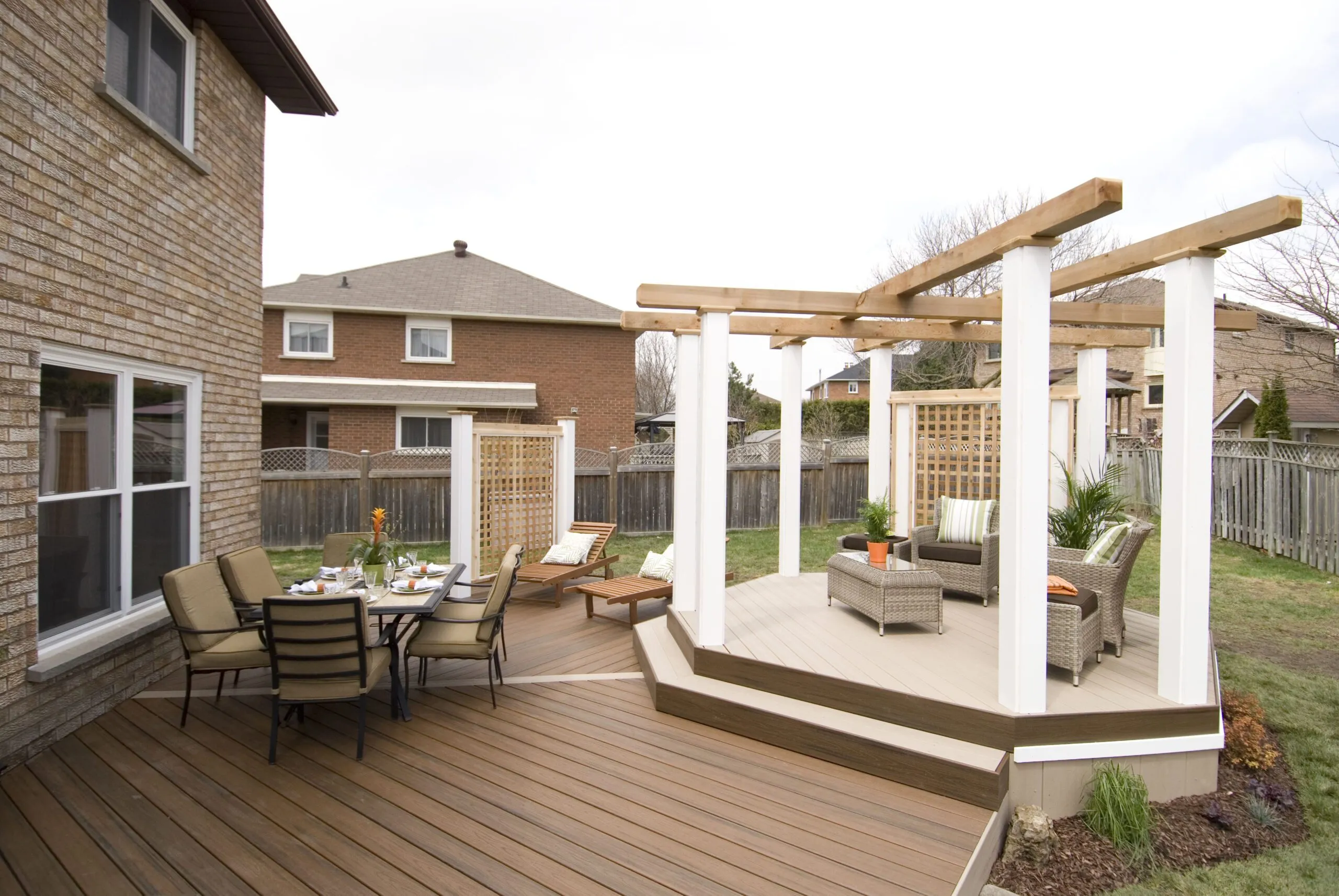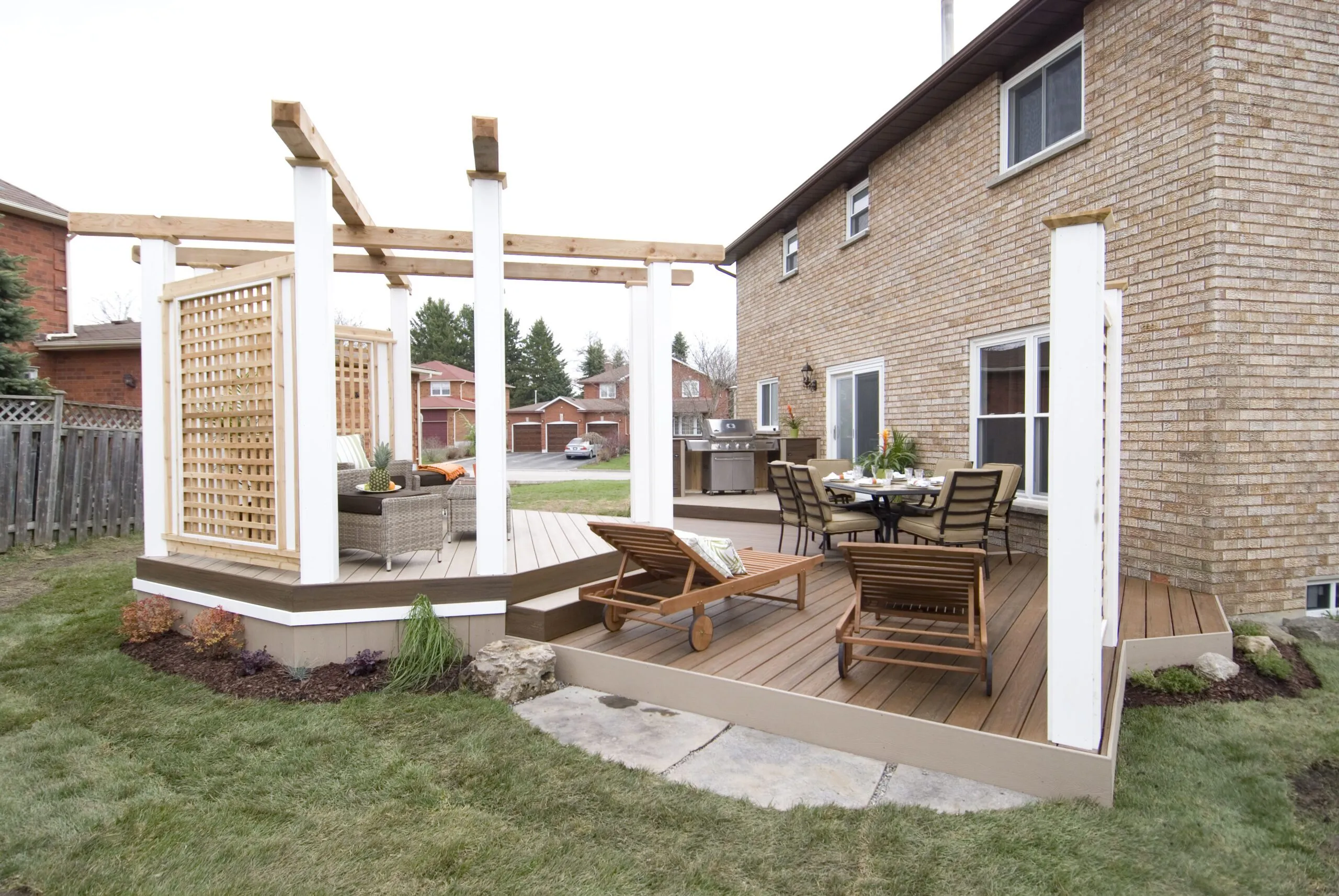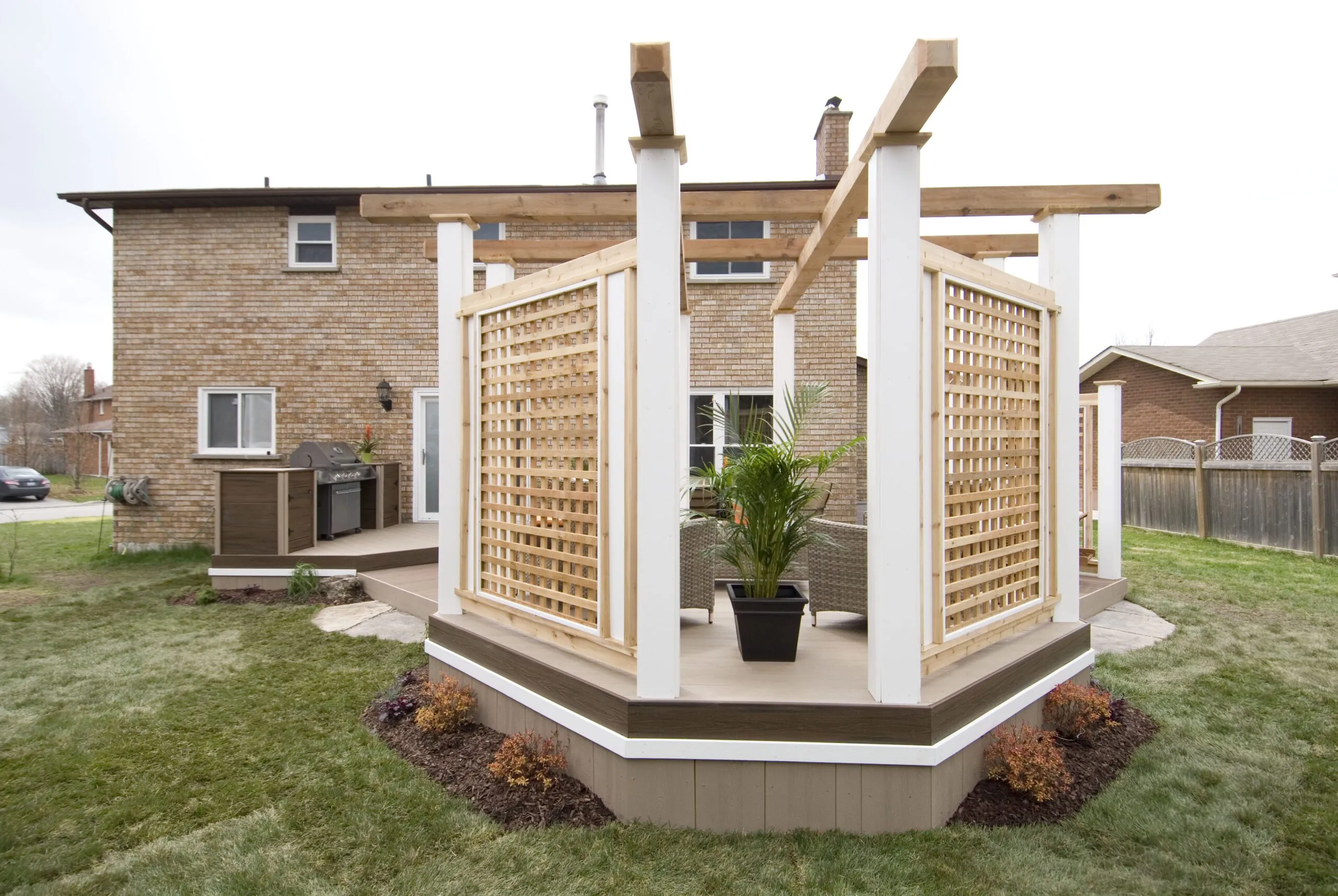 An elevated octagon-shaped deck that defines the space with symmetry and style. Features a central dining zone under a white pergola with surrounding privacy screens.