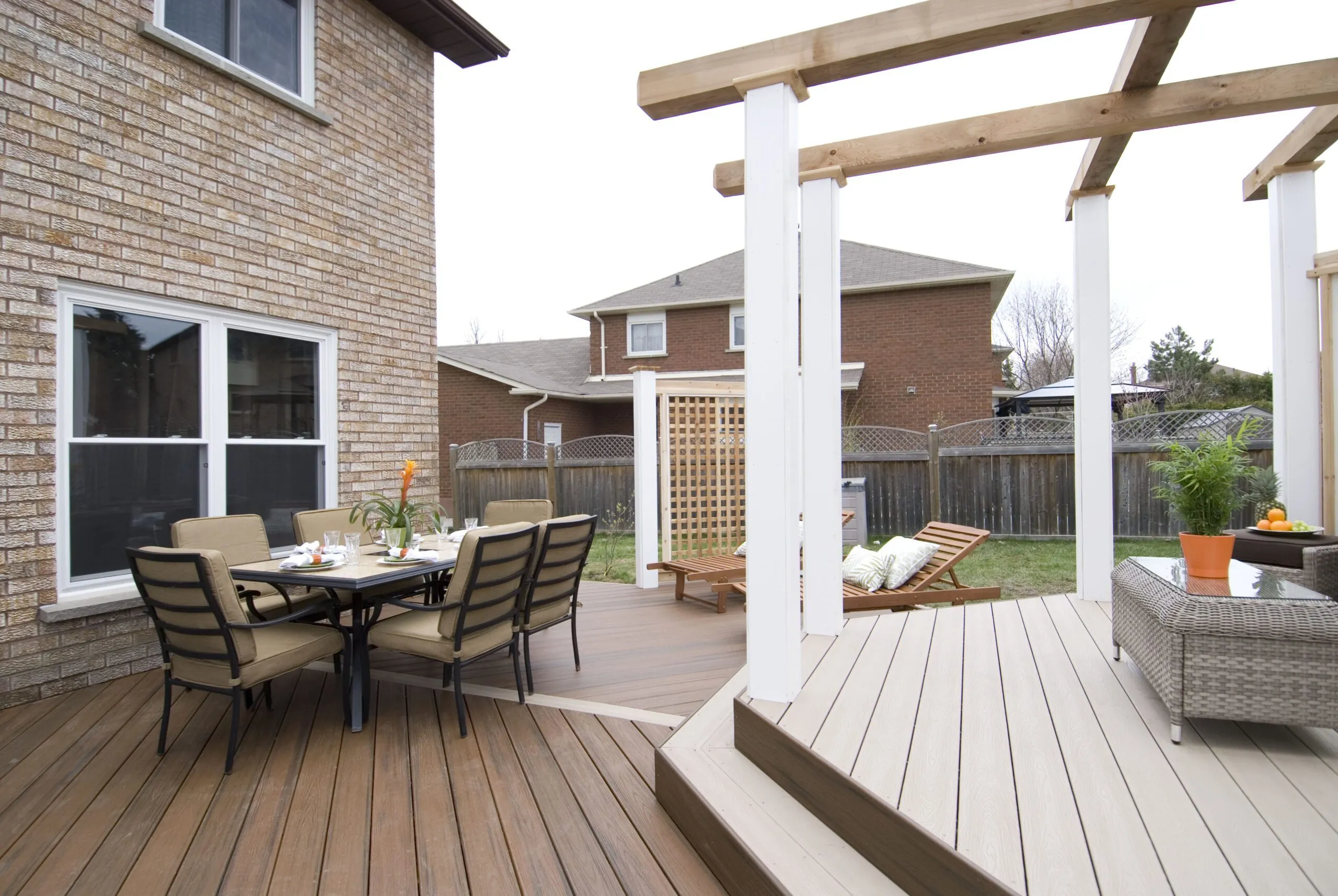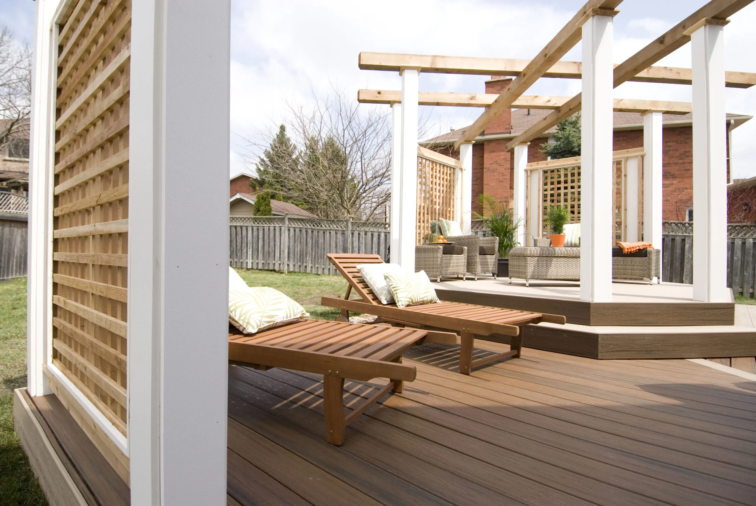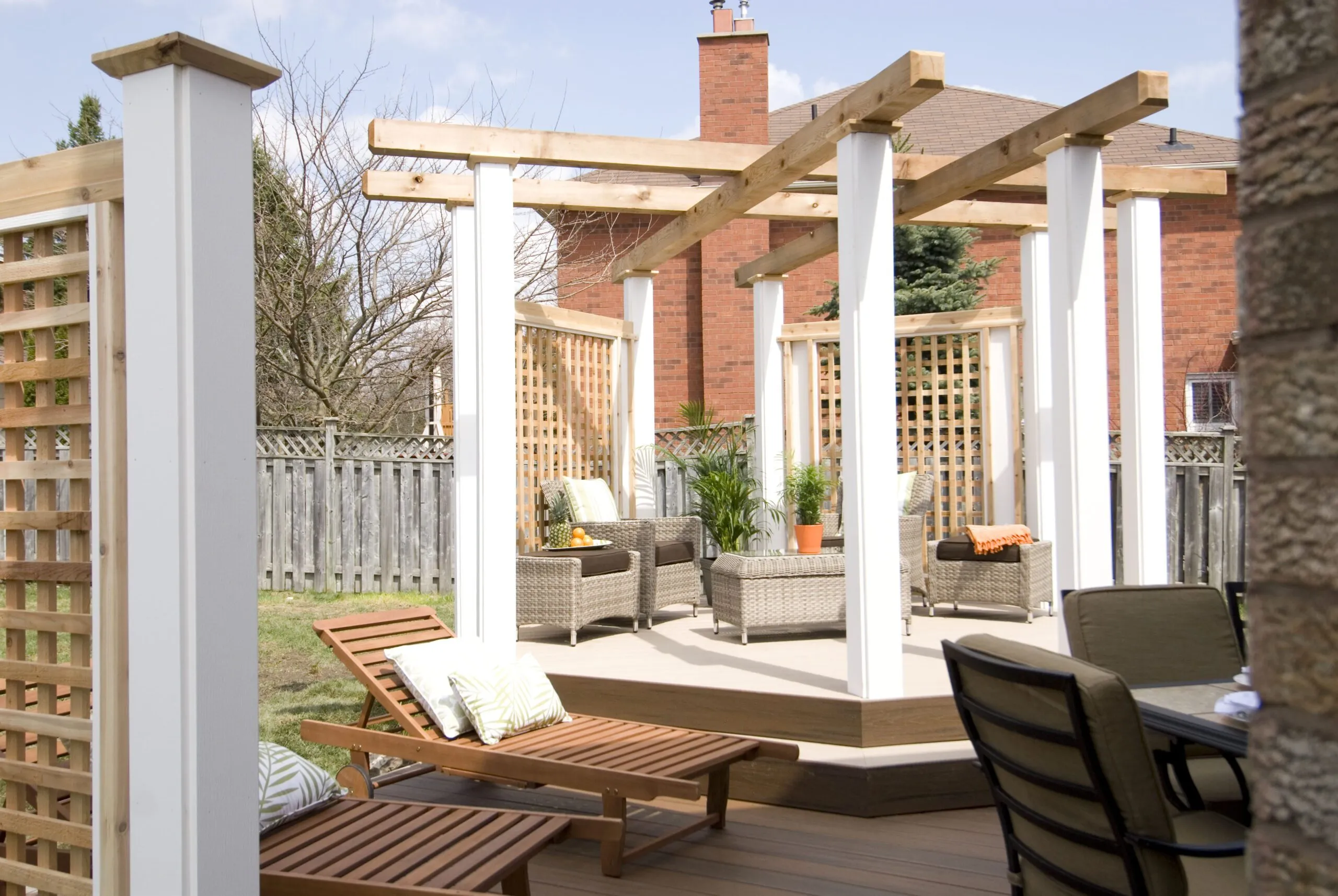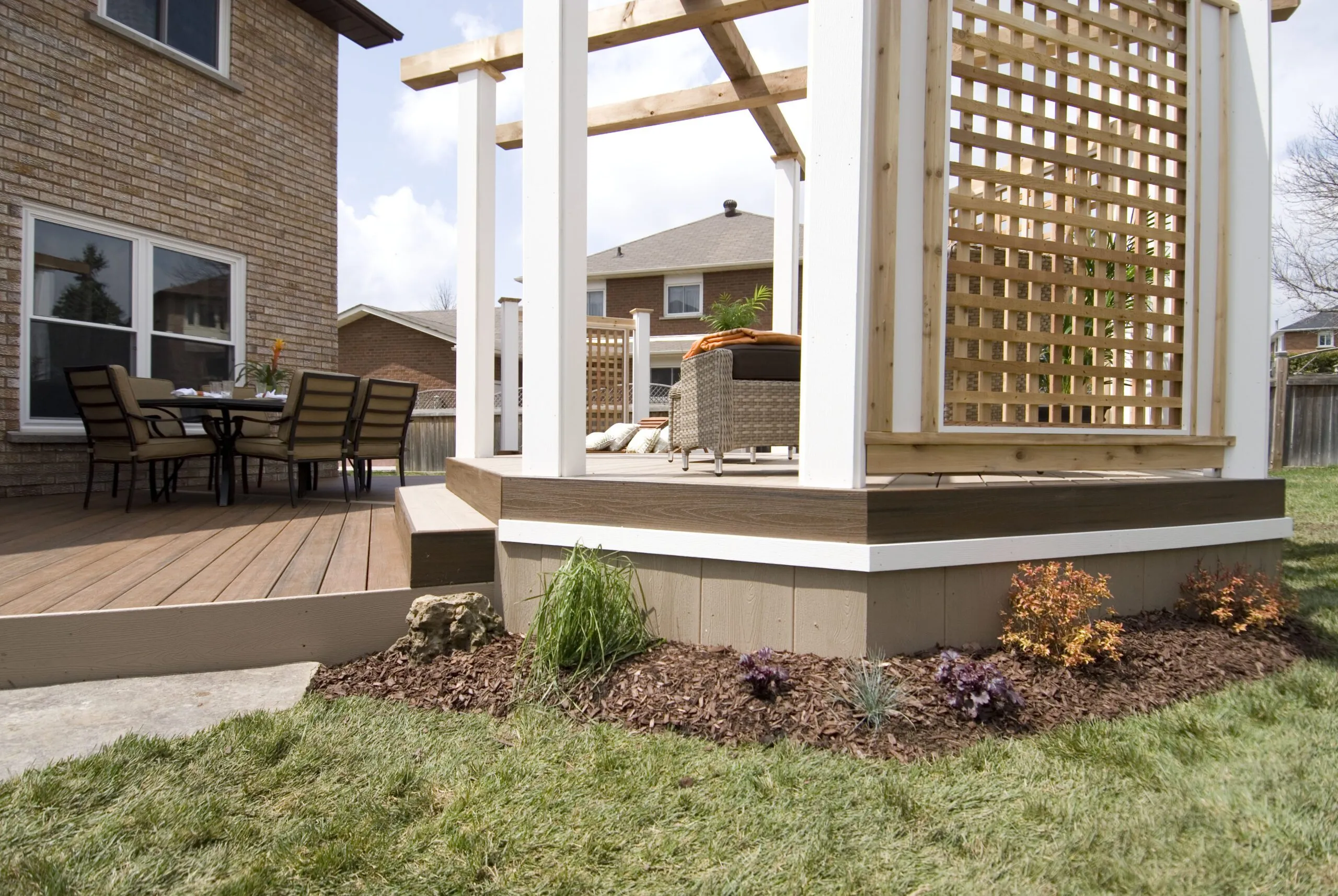 An elevated octagon-shaped deck that defines the space with symmetry and style. Features a central dining zone under a white pergola with surrounding privacy screens.