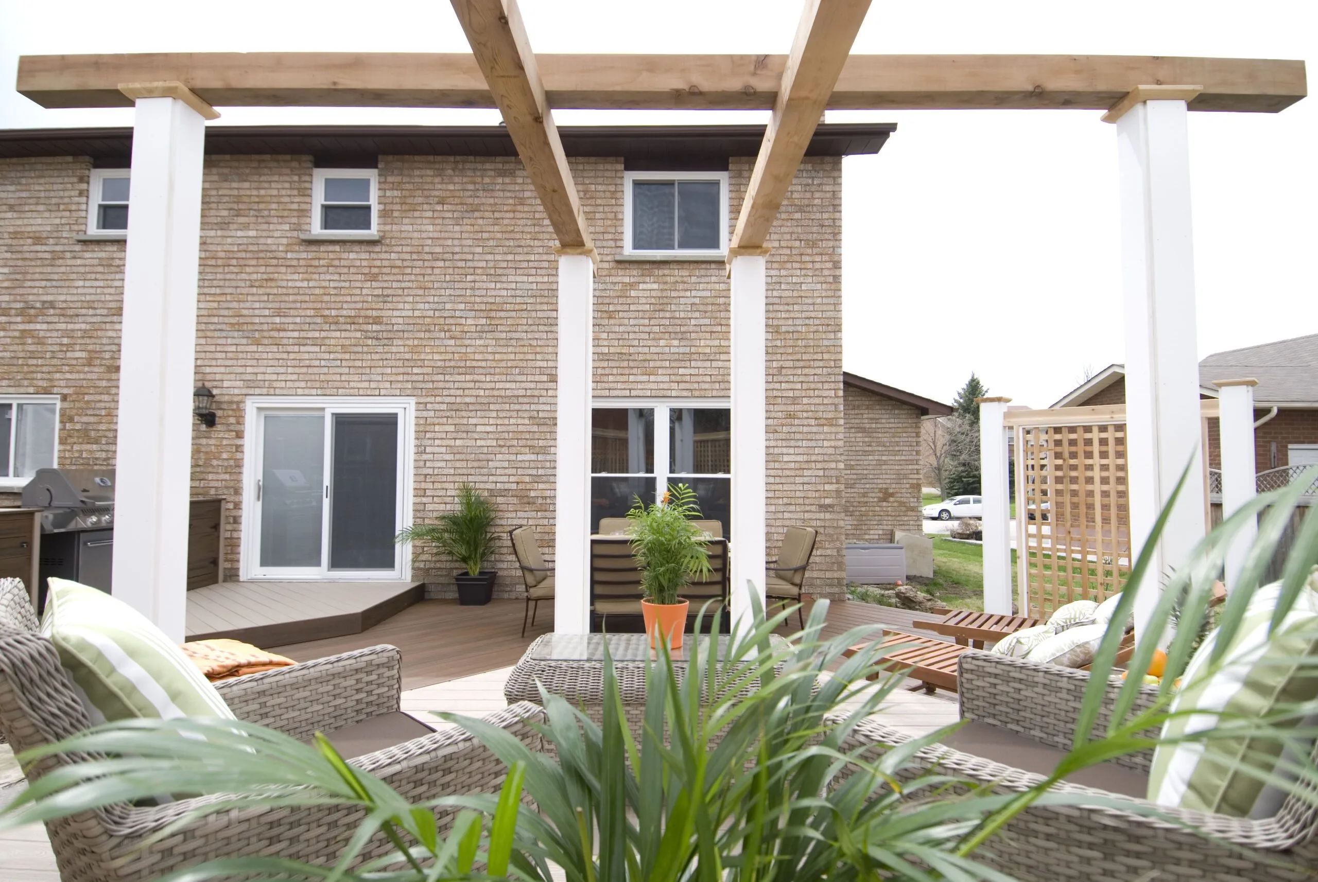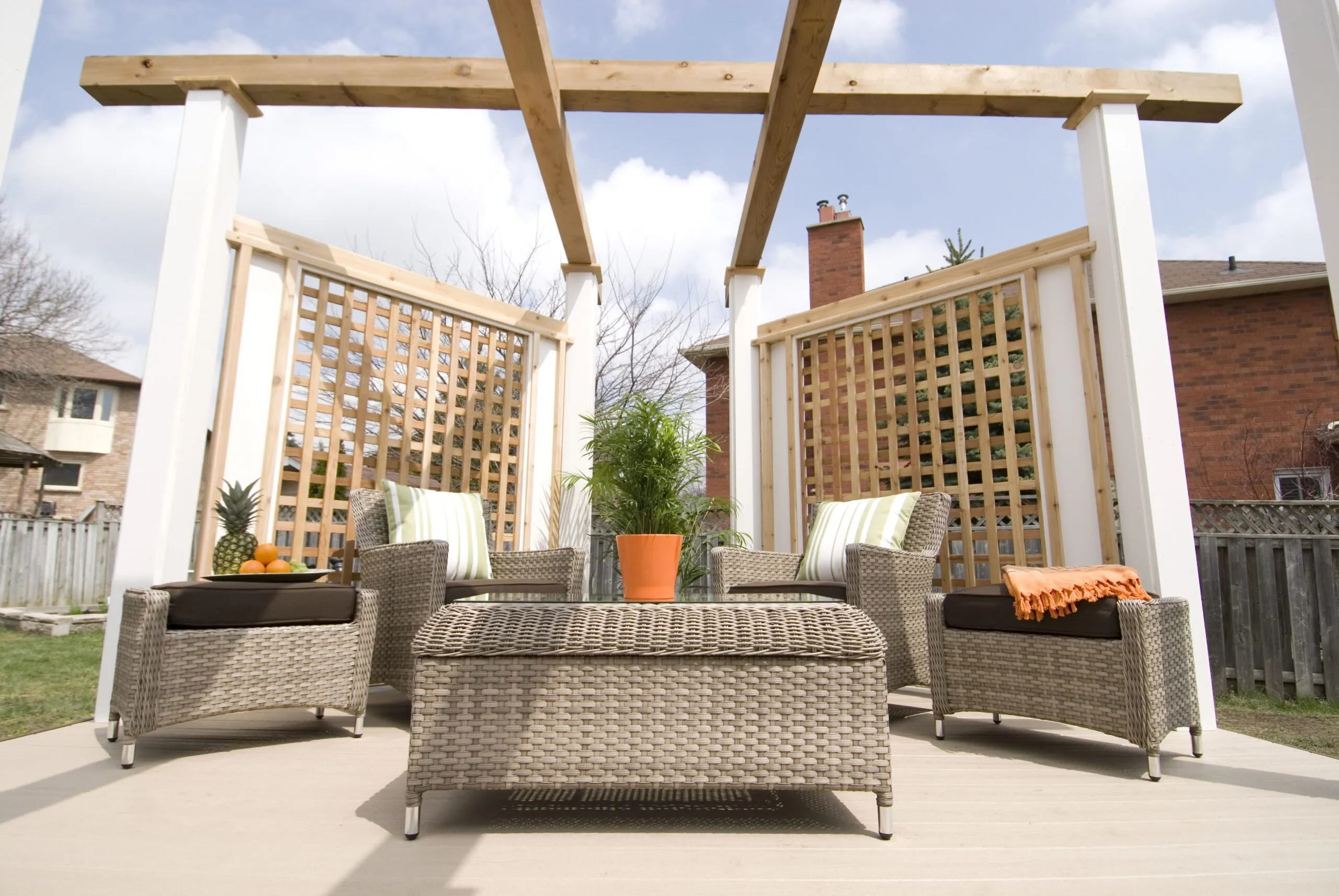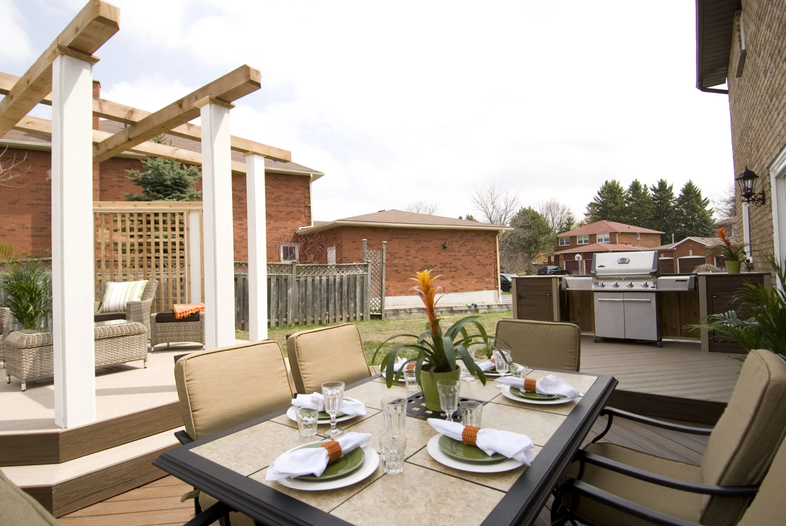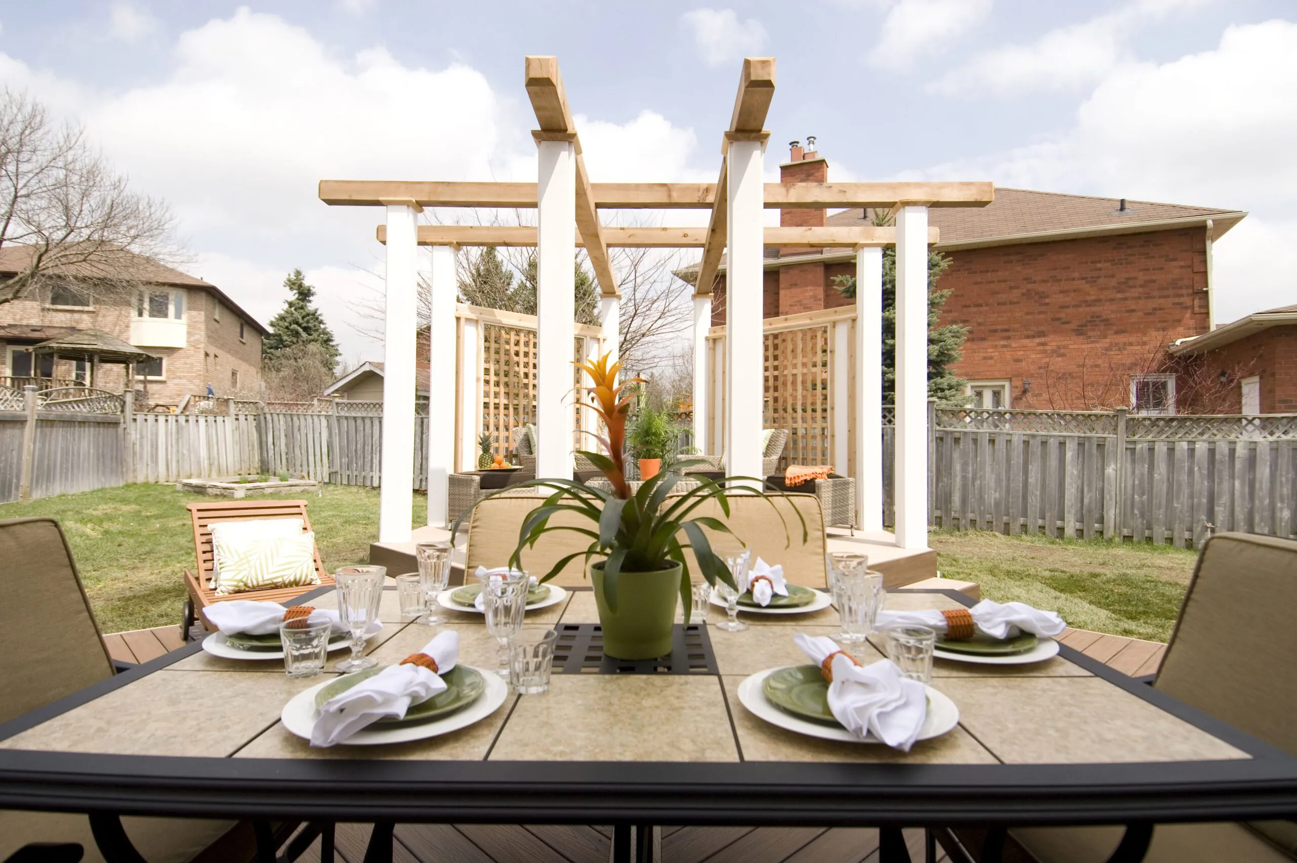 An elevated octagon-shaped deck that defines the space with symmetry and style. Features a central dining zone under a white pergola with surrounding privacy screens.