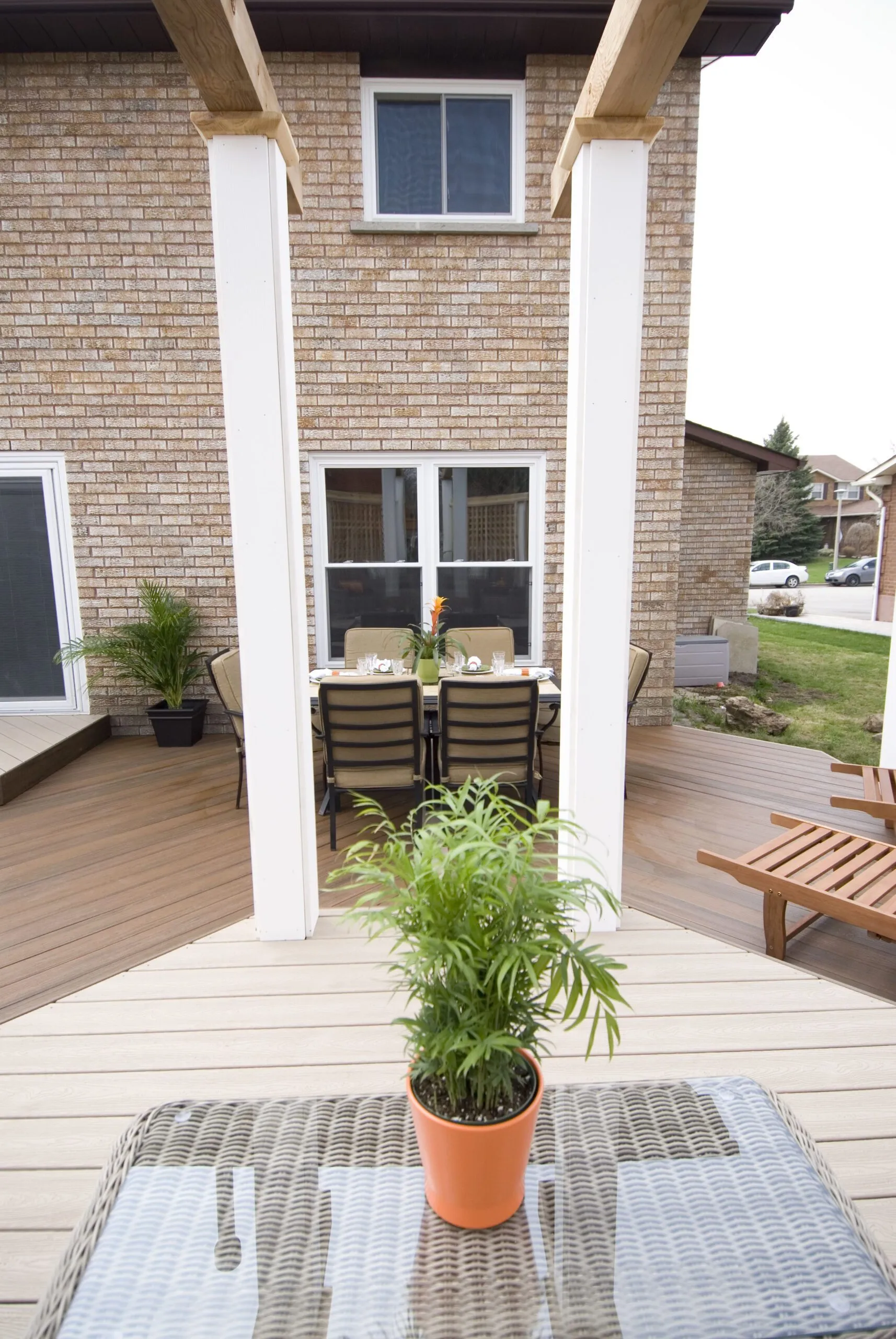 This octagon-shaped deck gave us a chance to play with symmetry while solving a few functional challenges. Raised from the yard with intentional elevation, the platform creates visual interest and defines the space without needing a full enclosure. We anchored the layout with a white pergola and custom privacy screens, giving the central dining area a sense of separation while still feeling open to the yard. Integrated stairs and clean sightlines make this a seamless extension of the home—perfect for relaxed dinners or larger gatherings.