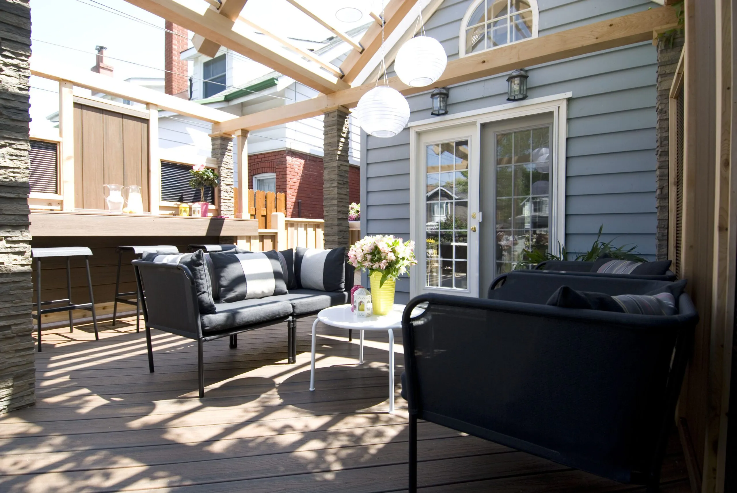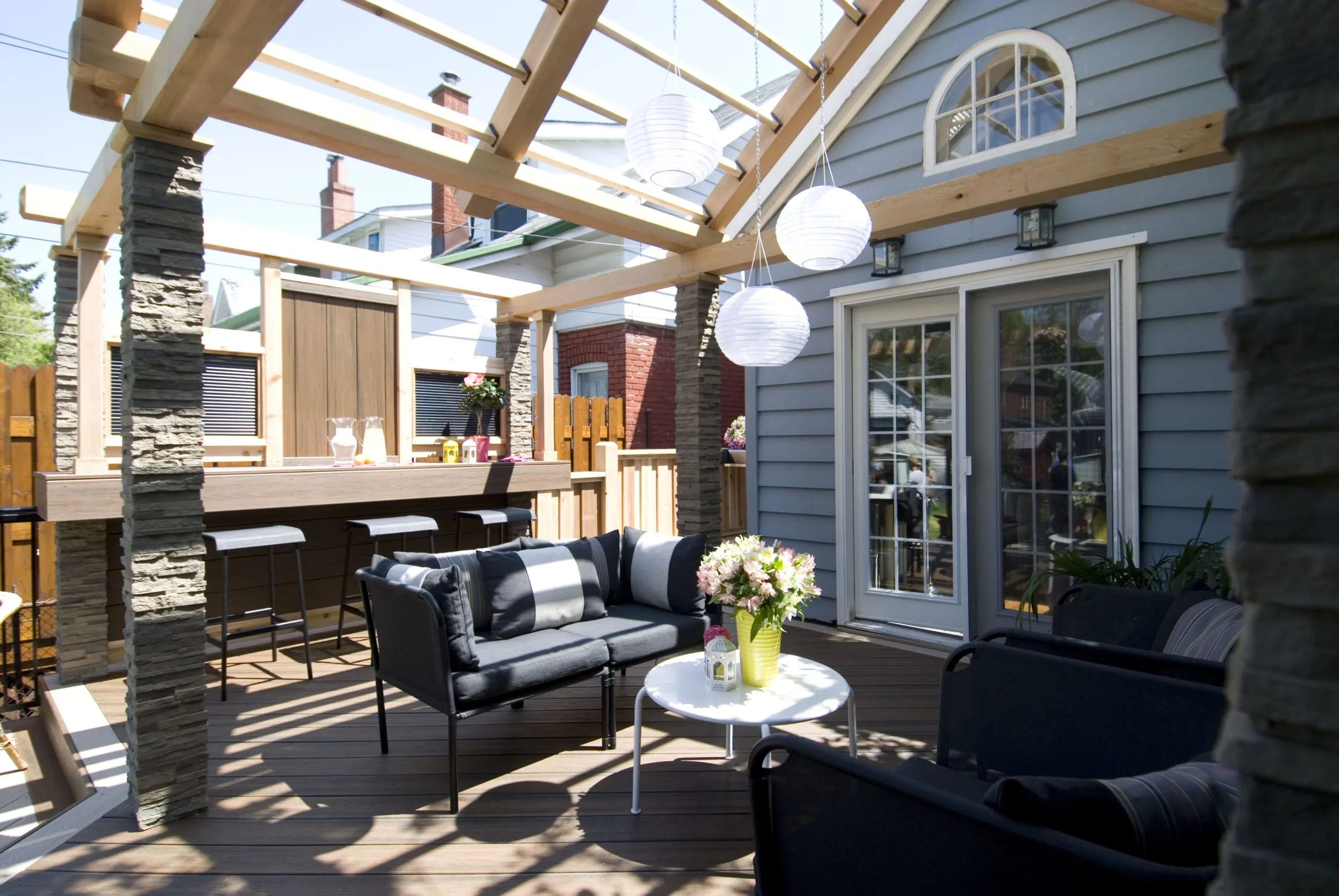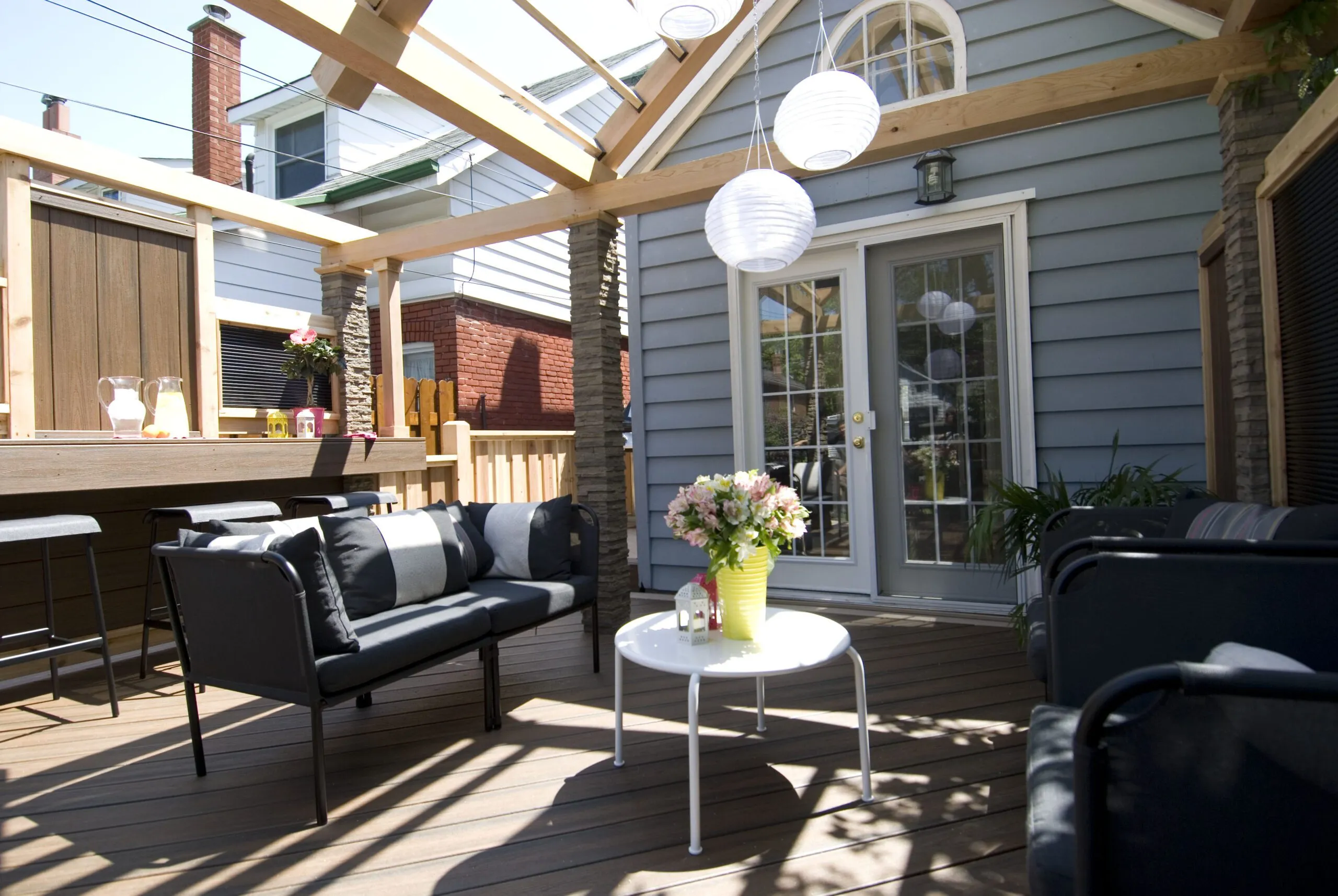 This project was all about extending the usability of outdoor space without losing the natural light. We used a see-through polycarbonate roof to keep the rain out while still letting sunlight filter in—so even on cloudy days, the deck stays bright and welcoming. We created distinct areas for lounging, dining, and entertaining, while keeping the design open and cohesive. The materials were chosen for durability and warmth, with wood finishes that bring a cozy feel to the space. Whether it’s a quiet morning coffee or a dinner with friends, this deck works year-round—and looks good doing it.