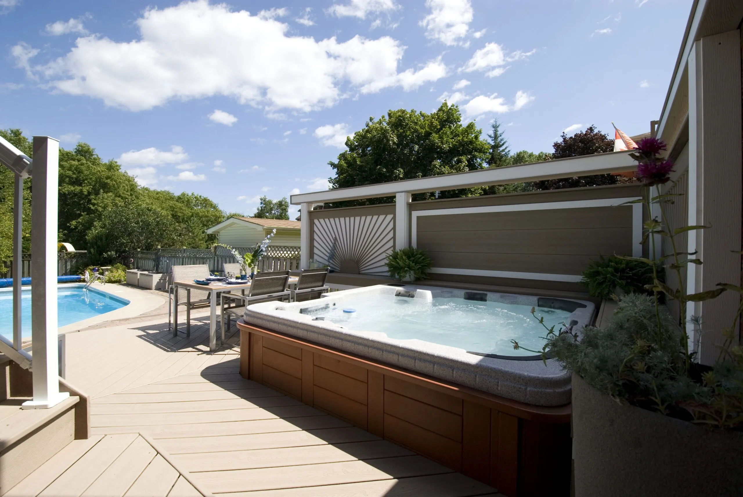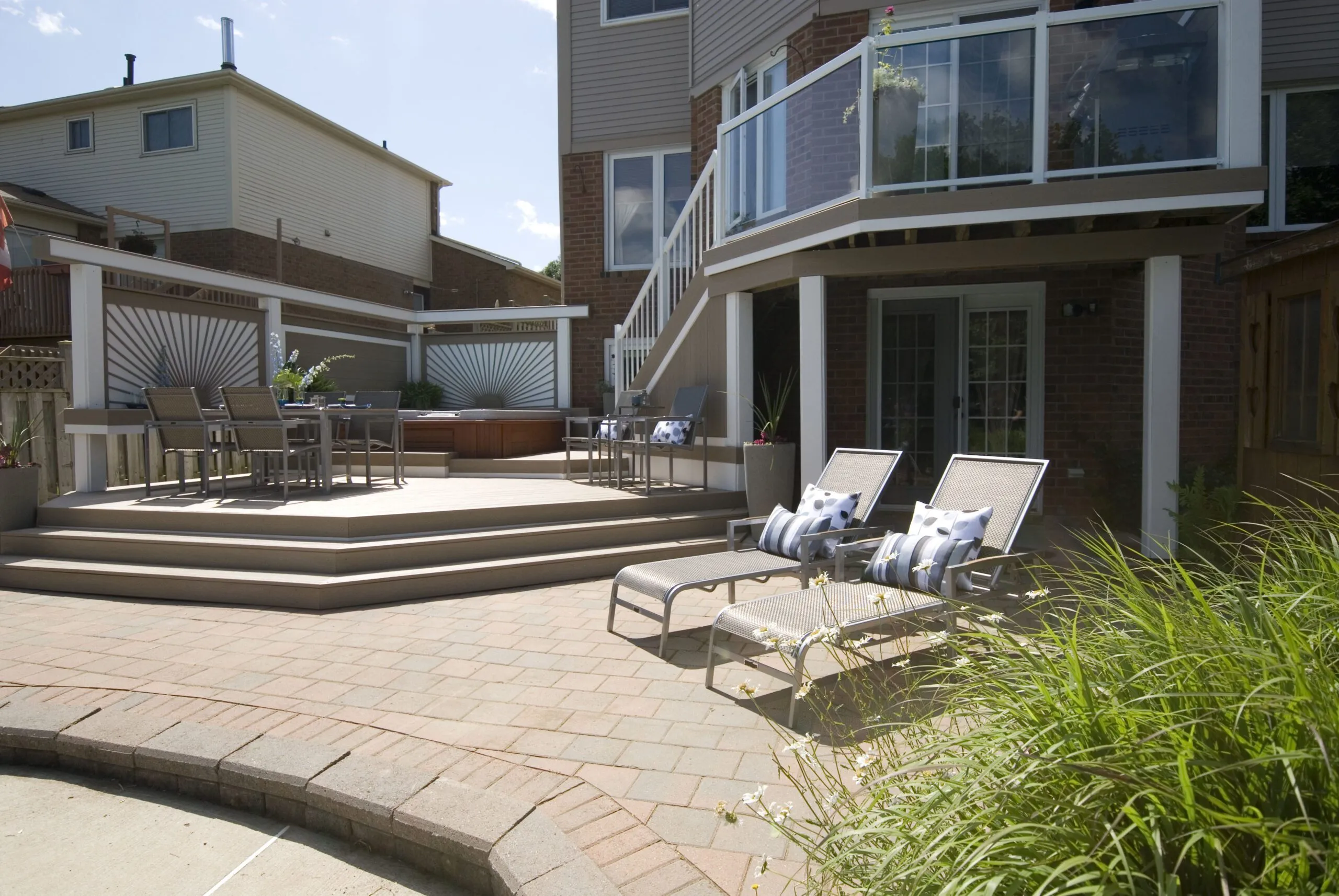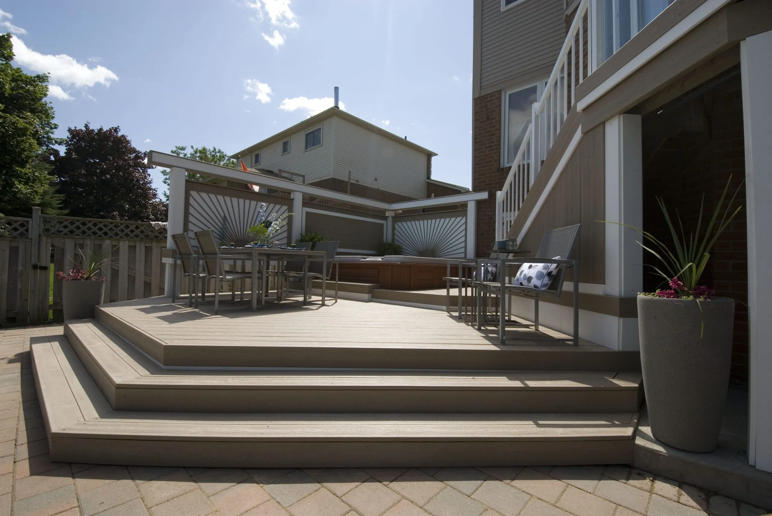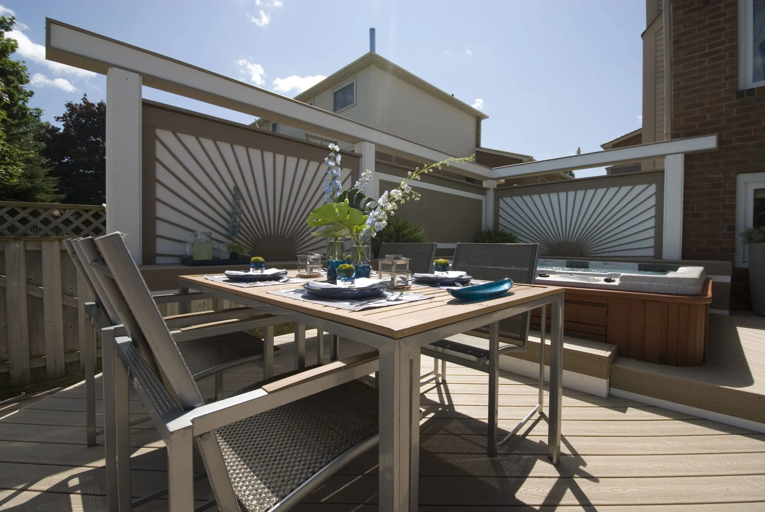This deck was designed to bring structure and comfort to a busy backyard with a pool, hot tub, and multiple access points. We created two distinct levels: one for soaking up the sun and lounging by the water, and one for more private, shaded moments—including a dedicated space for the hot tub. The standout feature here is the custom privacy screen with a sunburst pattern. It filters sunlight in an artistic way and provides a visual break from the surrounding environment. The layout gives each zone a clear function while still keeping the flow open and inviting. Whether it's family barbecues, pool parties, or a quiet evening soak, this deck is built for it all.