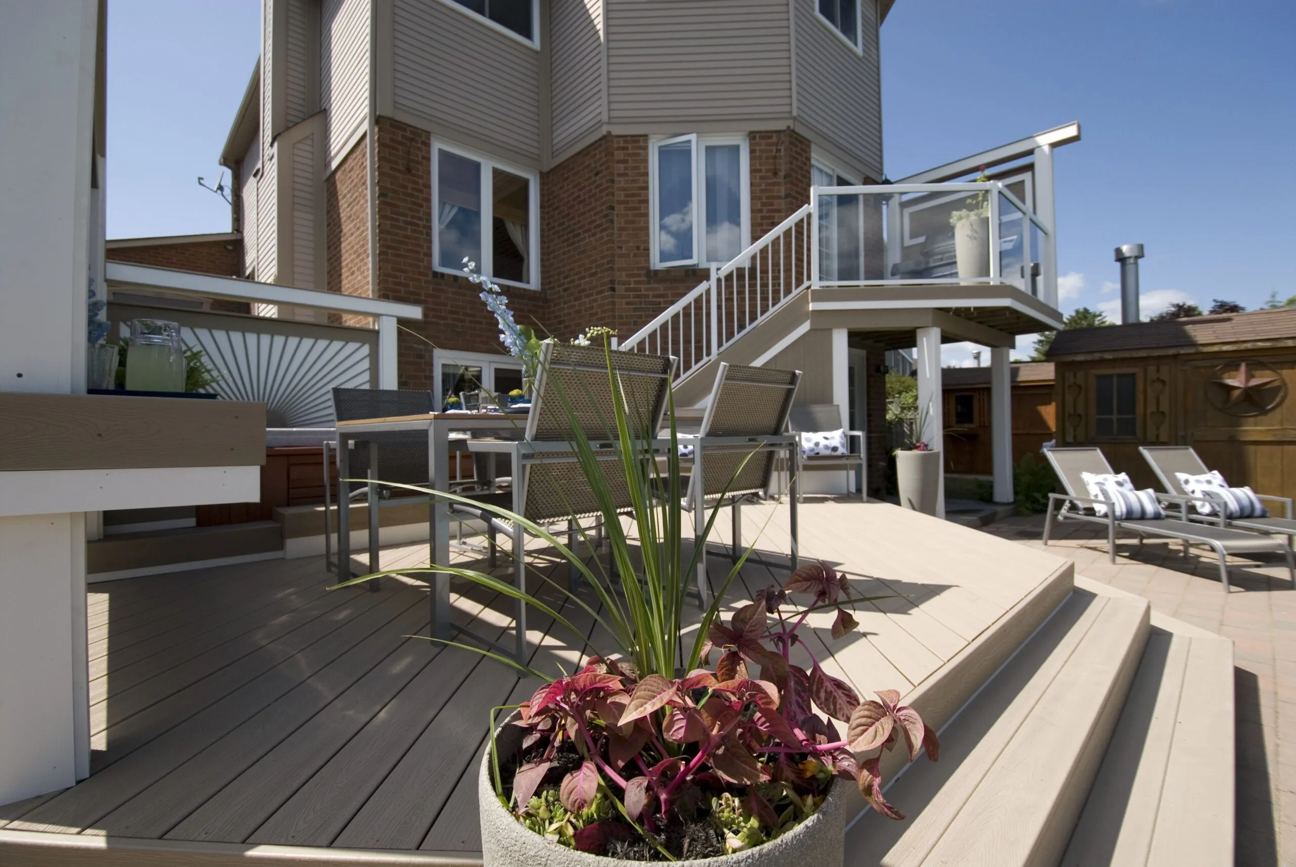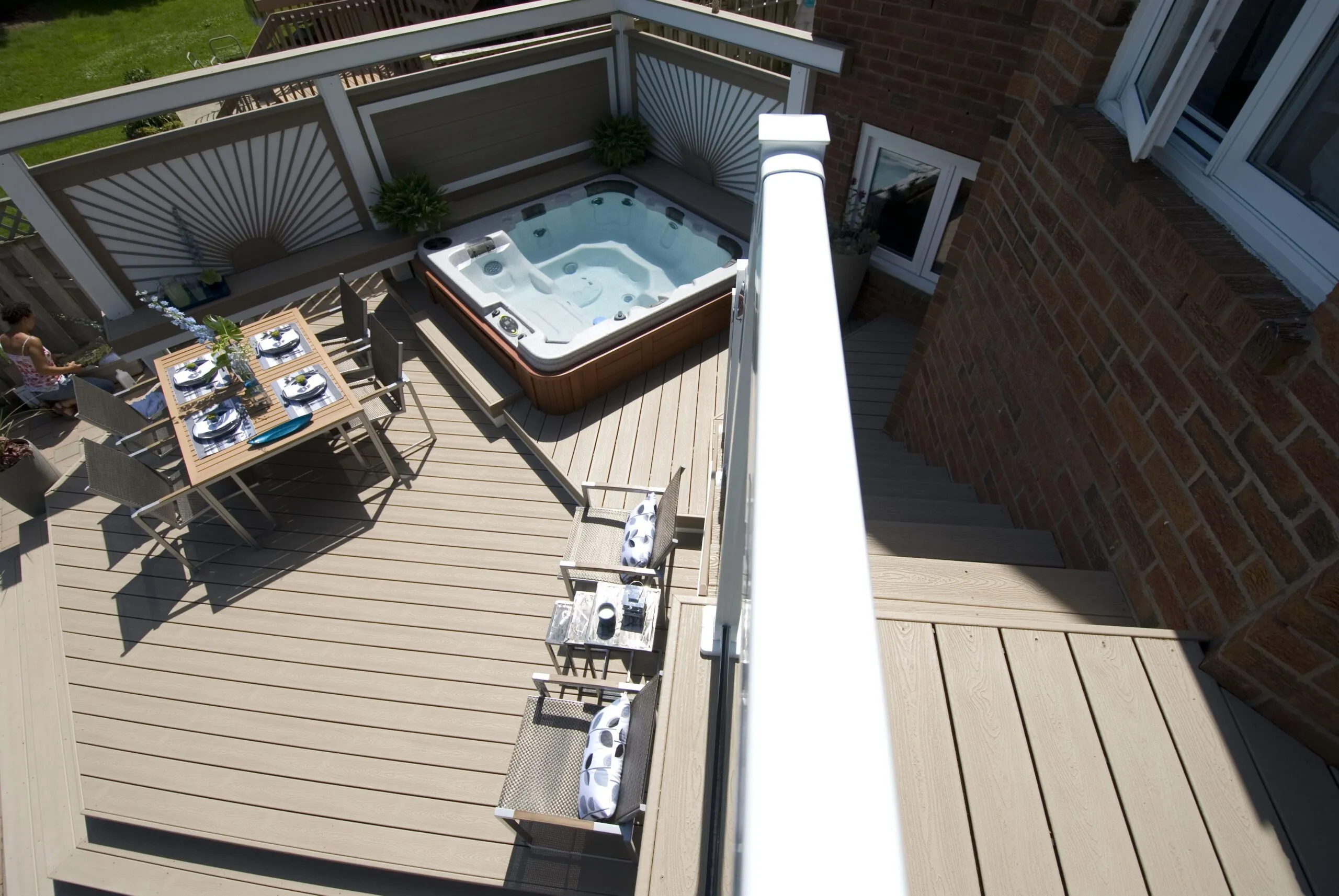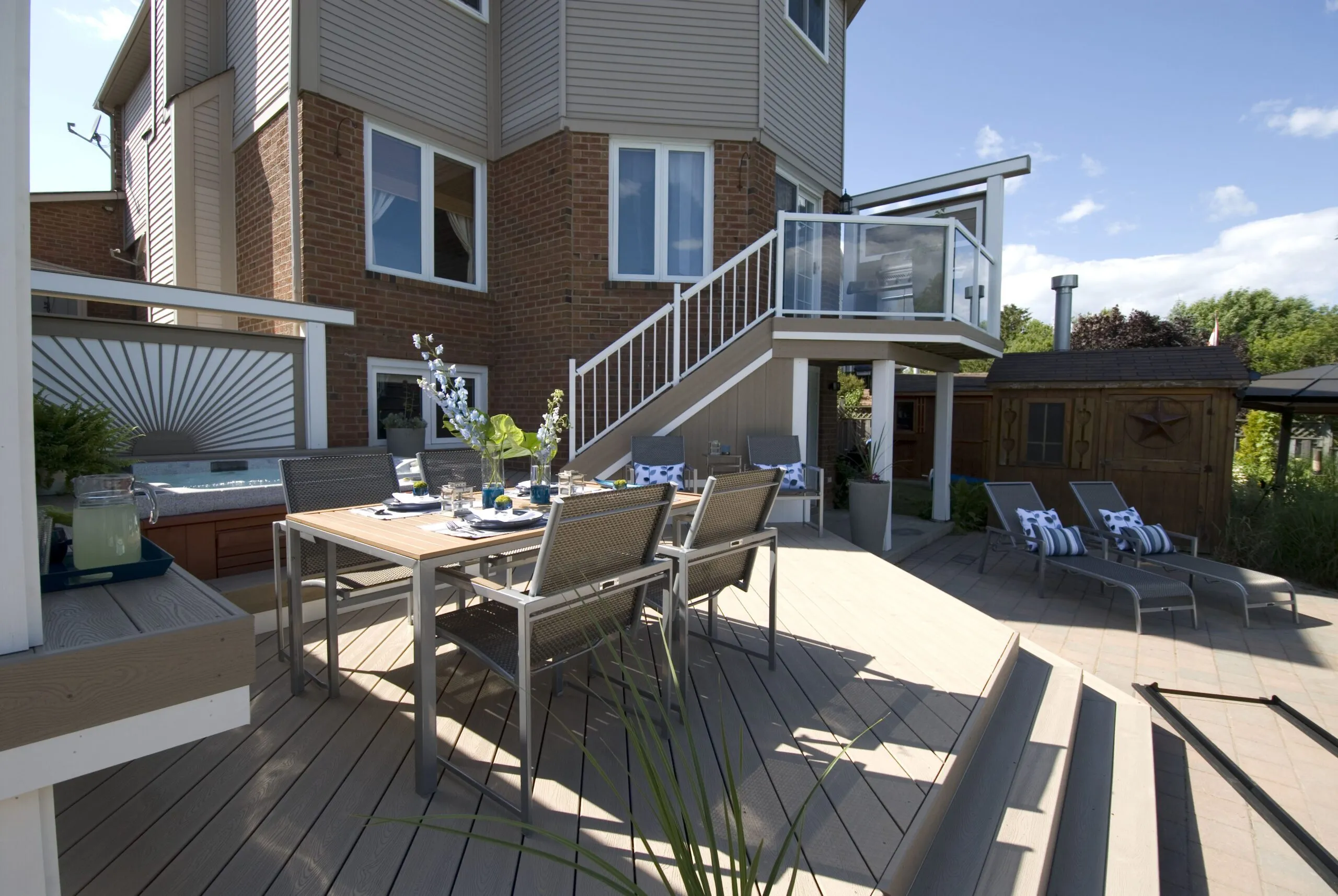 This deck was designed to bring structure and comfort to a busy backyard with a pool, hot tub, and multiple access points. We created two distinct levels: one for soaking up the sun and lounging by the water, and one for more private, shaded moments—including a dedicated space for the hot tub. The standout feature here is the custom privacy screen with a sunburst pattern. It filters sunlight in an artistic way and provides a visual break from the surrounding environment. The layout gives each zone a clear function while still keeping the flow open and inviting. Whether it's family barbecues, pool parties, or a quiet evening soak, this deck is built for it all.