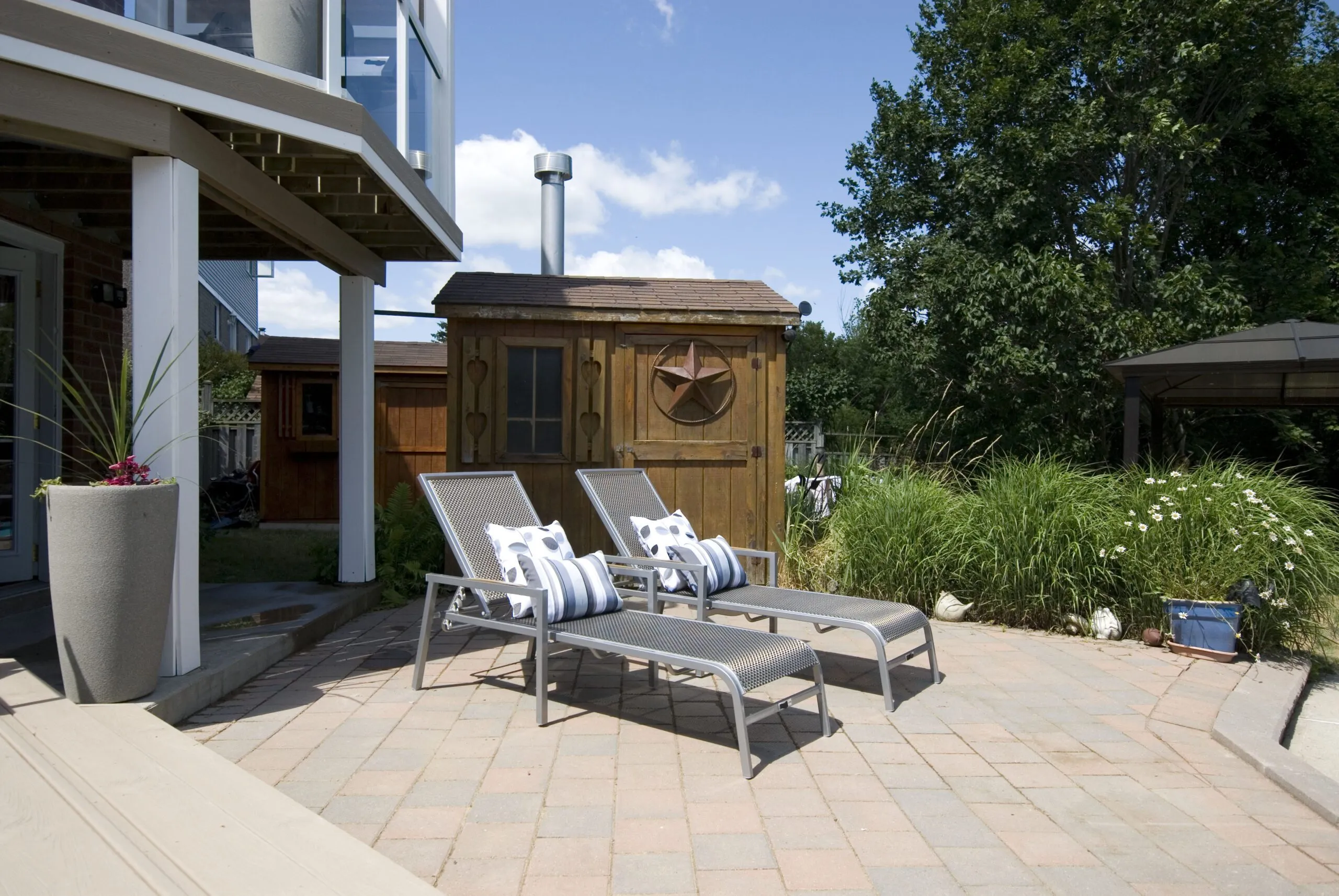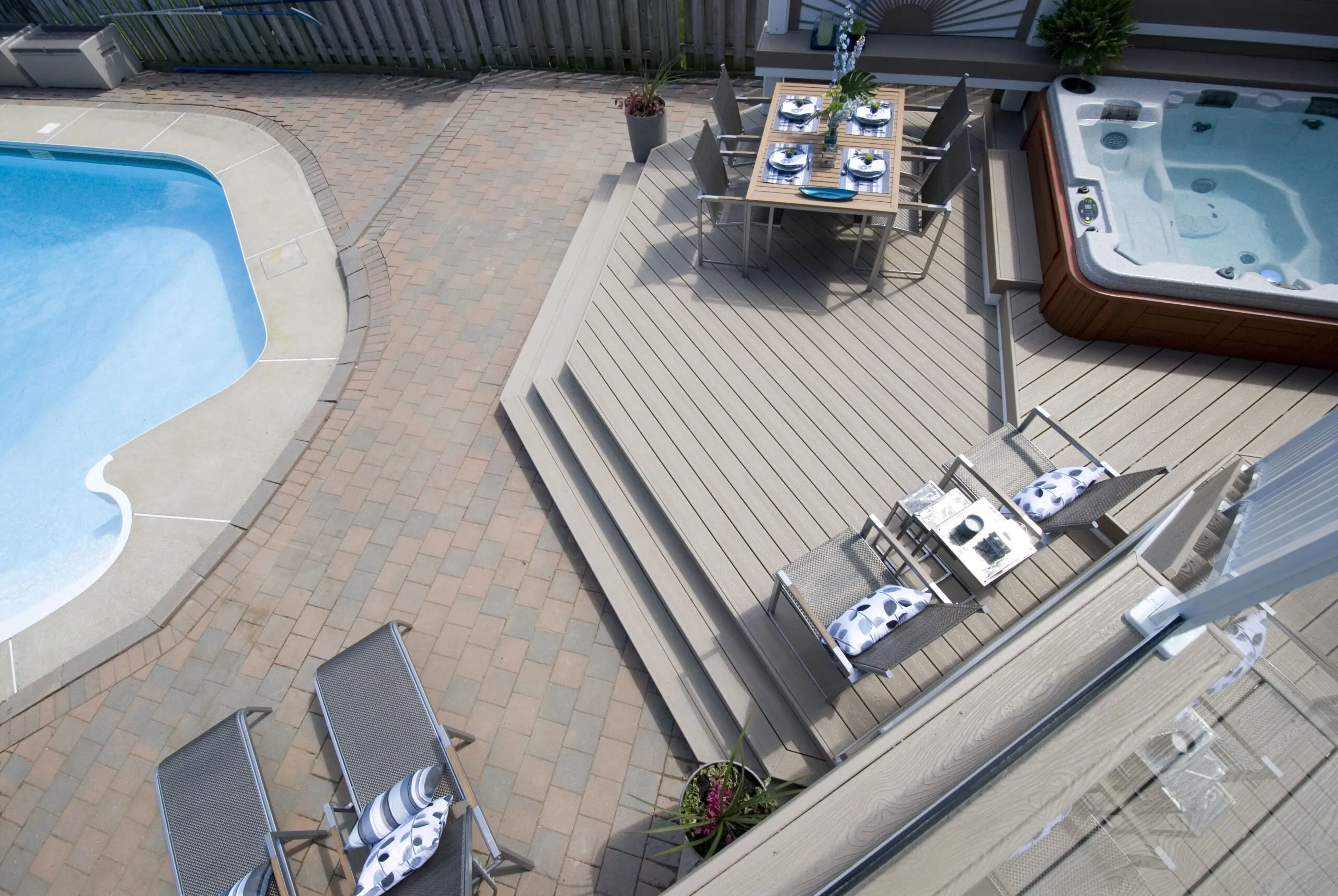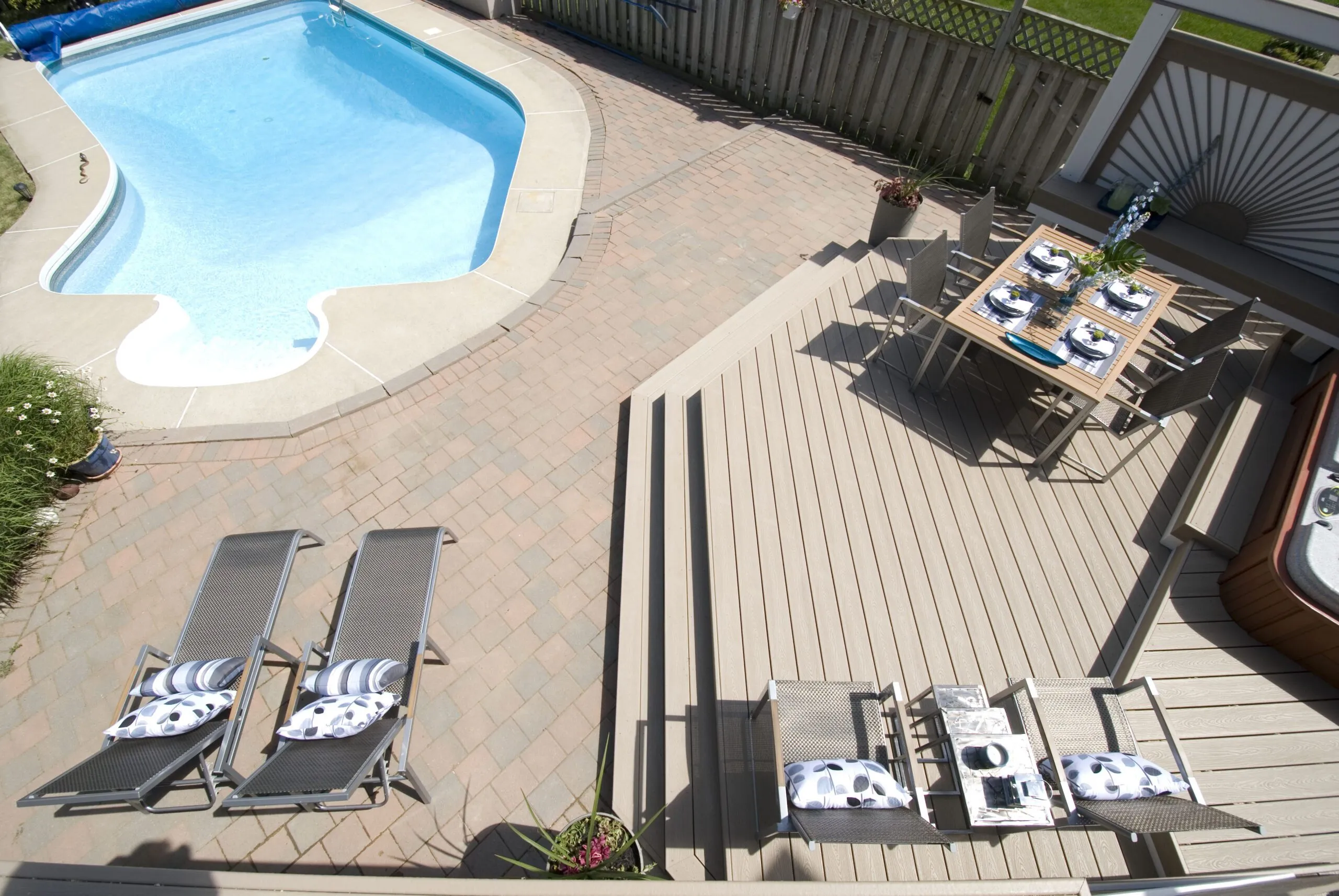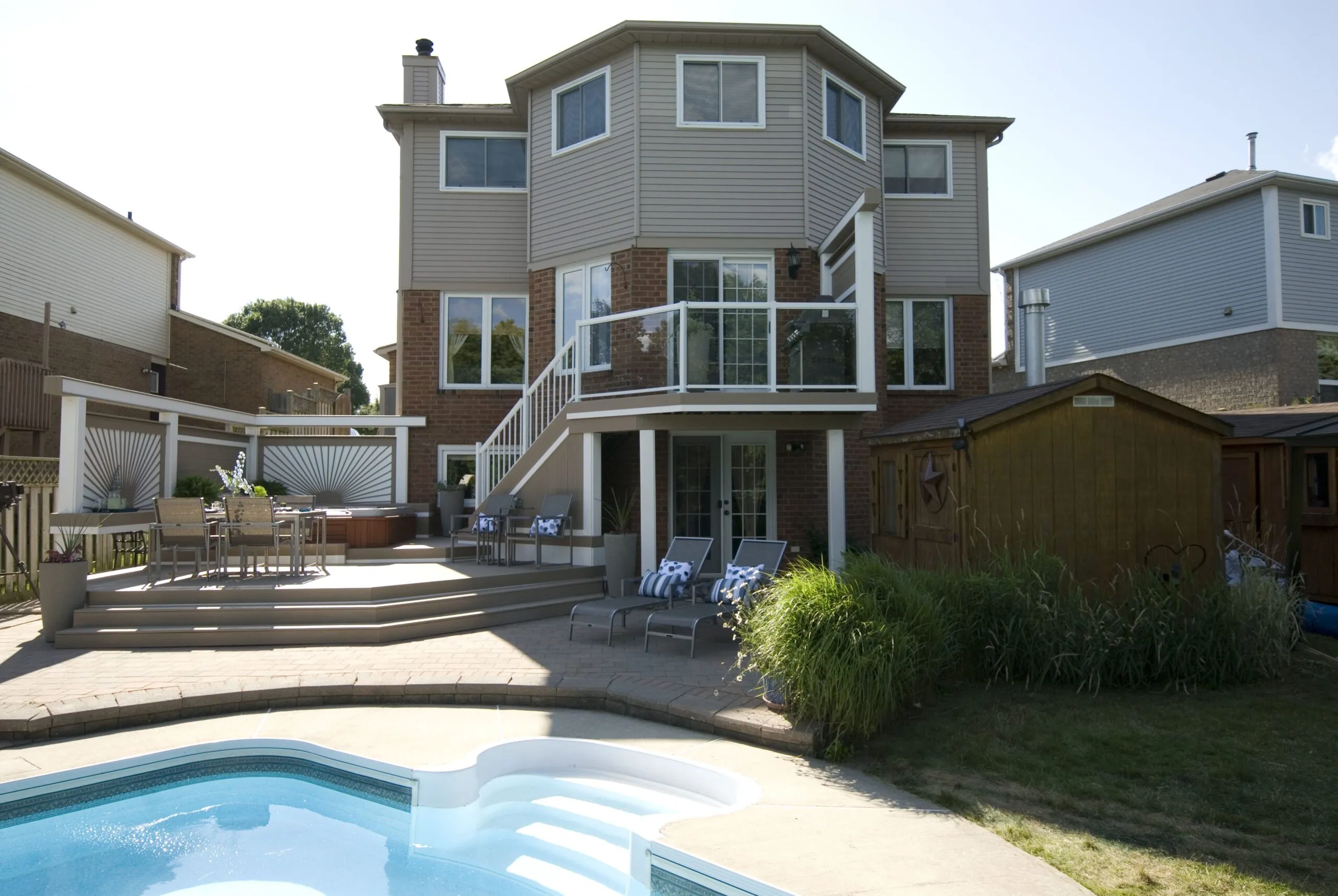 This deck was designed to bring structure and comfort to a busy backyard with a pool, hot tub, and multiple access points. We created two distinct levels: one for soaking up the sun and lounging by the water, and one for more private, shaded moments—including a dedicated space for the hot tub. The standout feature here is the custom privacy screen with a sunburst pattern. It filters sunlight in an artistic way and provides a visual break from the surrounding environment. The layout gives each zone a clear function while still keeping the flow open and inviting. Whether it's family barbecues, pool parties, or a quiet evening soak, this deck is built for it all.