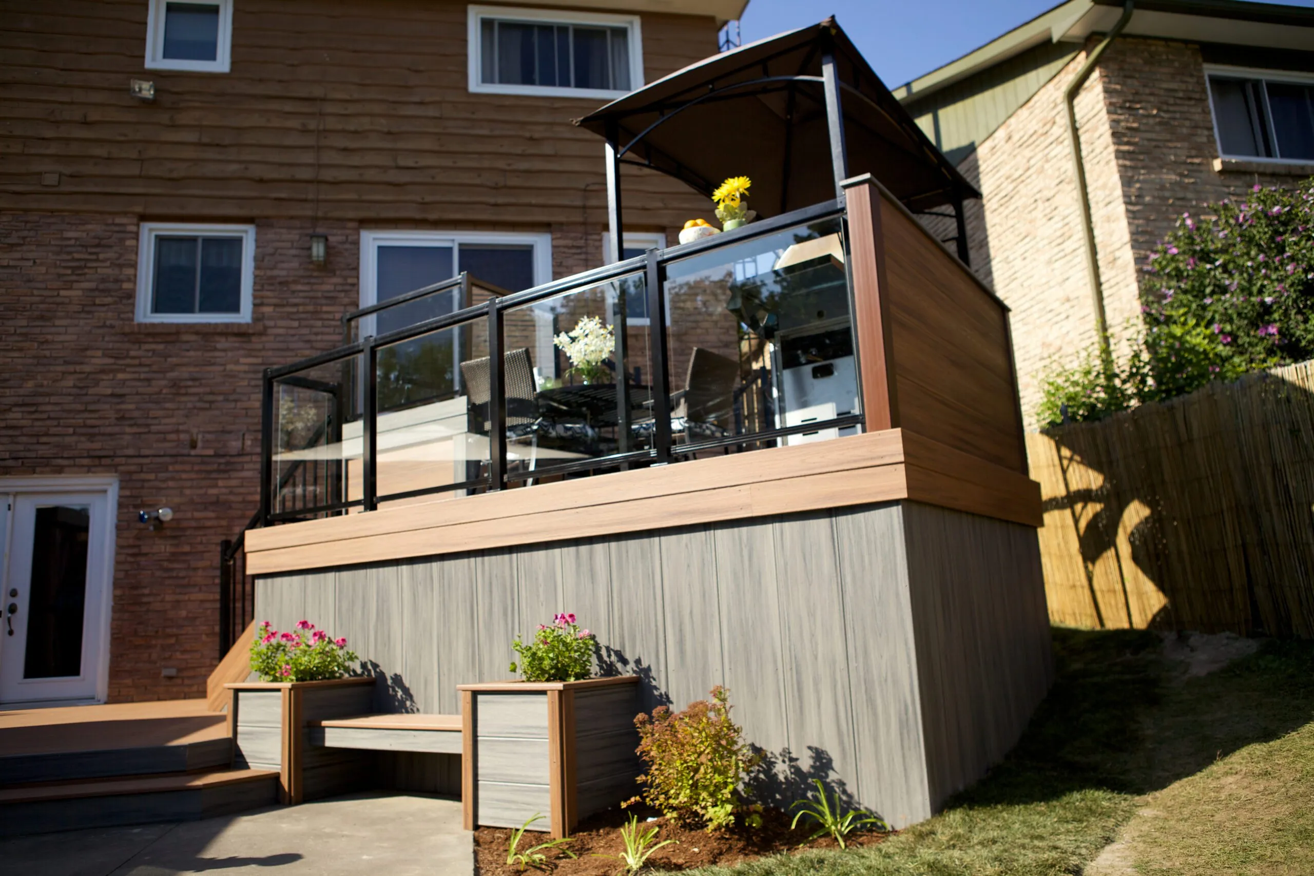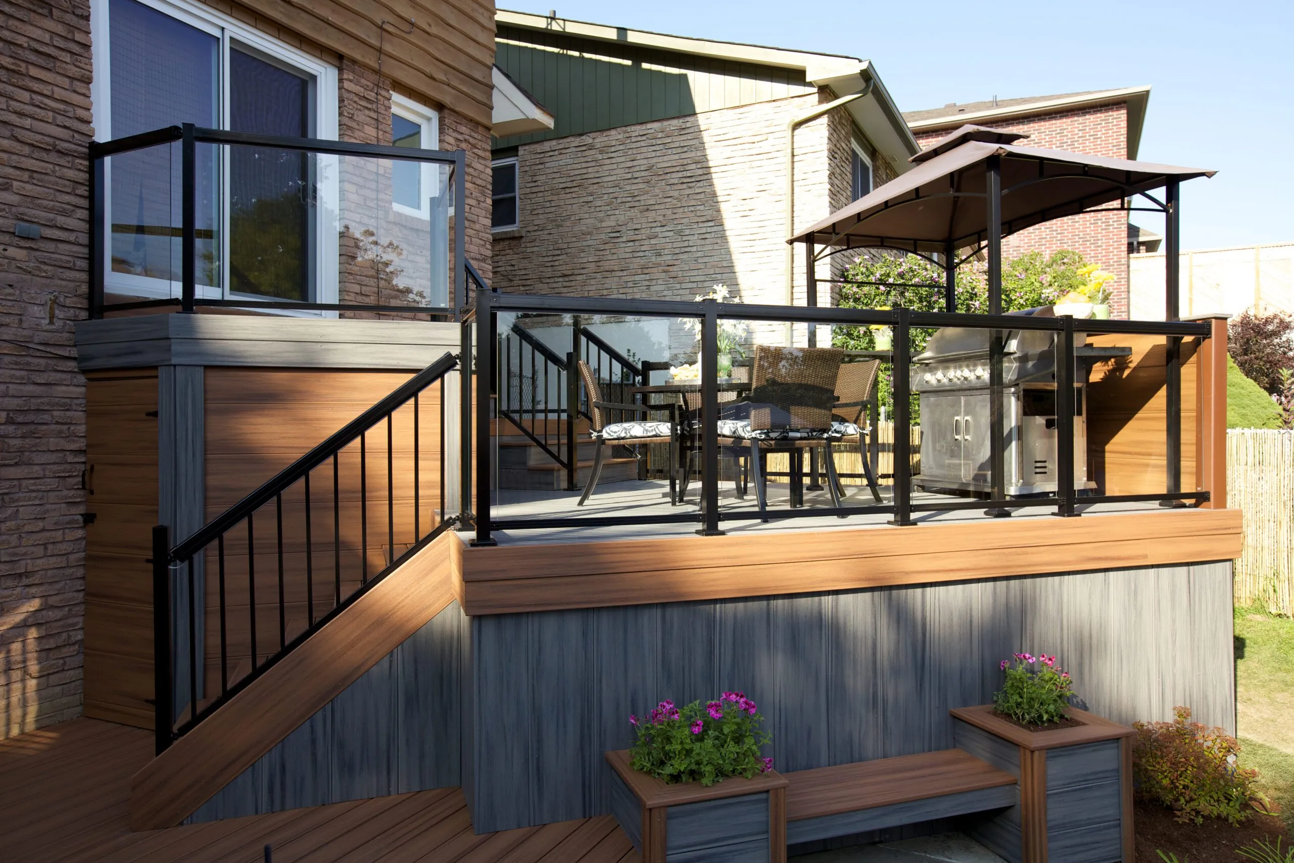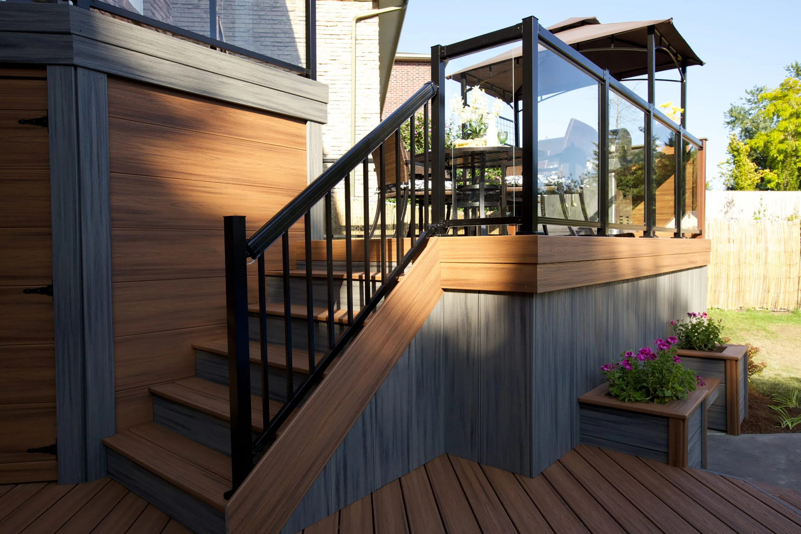 A full deck rebuild and redesign to replace a structurally unsafe original build. New layout includes safer stairs, reinforced framing, and modern black aluminum railings.