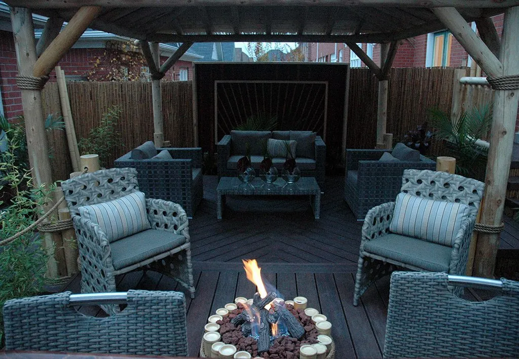 The Tiki Bar Deck is where backyard meets beach vibes. We created this intimate outdoor space for homeowners who love entertaining and want something completely out of the ordinary. The focal point is a custom-built tiki bar with tropical wood finishes, flanked by cozy lounge seating and a central fire feature that sets the tone for late-night hangouts. String lights, bamboo paneling, and playful decor give the entire area a casual, island-inspired feel. Despite its compact size, the layout is cleverly zoned to support cocktails, conversation, and relaxation—all while making a bold visual statement. Perfect for those craving a private paradise without ever leaving home, this project nails the balance between functionality and fun.