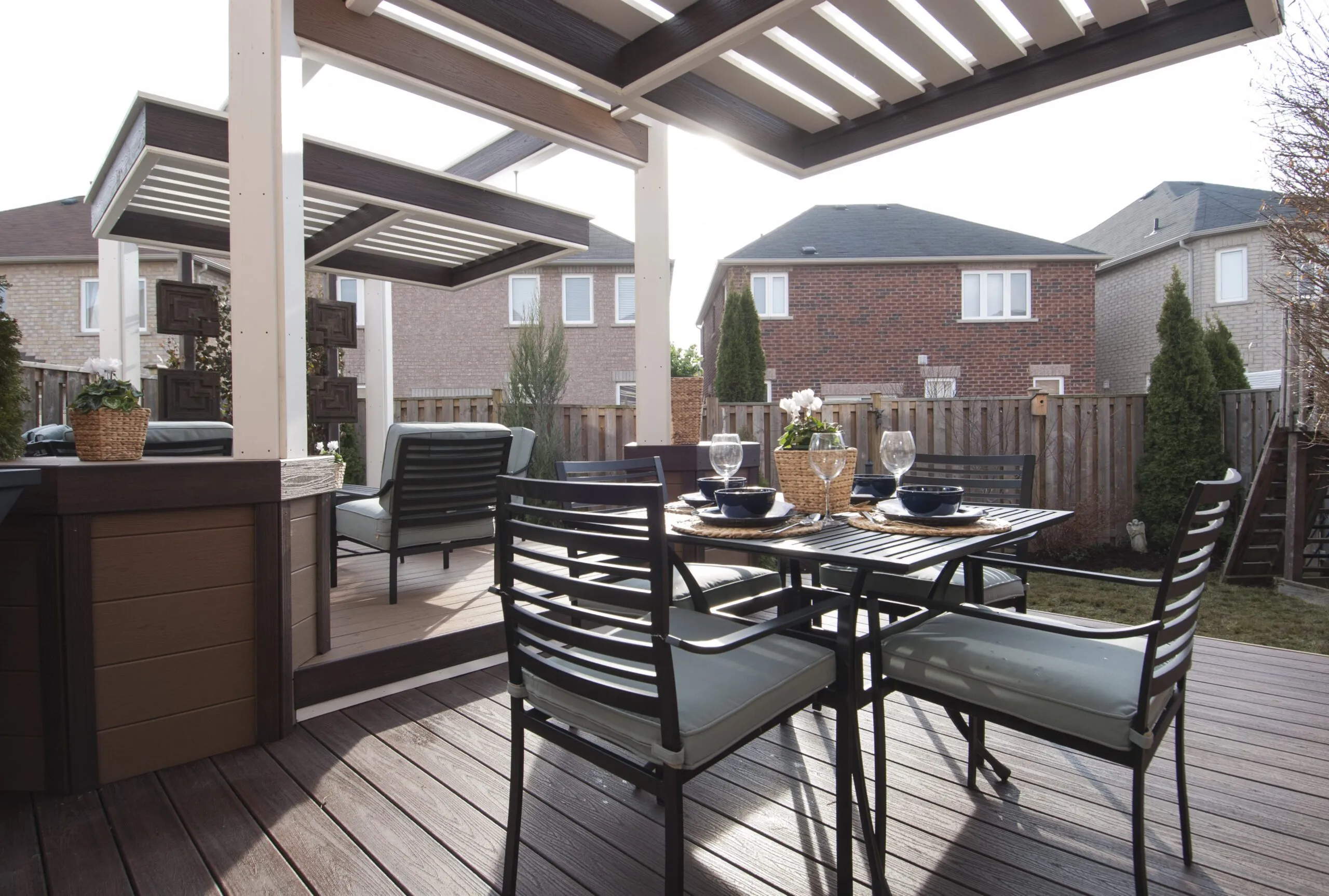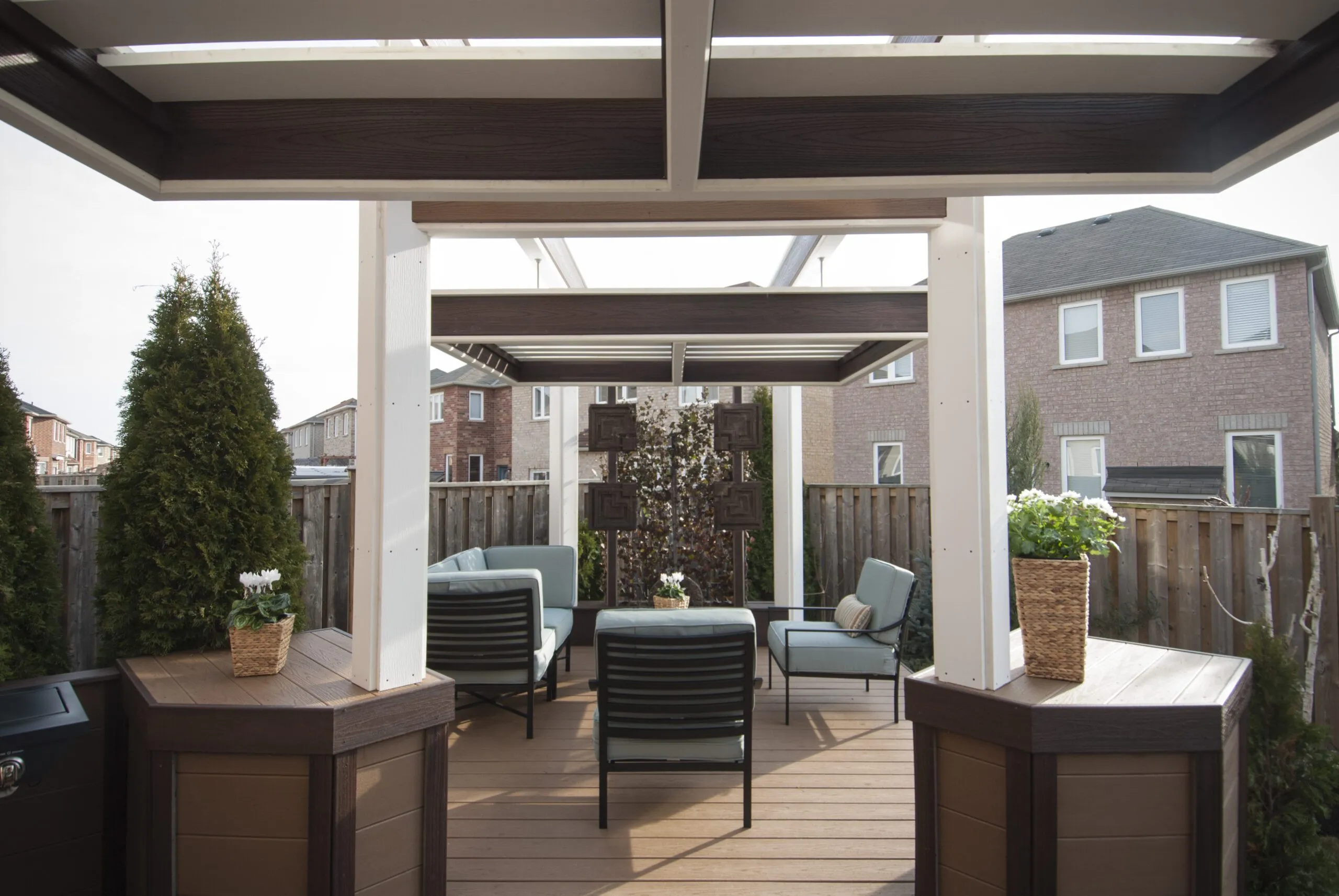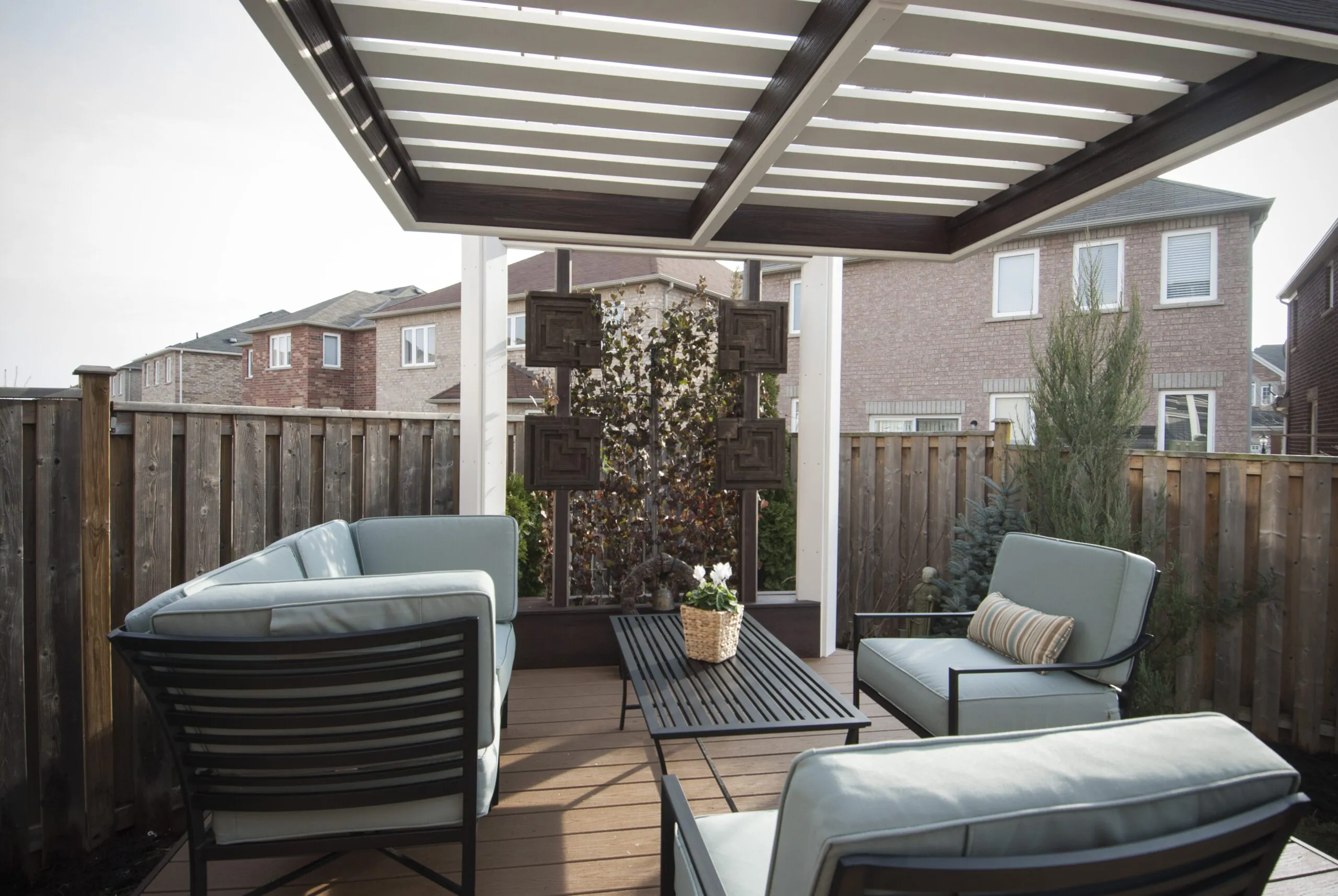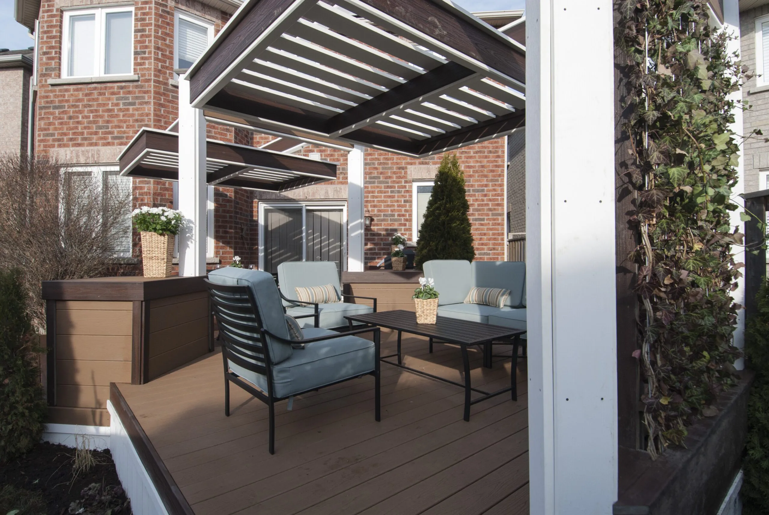 This project proves that even a small yard can become a full-featured outdoor living space. We designed this compact deck to include all the essentials—dining, lounging, privacy, and storage—without feeling crowded or overbuilt. A custom pergola defines the dining area while adding overhead protection. Built-in planters and vertical privacy panels give the space some breathing room and help block sightlines from surrounding homes. Every piece of furniture and every inch of the layout was chosen with space in mind. It’s a great example of how thoughtful design can make a tiny yard feel like a full-sized escape.