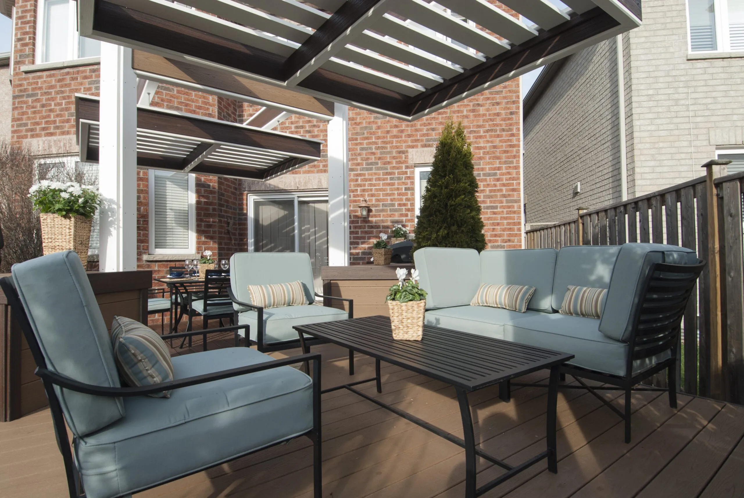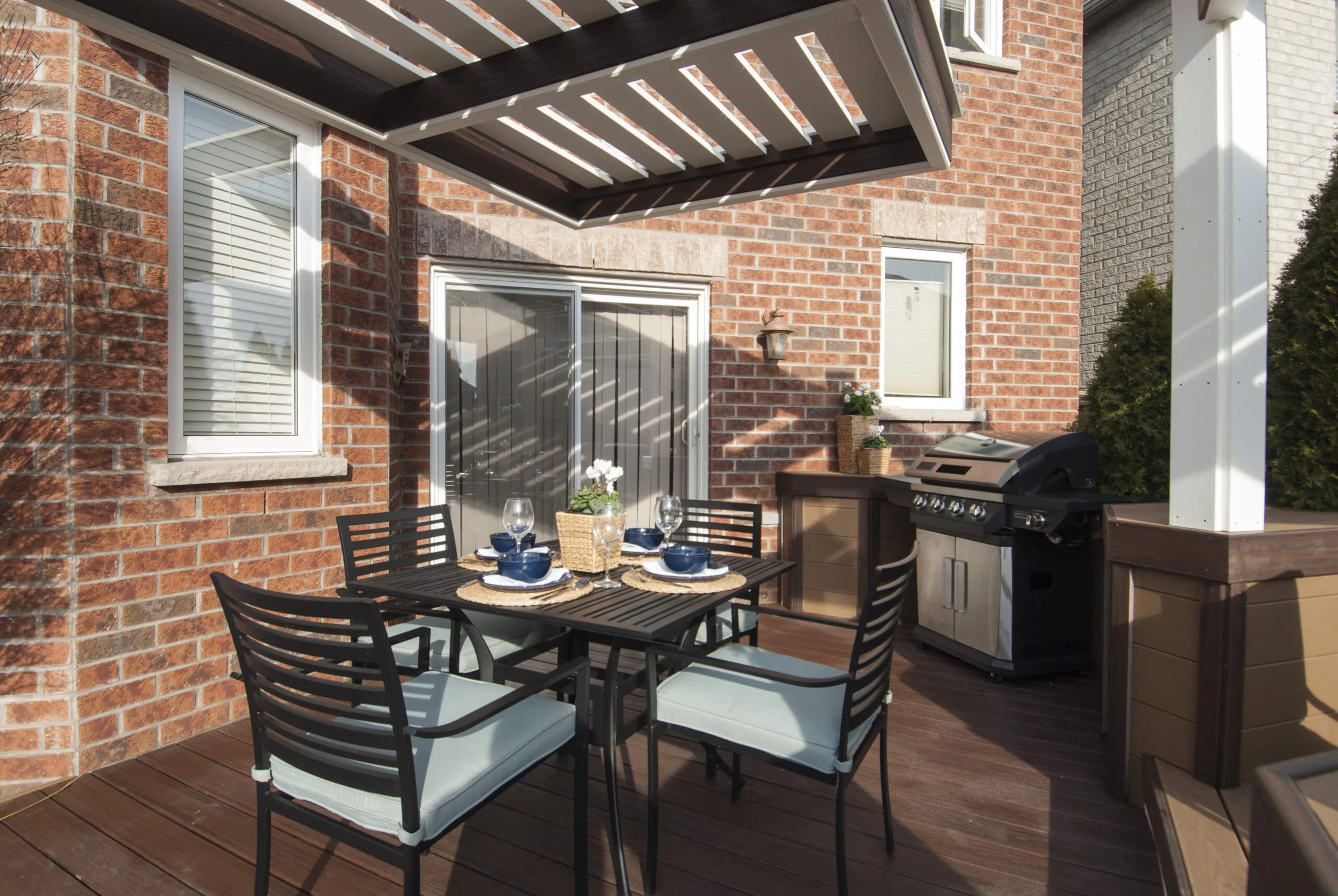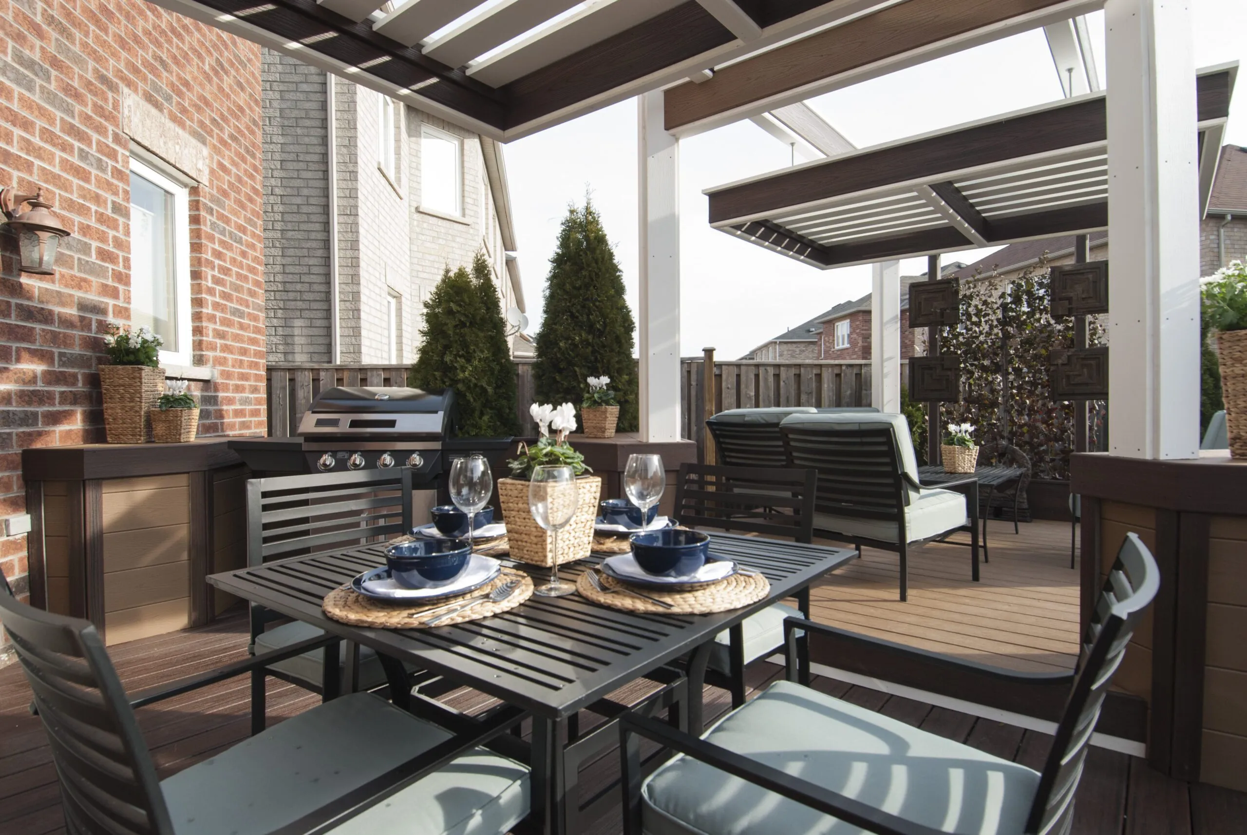 This project proves that even a small yard can become a full-featured outdoor living space. We designed this compact deck to include all the essentials—dining, lounging, privacy, and storage—without feeling crowded or overbuilt. A custom pergola defines the dining area while adding overhead protection. Built-in planters and vertical privacy panels give the space some breathing room and help block sightlines from surrounding homes. Every piece of furniture and every inch of the layout was chosen with space in mind. It’s a great example of how thoughtful design can make a tiny yard feel like a full-sized escape.