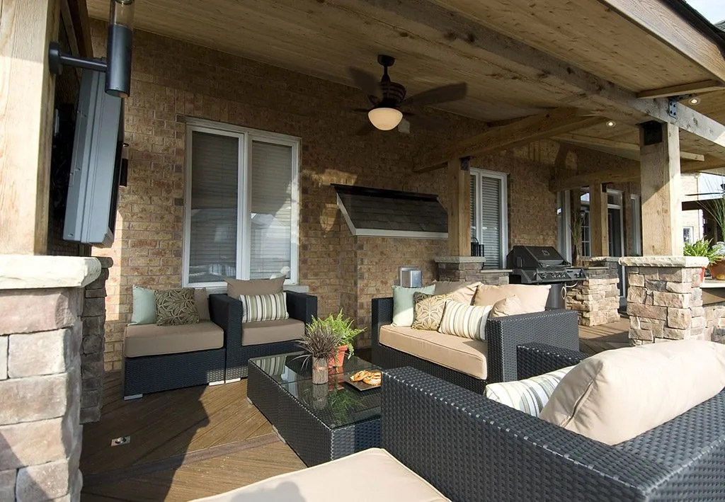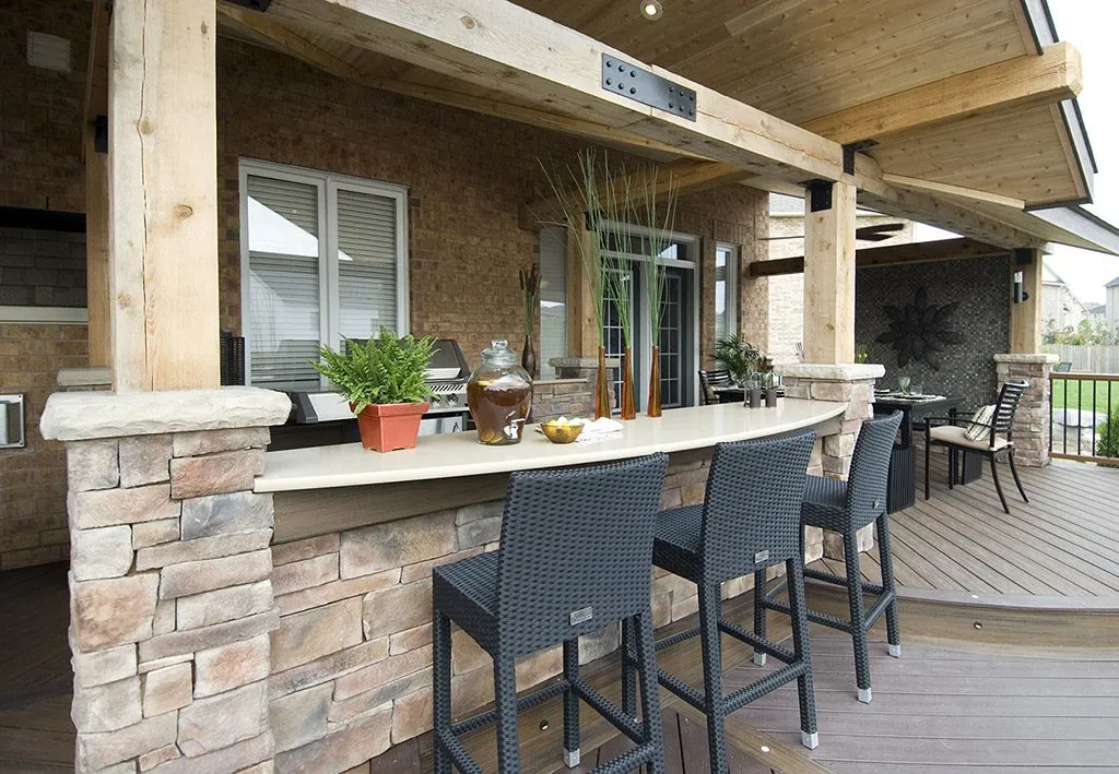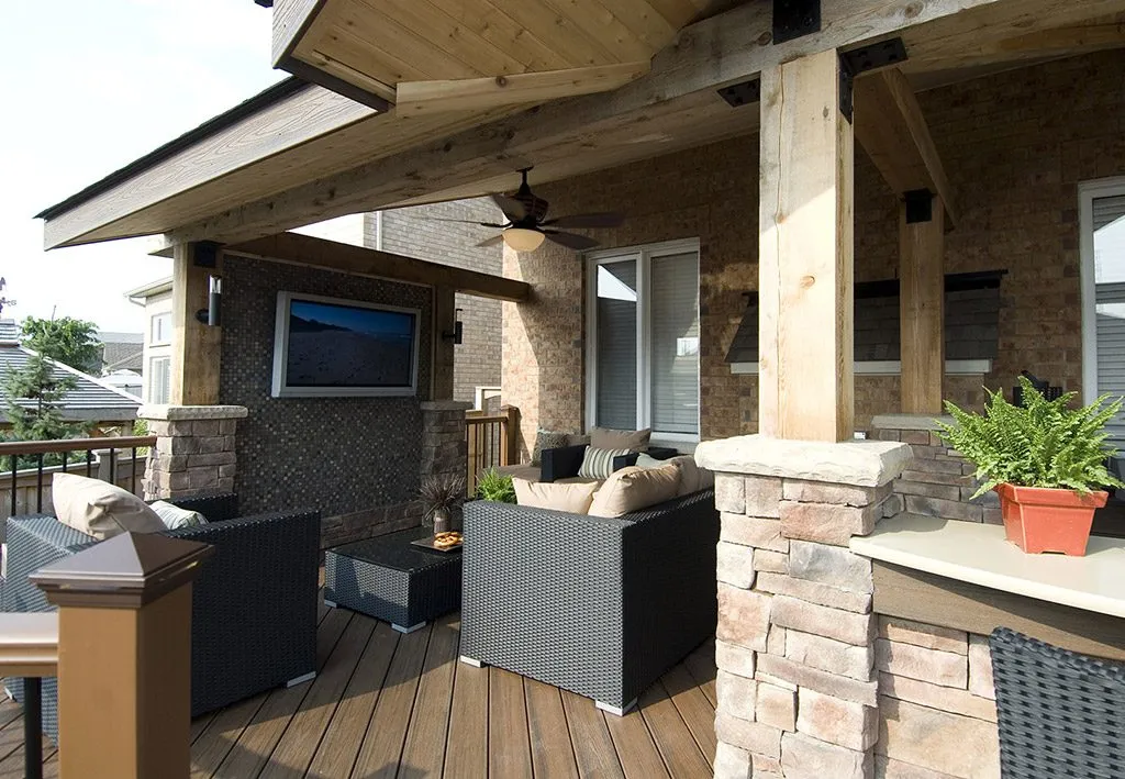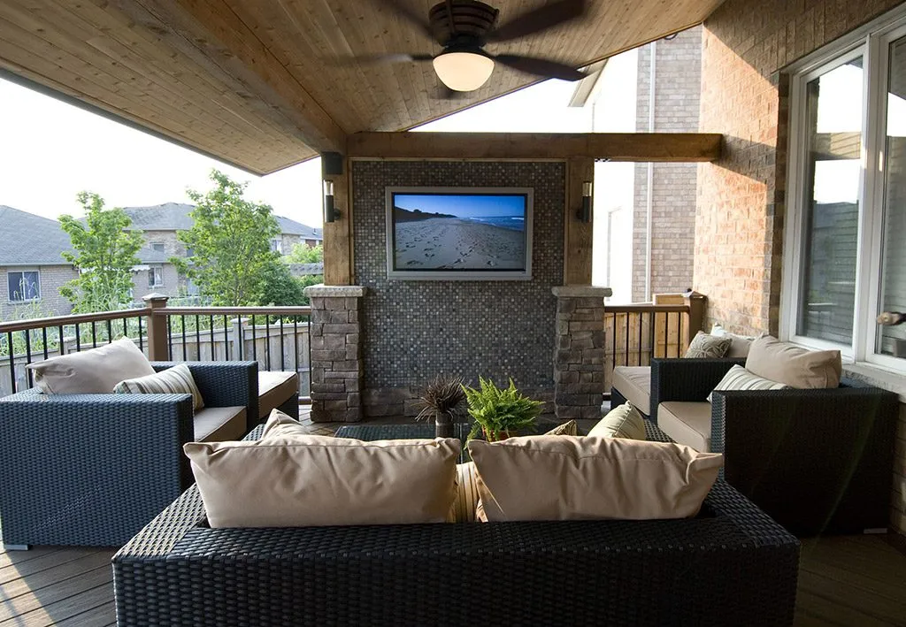 "The TV Deck" is an innovative outdoor space that we designed to cater to both relaxation and entertainment. The focal point of the project is a sleek, built-in TV area, making it perfect for watching sports games, movies, or family gatherings. We integrated a comfortable seating arrangement with stylish stone accents that match the home’s overall aesthetic. The deck's design blends functional spaces for lounging with custom touches, such as the stunning stone wall, creating an inviting atmosphere. Our team ensured the layout maximized comfort and practicality, with easy access to the TV setup and ample space for hosting guests. This deck truly redefines outdoor living by turning the backyard into an extension of the home's entertainment space.