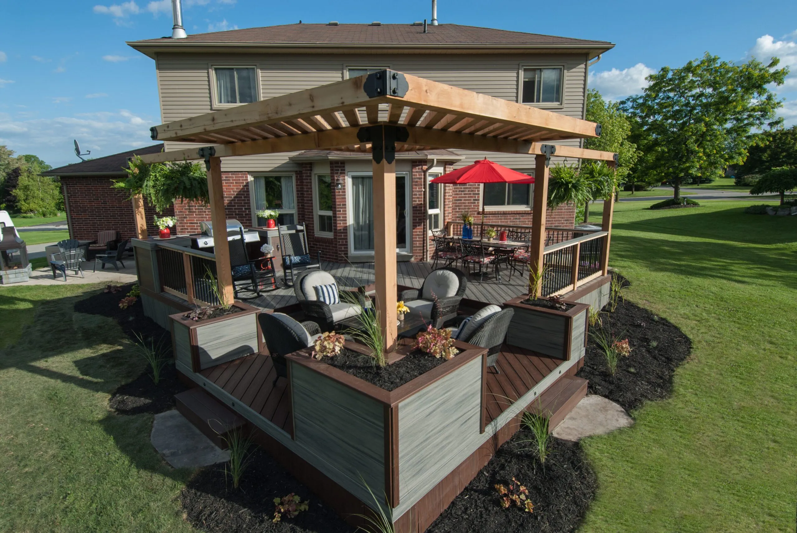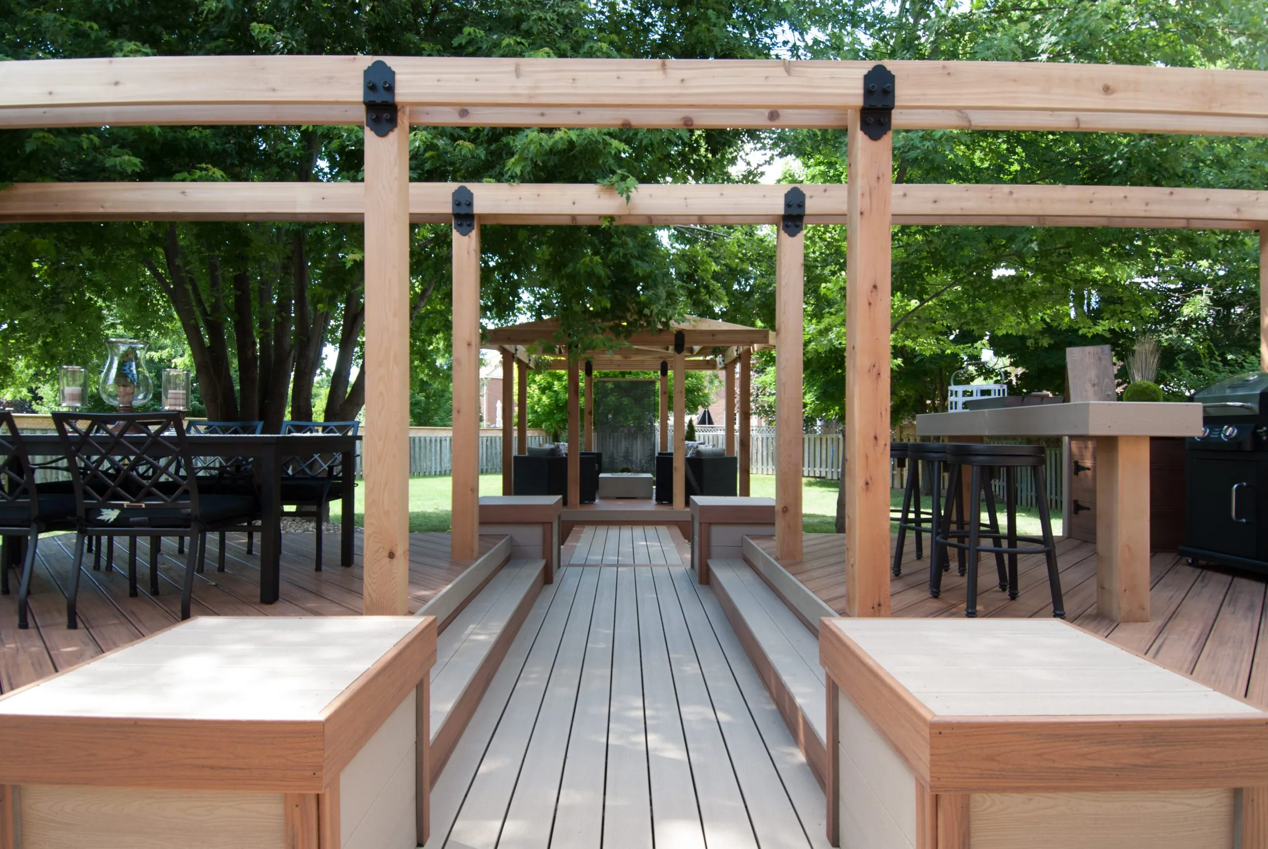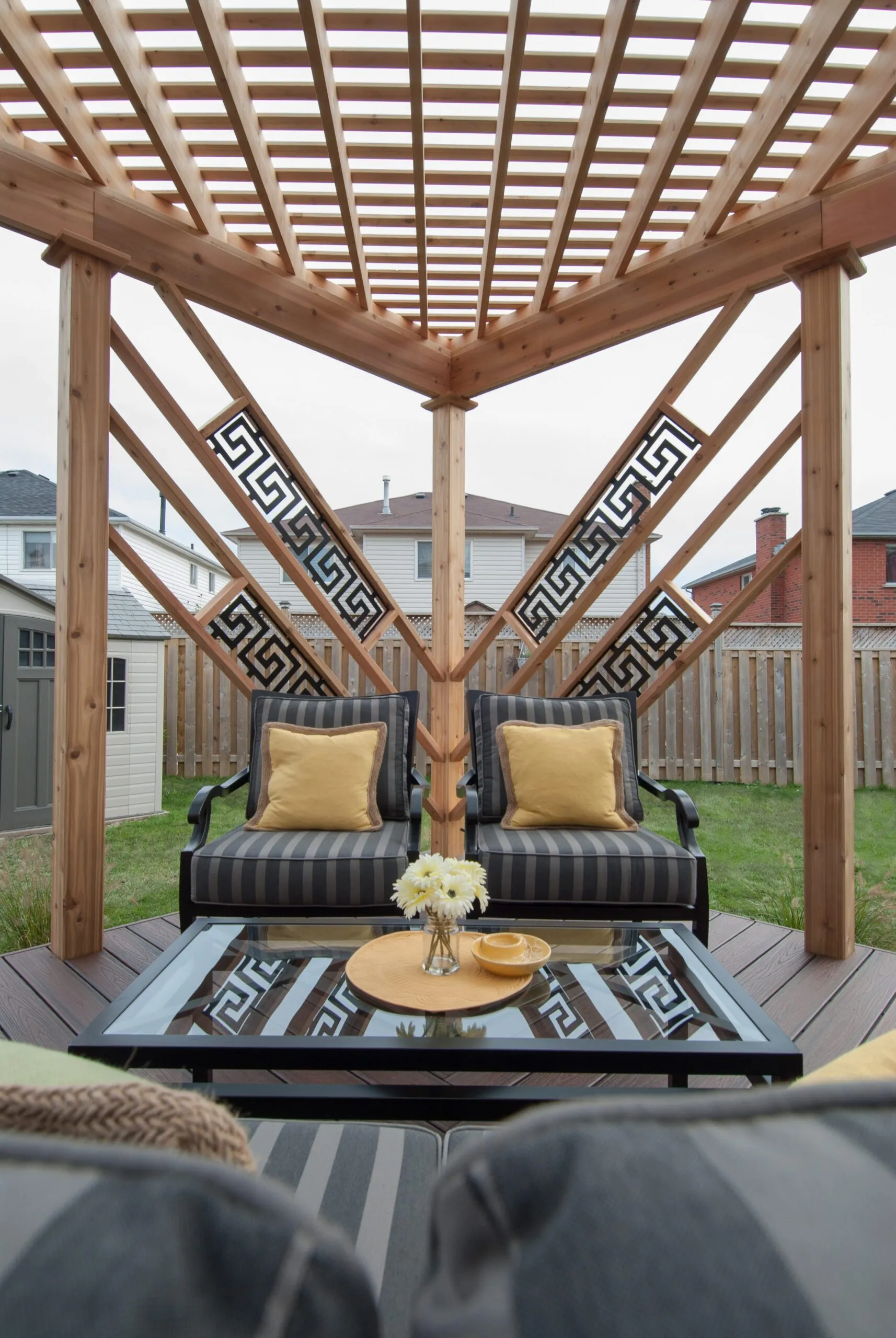 This angled backyard deck makes a strong visual statement with a pergola installed at a 45-degree angle to the home. Features include built-in bench seating, privacy screens, and a spacious dining area for entertaining.