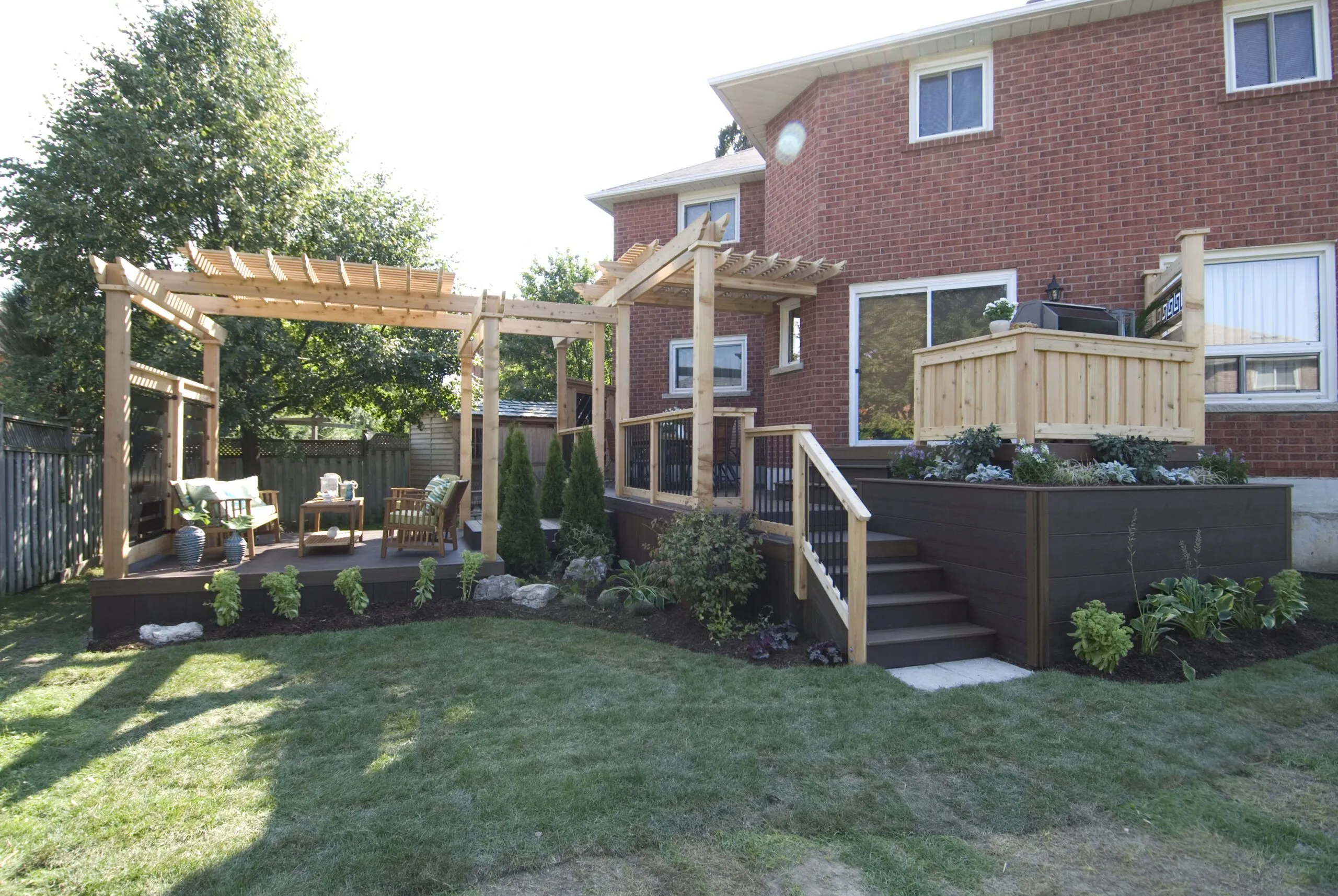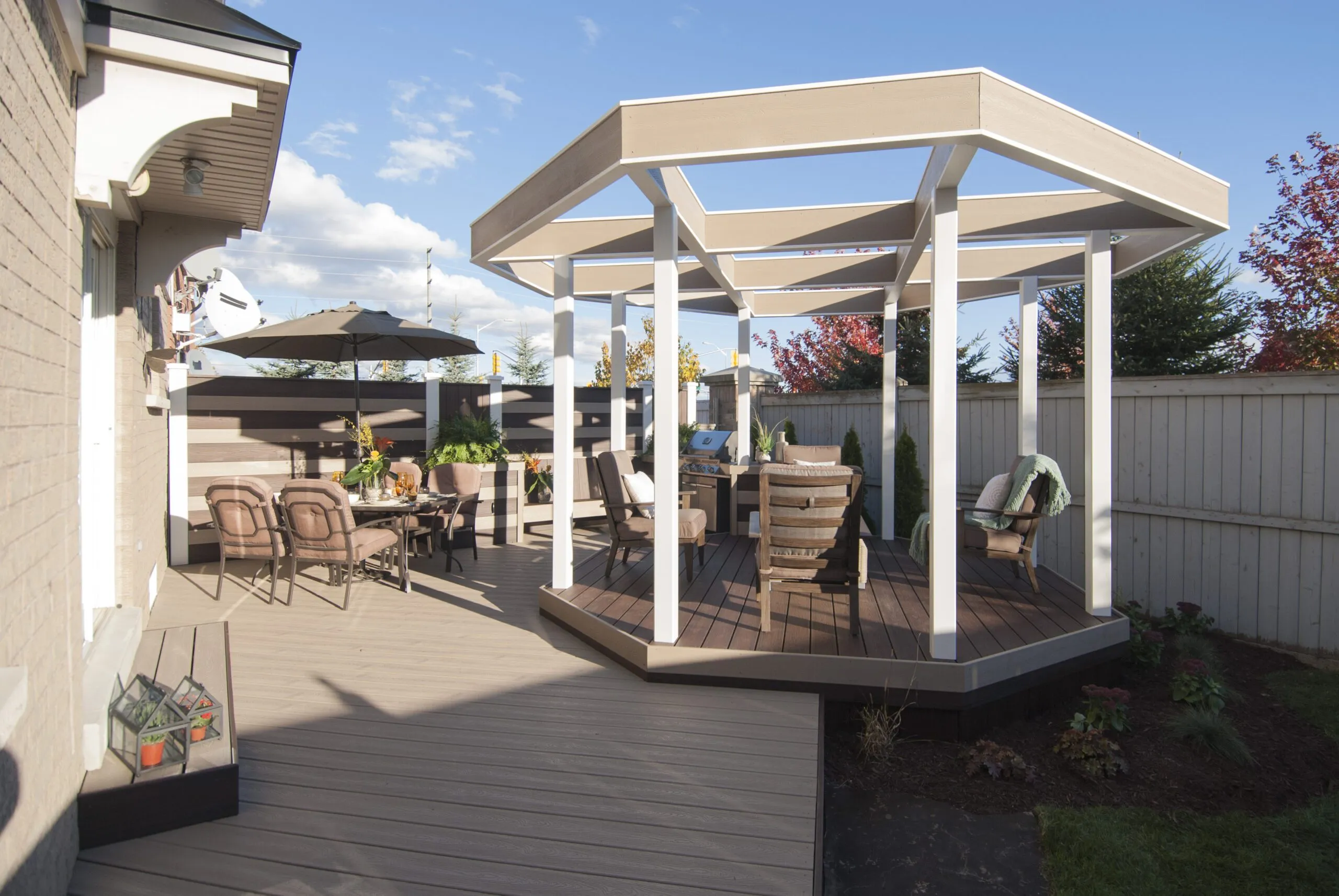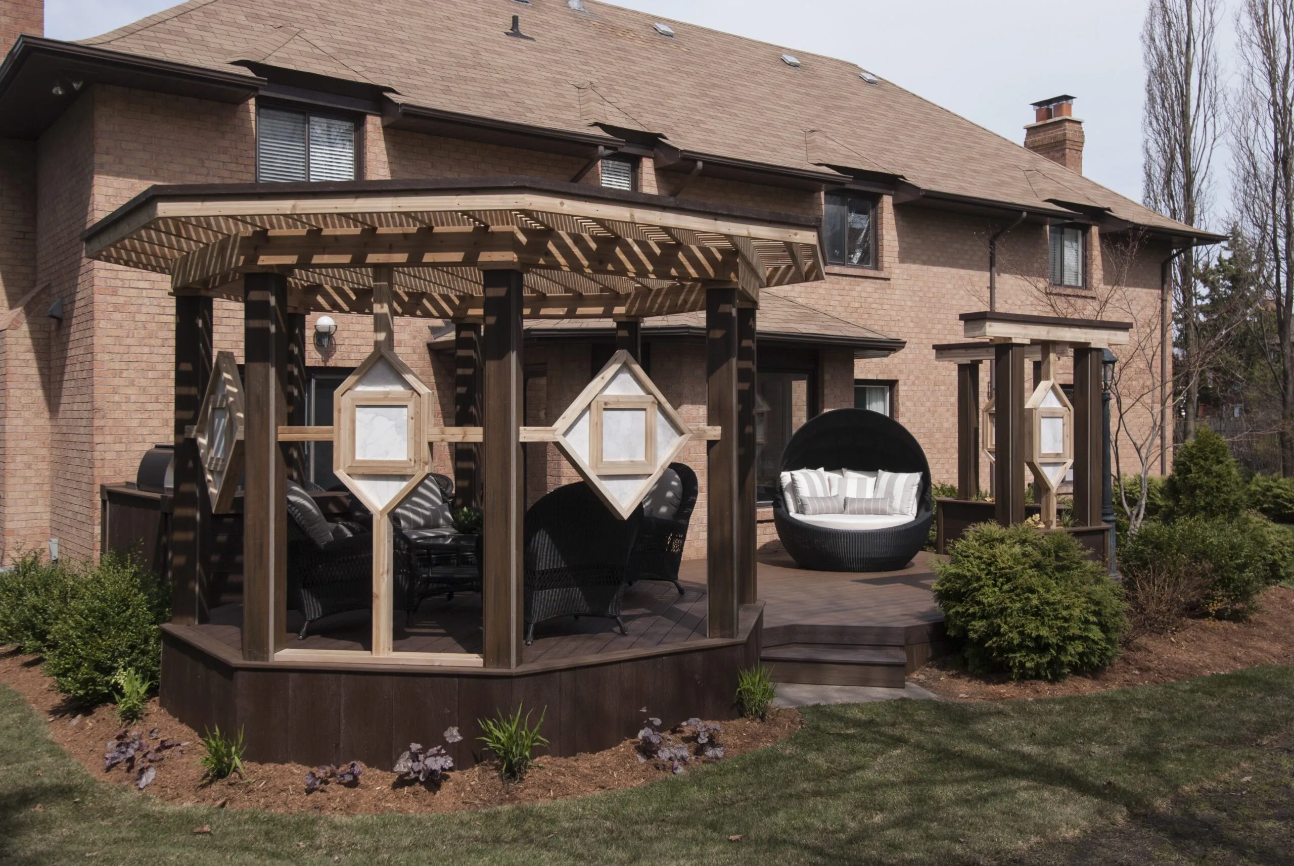 This angled backyard deck makes a strong visual statement with a pergola installed at a 45-degree angle to the home. Features include built-in bench seating, privacy screens, and a spacious dining area for entertaining.