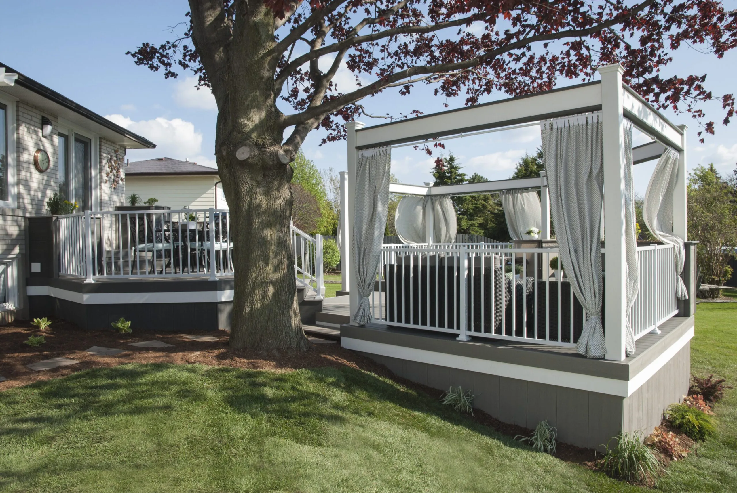 A backyard deck built for laid-back comfort, featuring a swinging bench under a custom pergola. Includes dining space, a grill zone, and tiered steps that blend into the surrounding landscape.