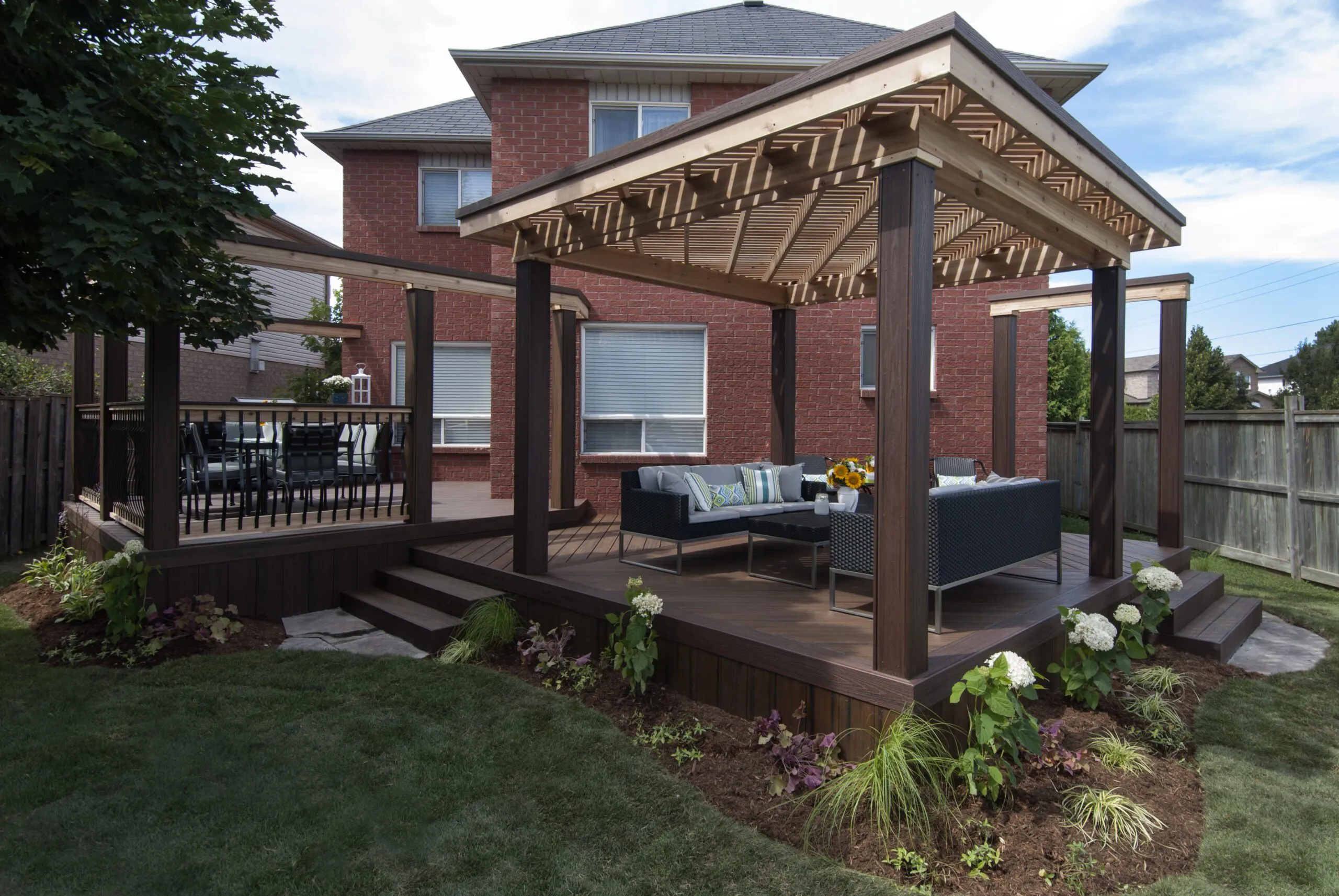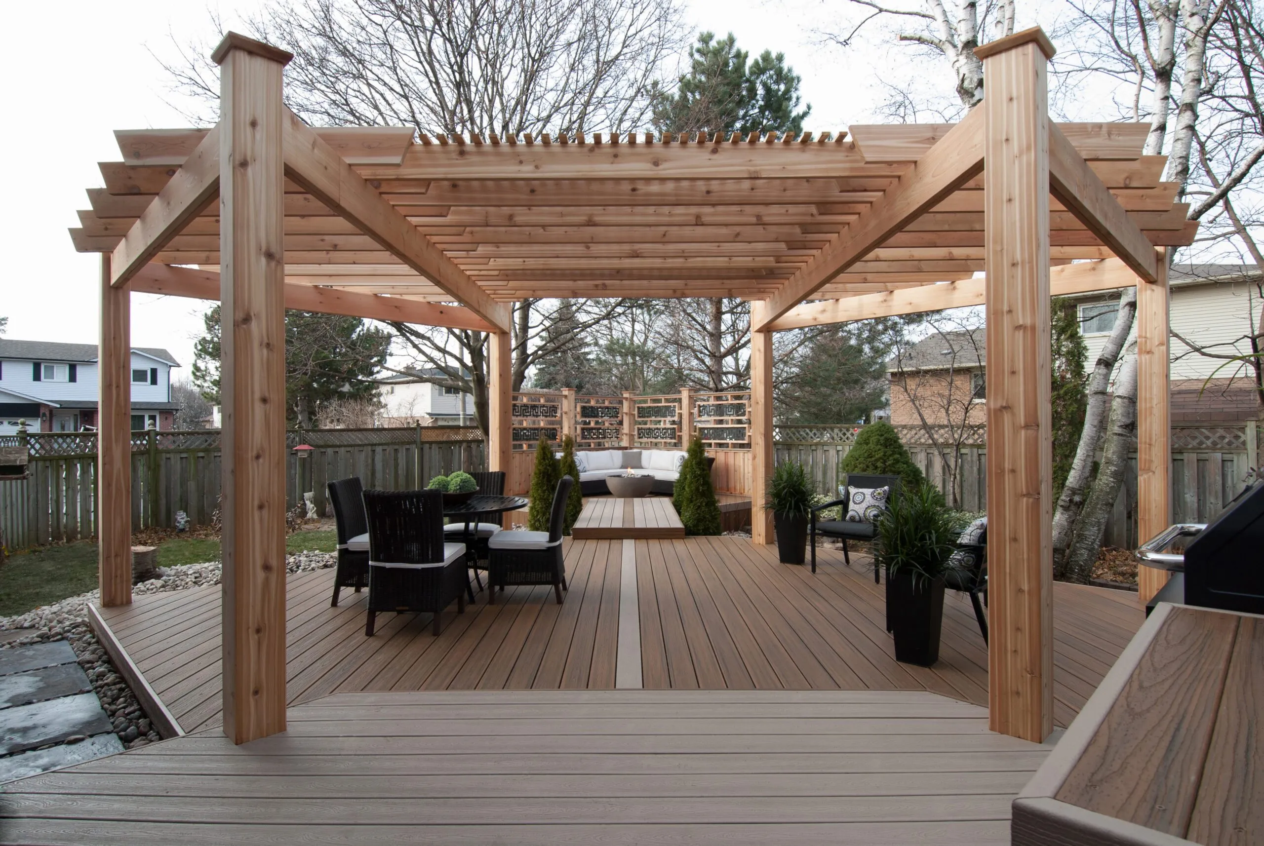 An elegant backyard deck centered around a large architectural pergola structure. Multiple seating zones and soft transitions create a space made for connection and reflection.