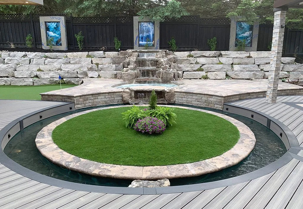 A stunning backyard transformation featuring a unique waterfall moat that runs around the entire deck, creating an oasis-like feel. Custom stonework surrounds a tranquil water feature, complemented by comfortable seating and shaded spaces for relaxation.