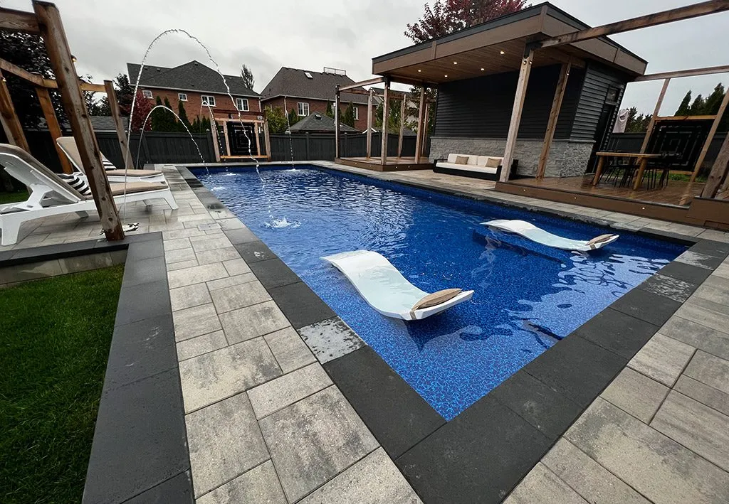The Brooklin Pool Oasis is a stunning backyard transformation featuring a modern pool with custom landscaping. The design includes elegant, clean lines and seamless integration with a dedicated poolside lounging area.