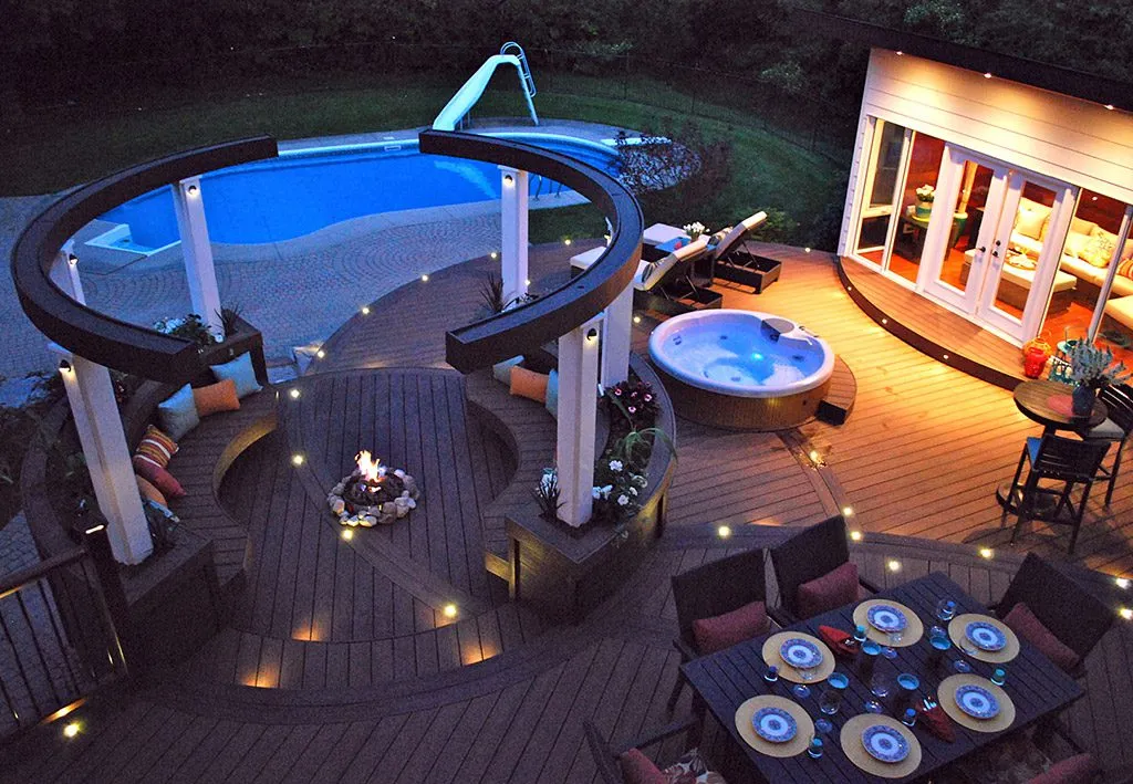 The Round-About Deck is a uniquely designed outdoor space that features a circular layout with stunning panoramic views. The multi-level platform provides various areas for seating and entertaining, while the built-in lighting creates a captivating ambiance for evening enjoyment.
