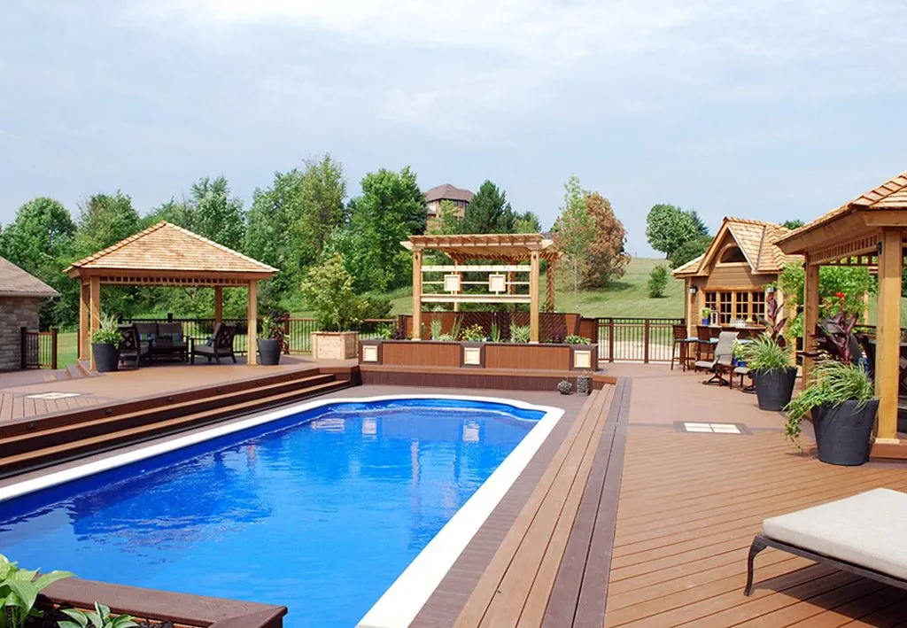 A sprawling multi-zone deck designed to surround a backyard pool with total luxury. Featuring outdoor kitchens, multiple lounge zones, a pergola, and ambient lighting.